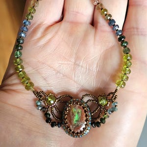 This piece is an EXCEPTIONAL, solid, precious, natural, pear shaped, Ethiopian Opal pendant. The beads are Peridot, multicolored Sapphires, Sunstone, and Red Spinel.