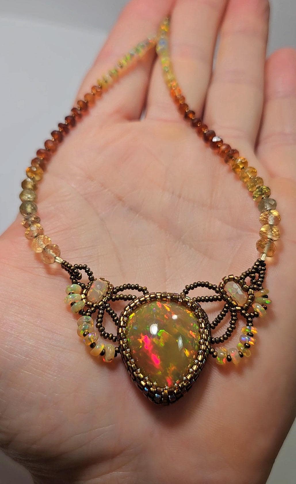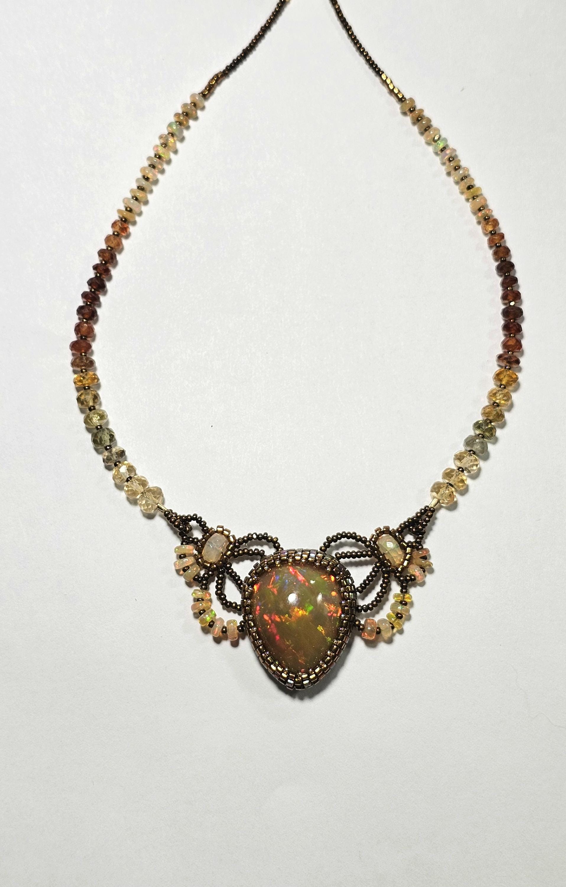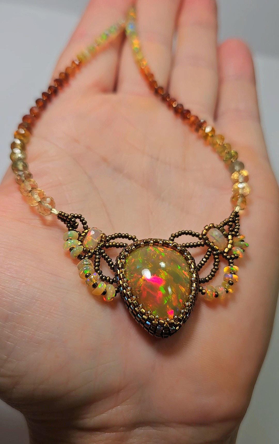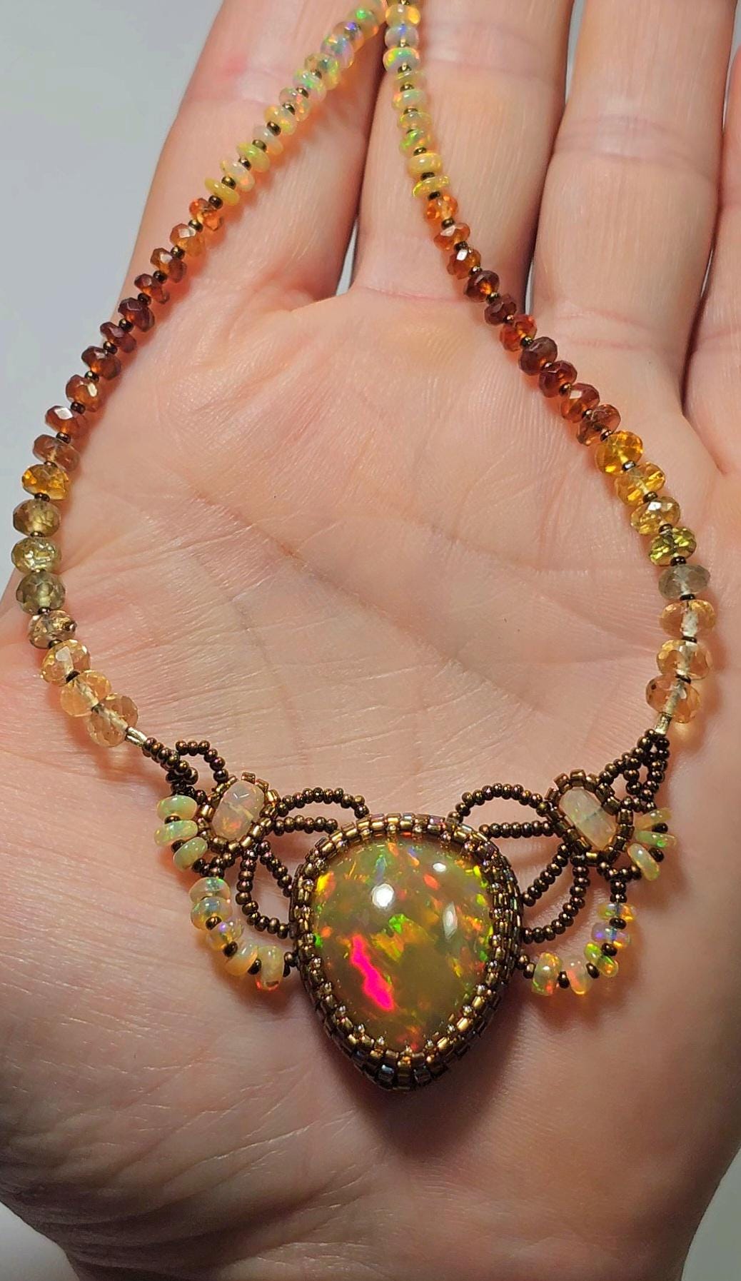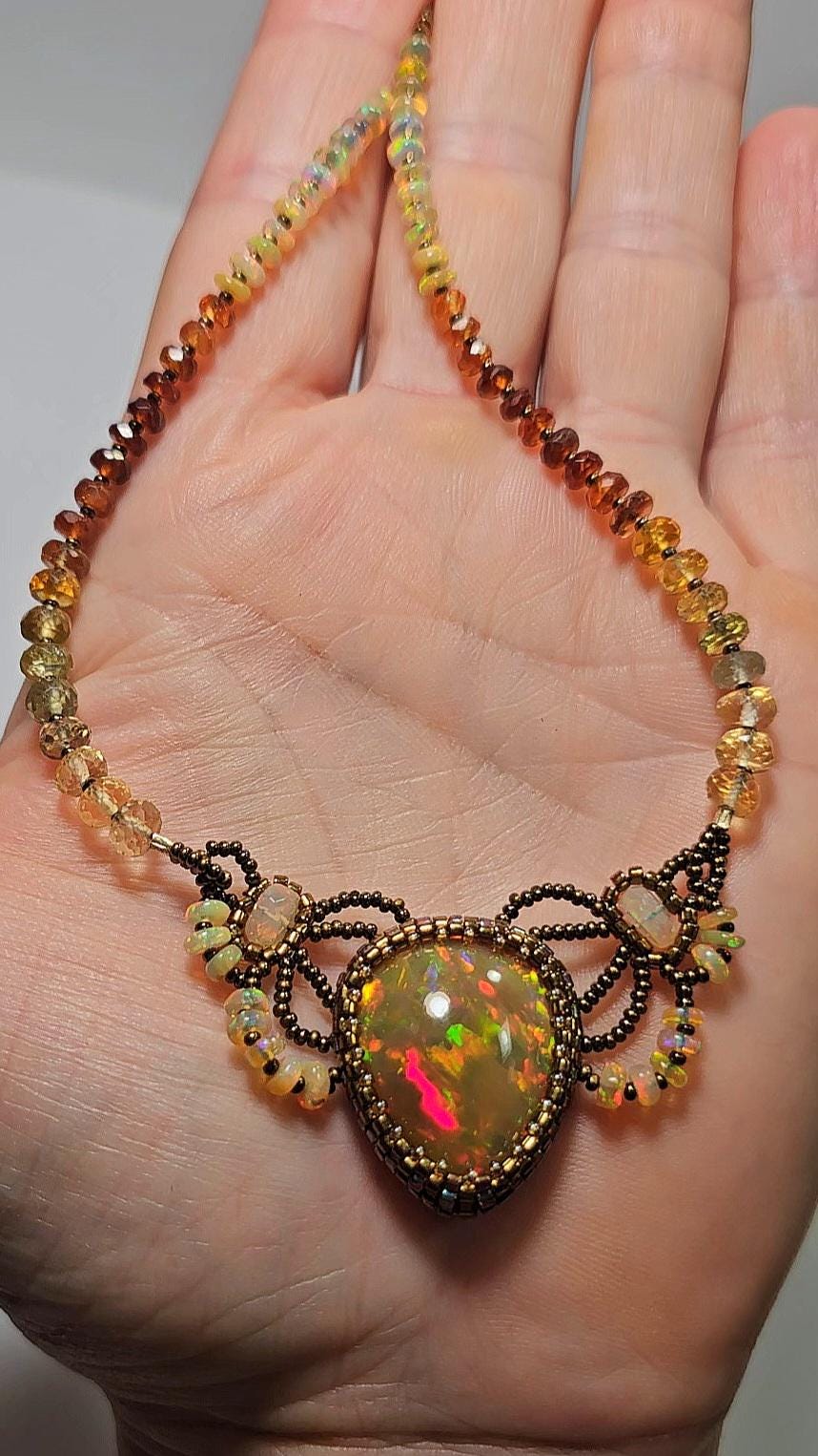 This piece is an EXCEPTIONAL, solid, precious, natural, pear shaped, Ethiopian Opal pendant. The gemstone beads are Citrine, multicolored Sapphires, Hessonite, and Opal.