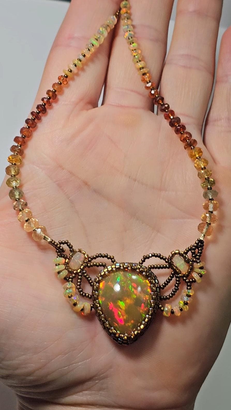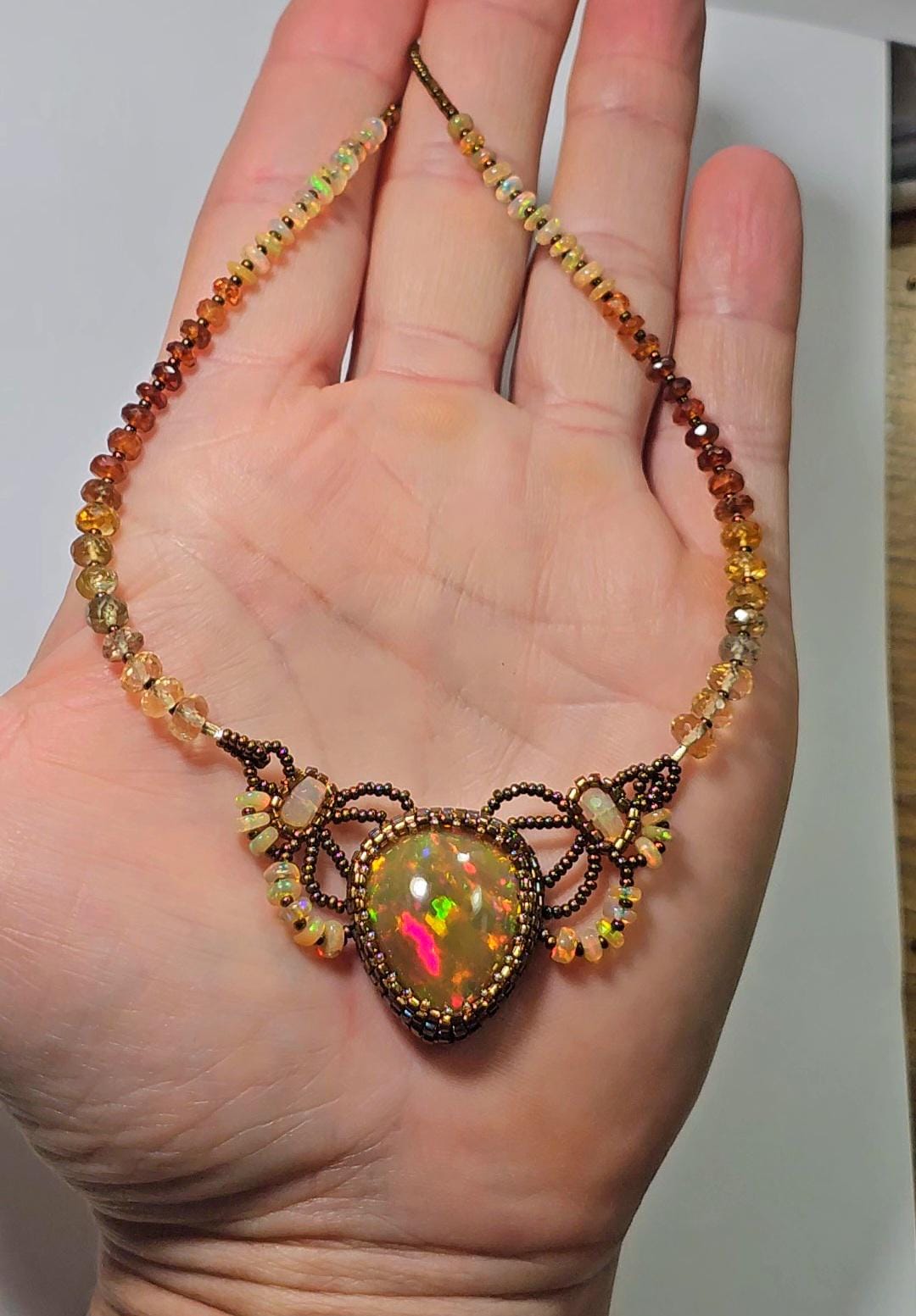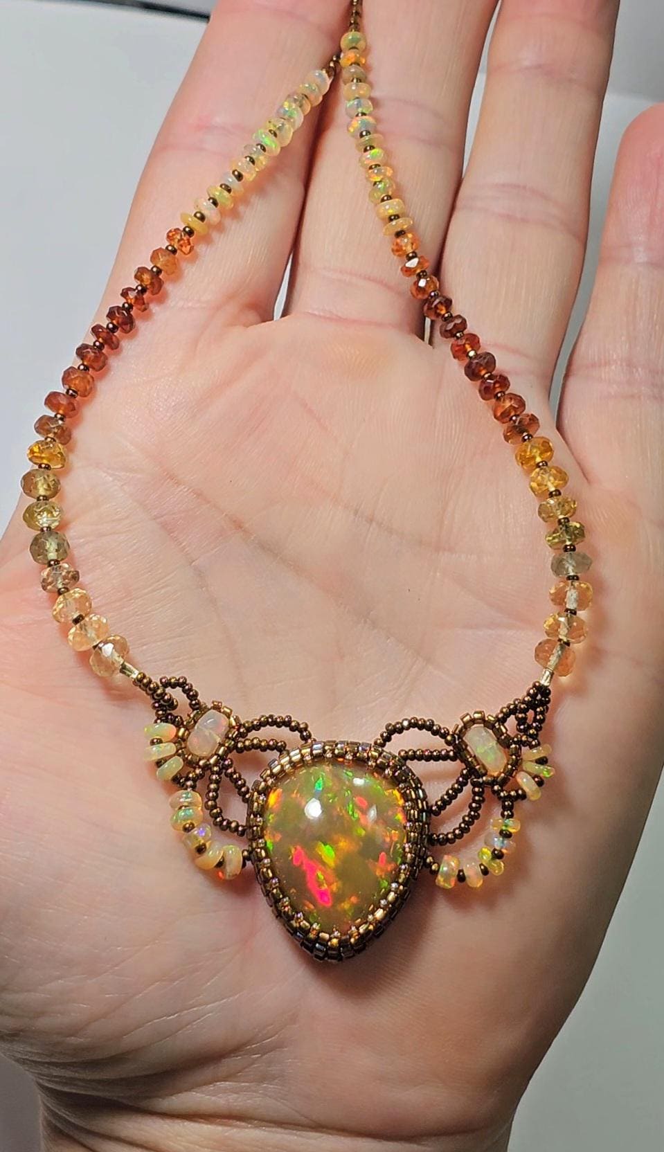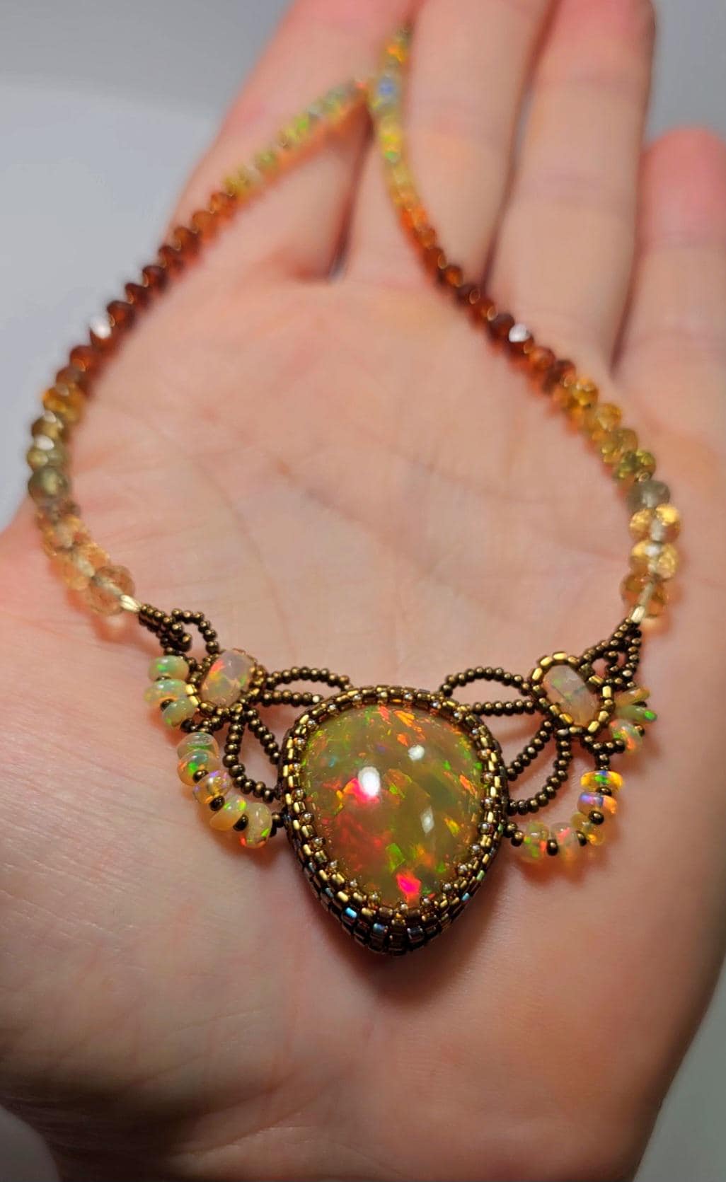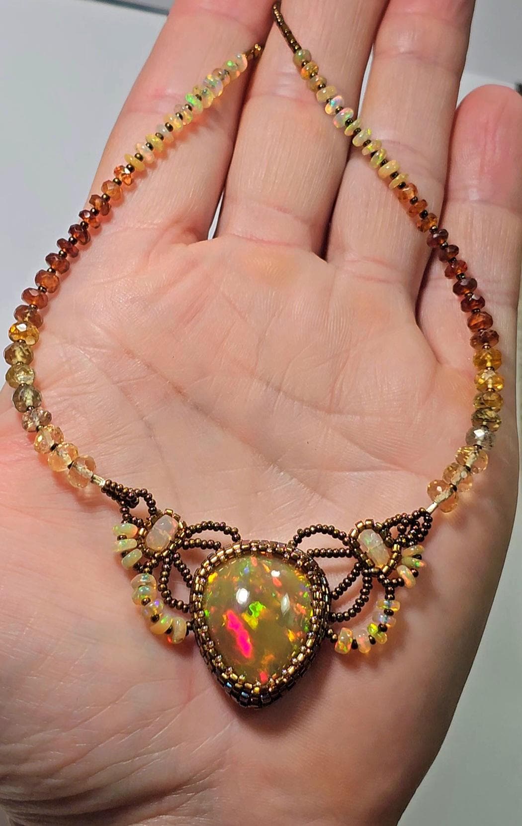 This piece is an EXCEPTIONAL, solid, precious, natural, pear shaped, Ethiopian Opal pendant. The gemstone beads are Citrine, multicolored Sapphires, Hessonite, and Opal.
