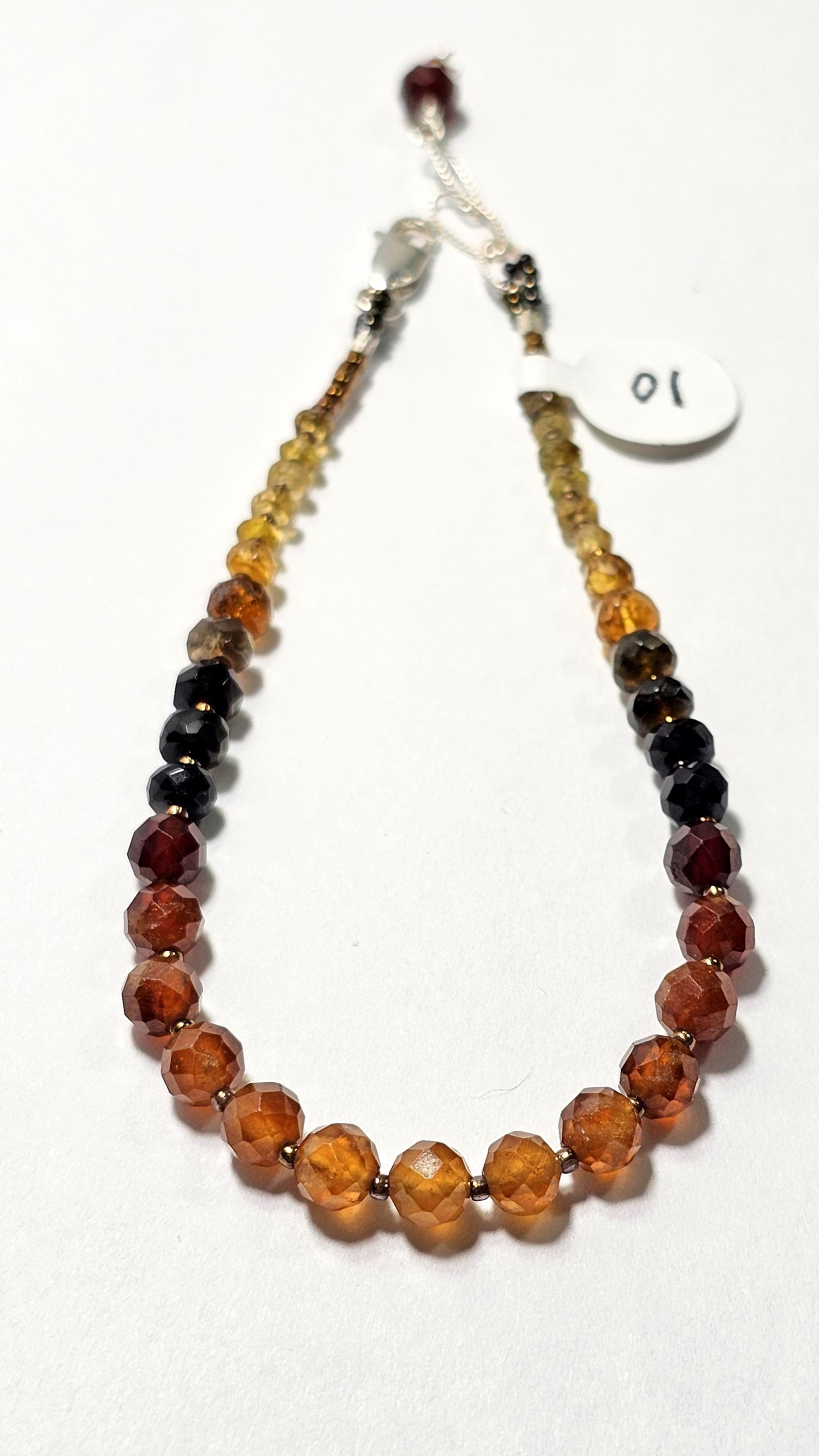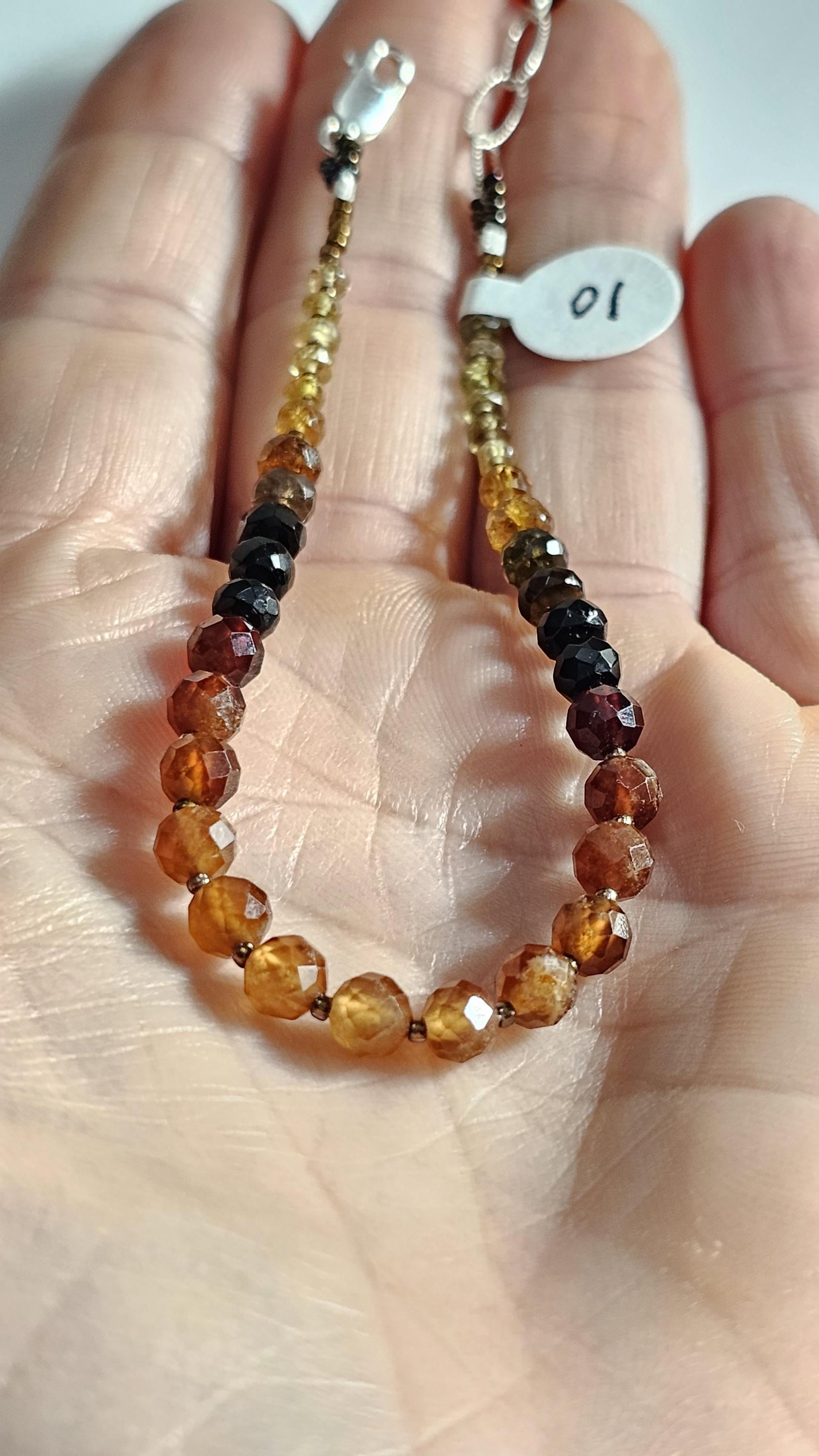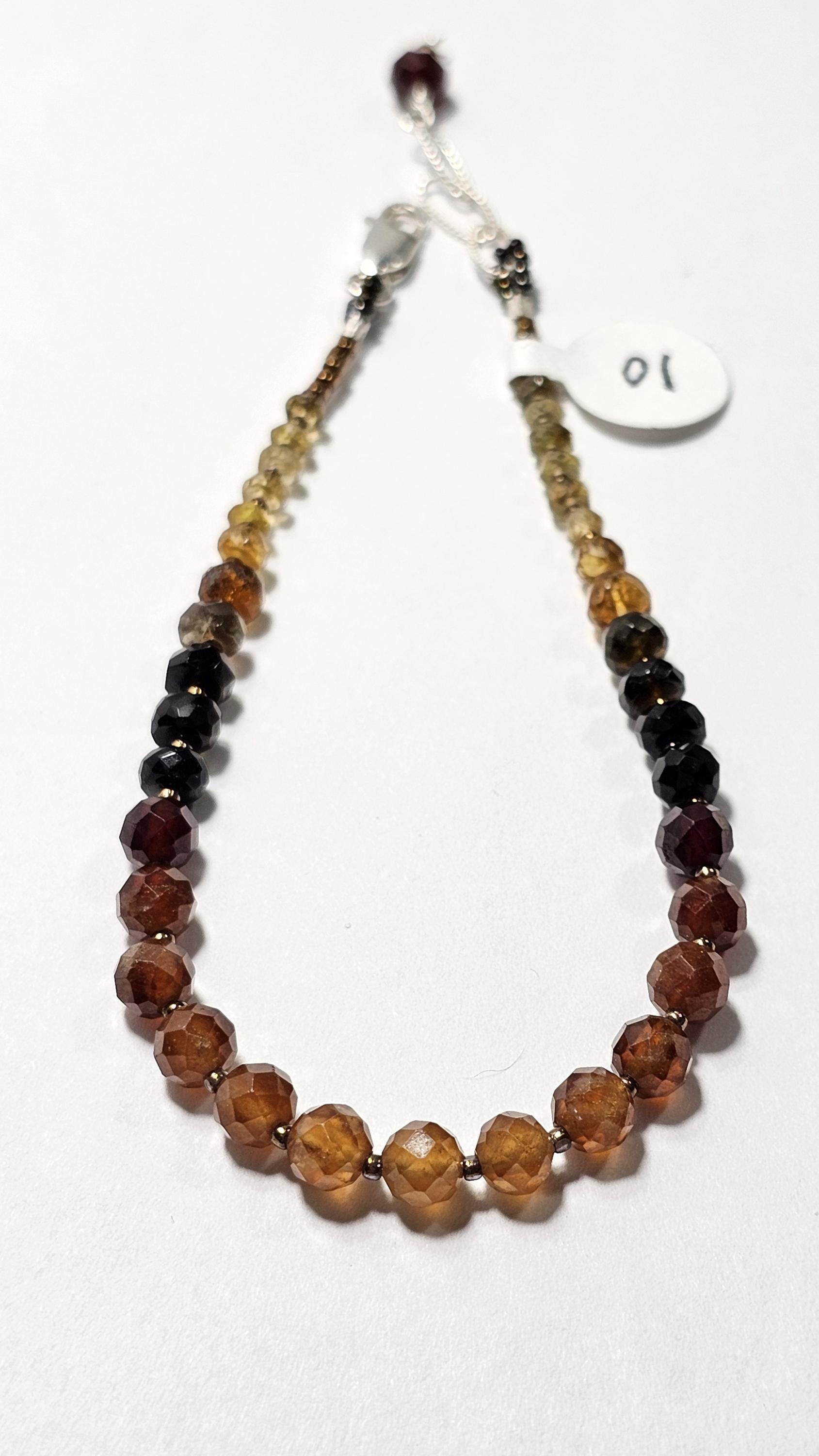 This gemstone bead bracelet hhas shaded Hessonite Garnet, high quality green-brown Tourmaline, Sapphire.