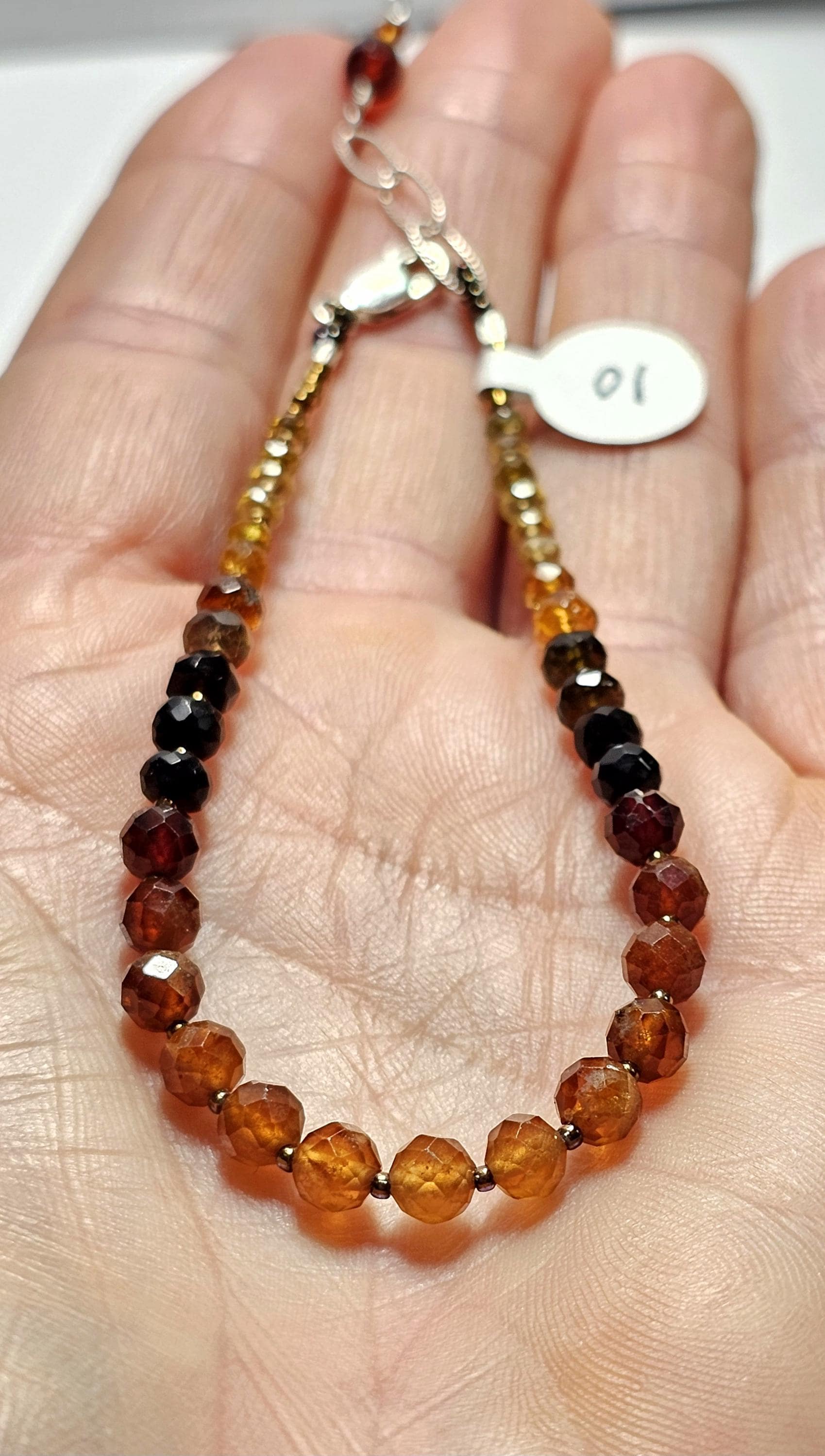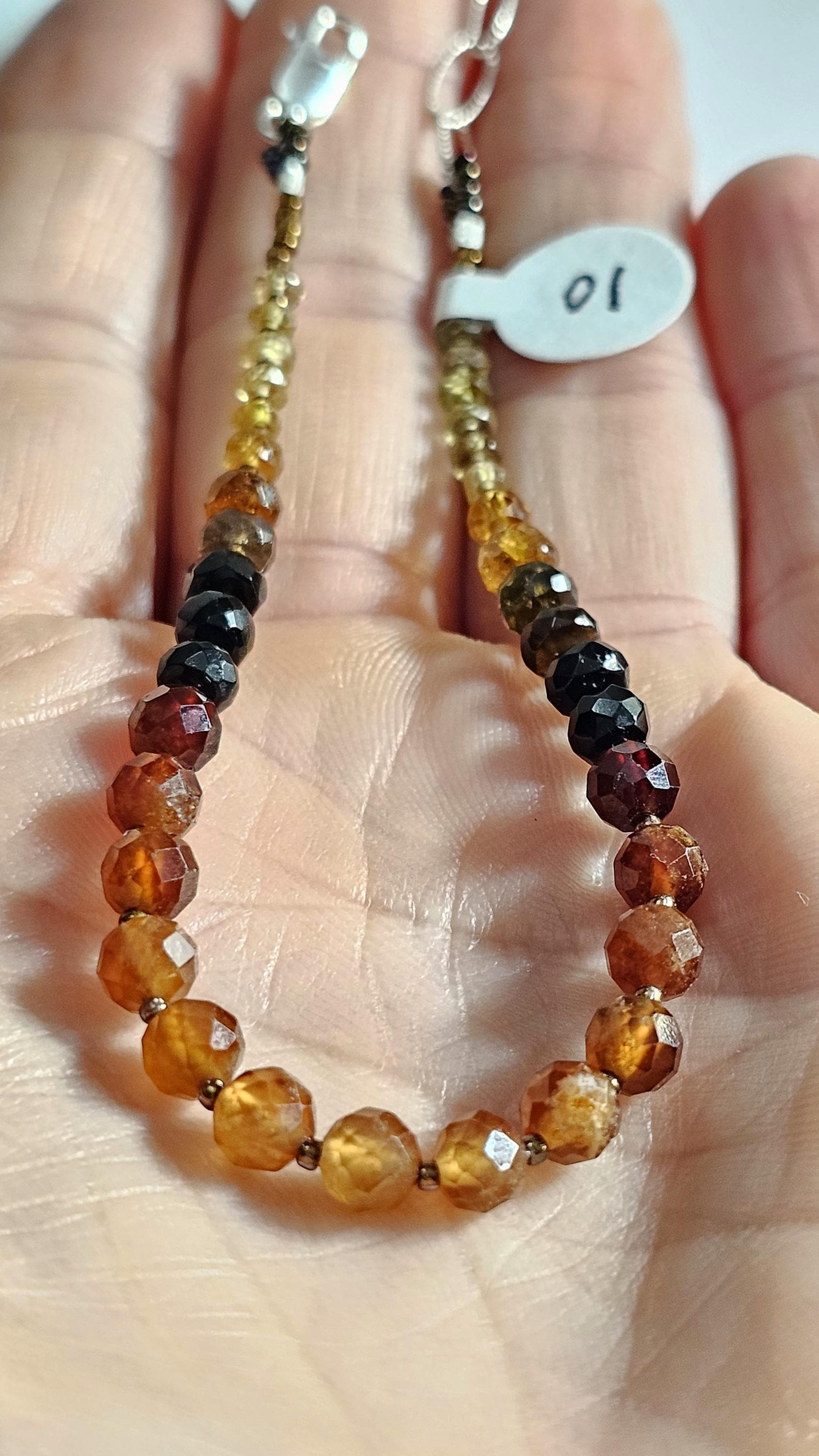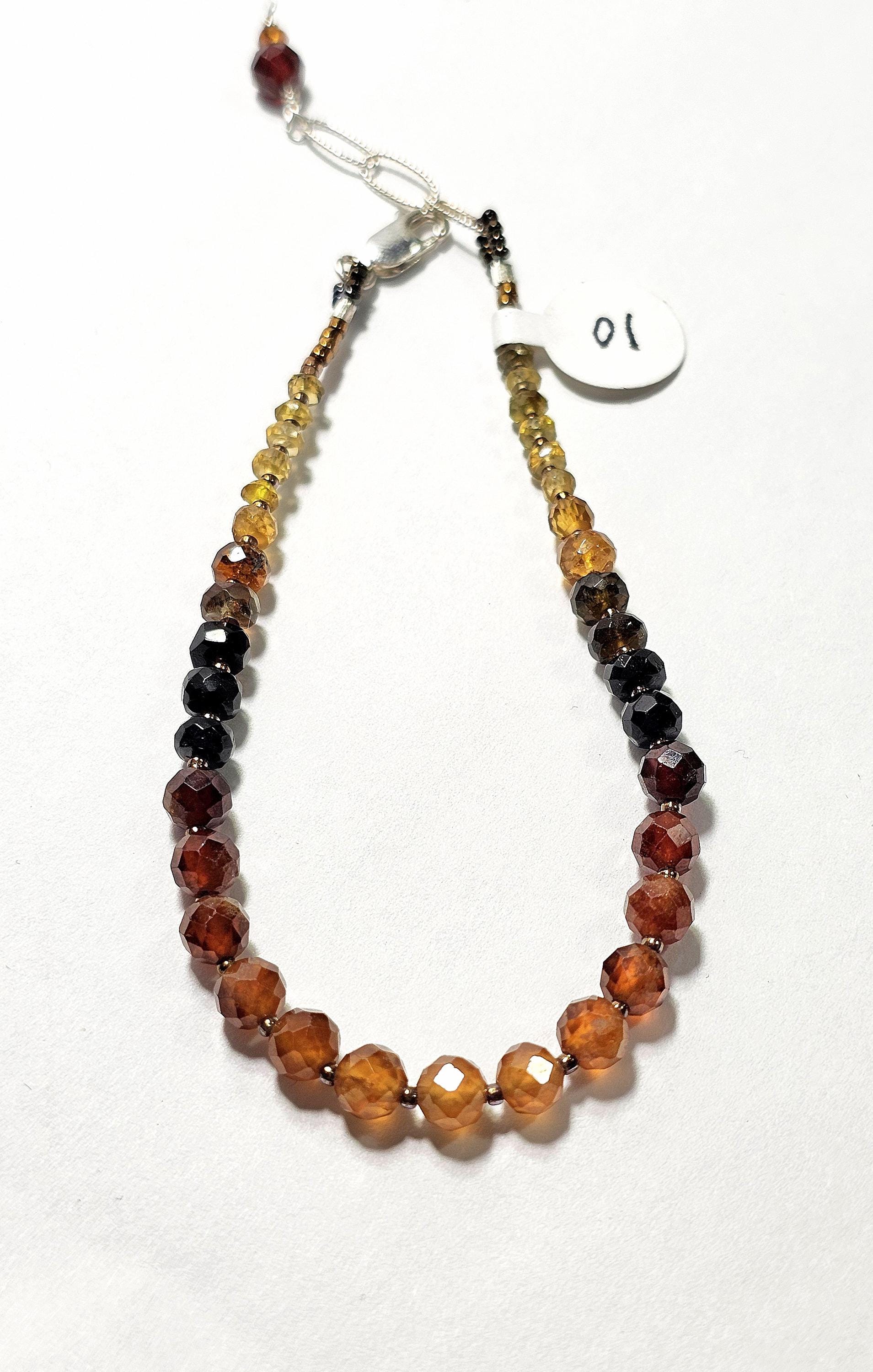 This gemstone bead bracelet hhas shaded Hessonite Garnet, high quality green-brown Tourmaline, Sapphire.
