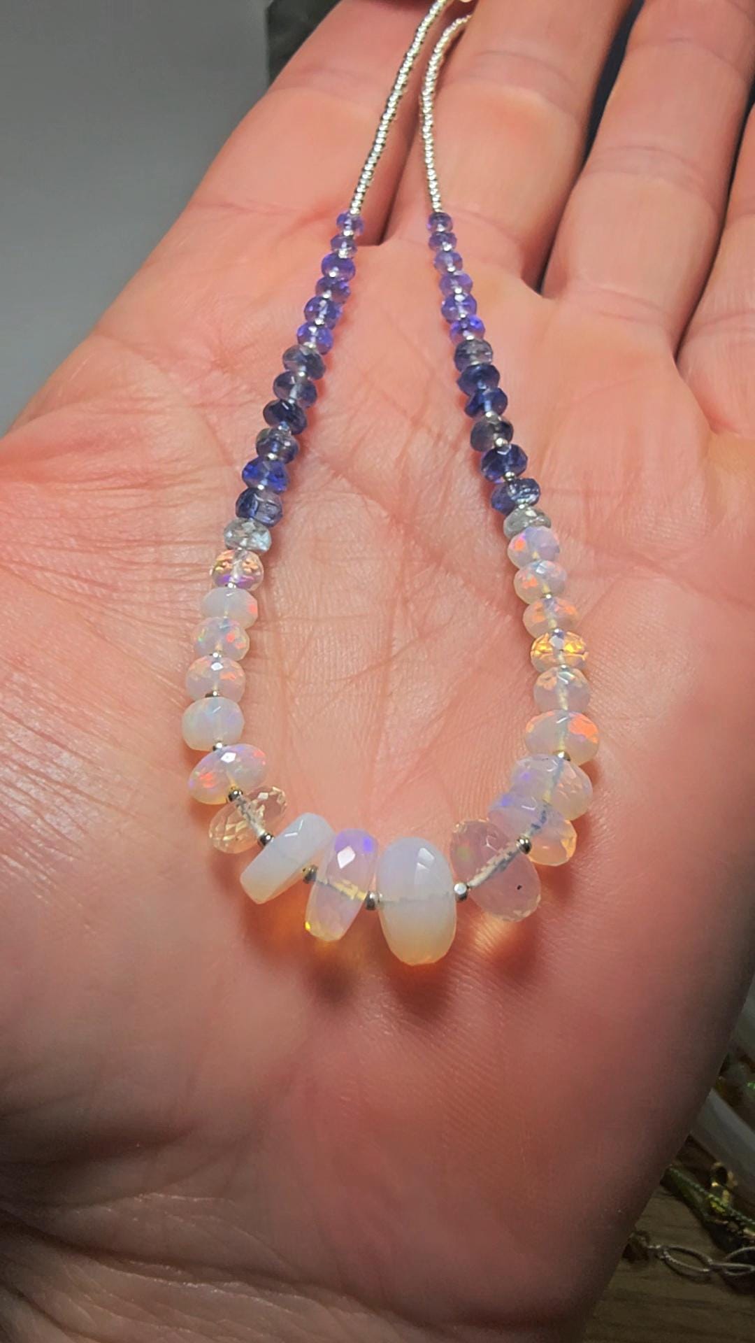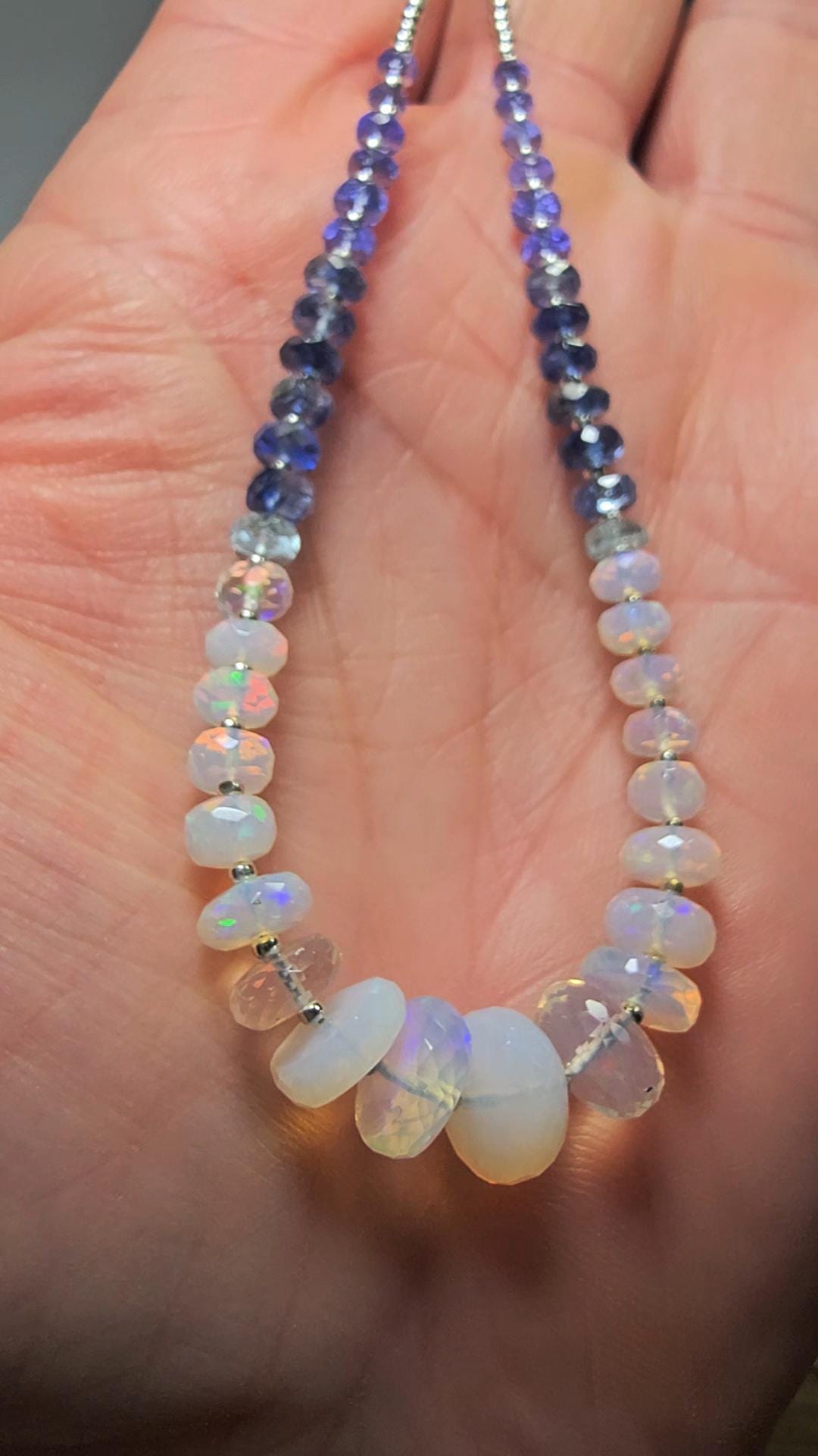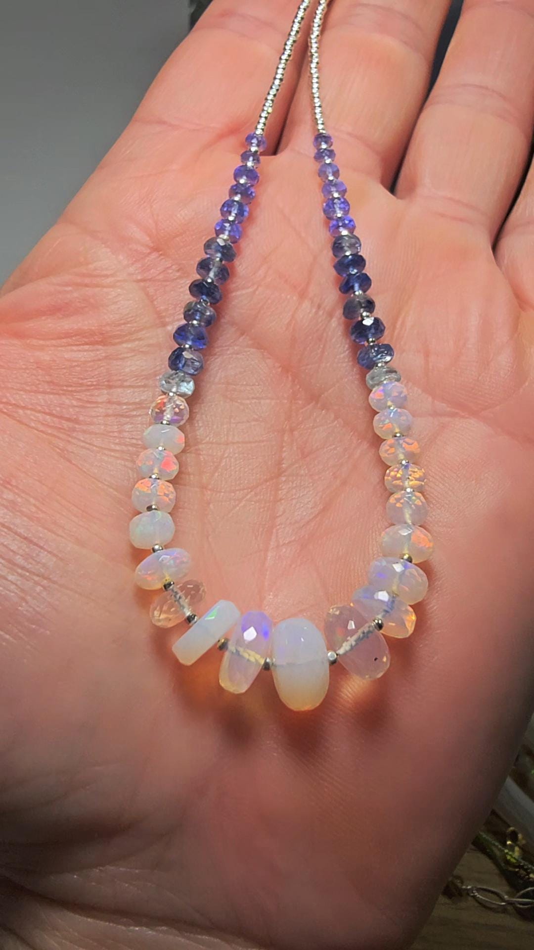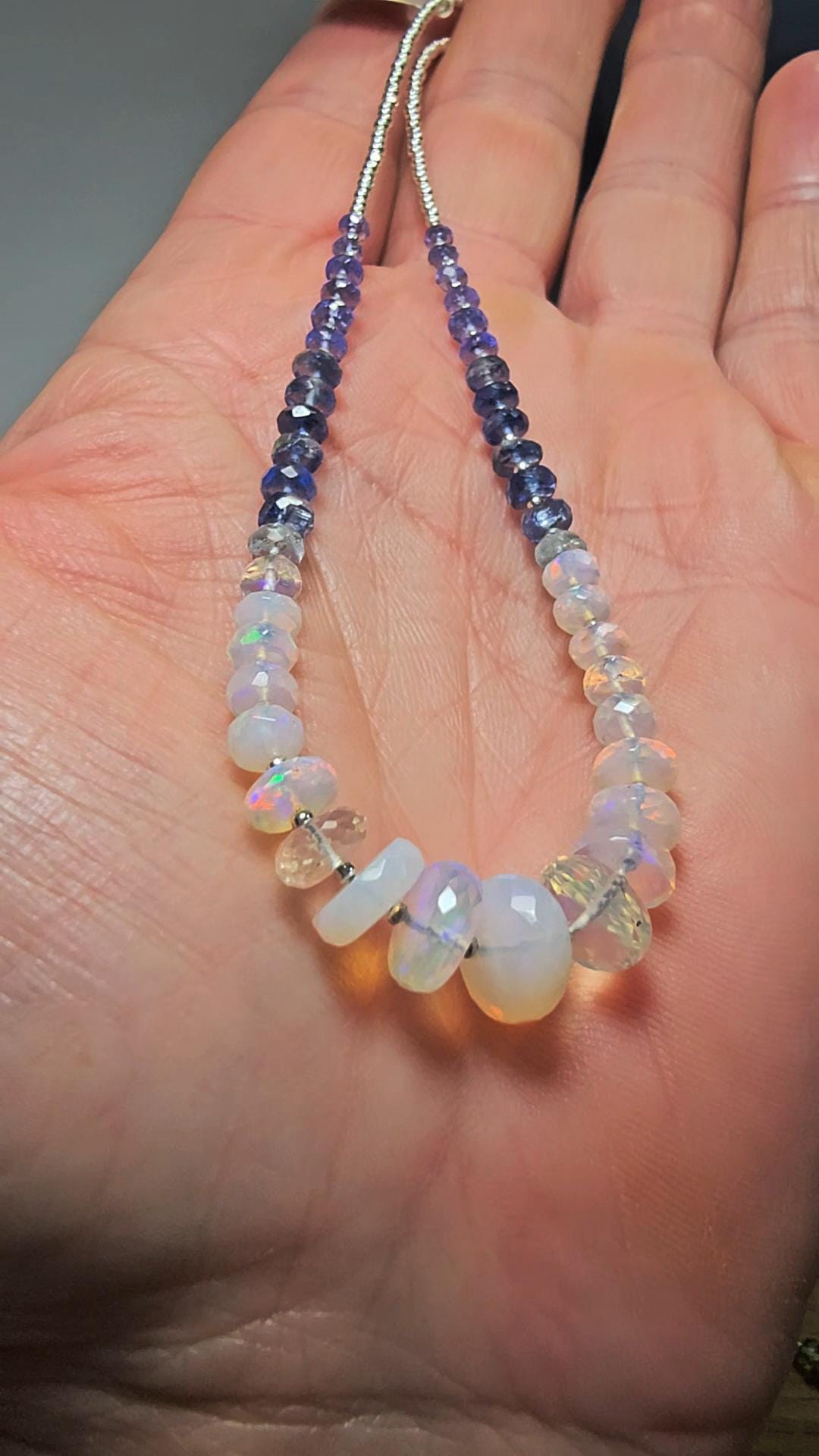 Beaded Necklace: Faceted, Graduated Ethiopian Opal, Kyanite, Iolite, Tanzanite Gemstone Beads