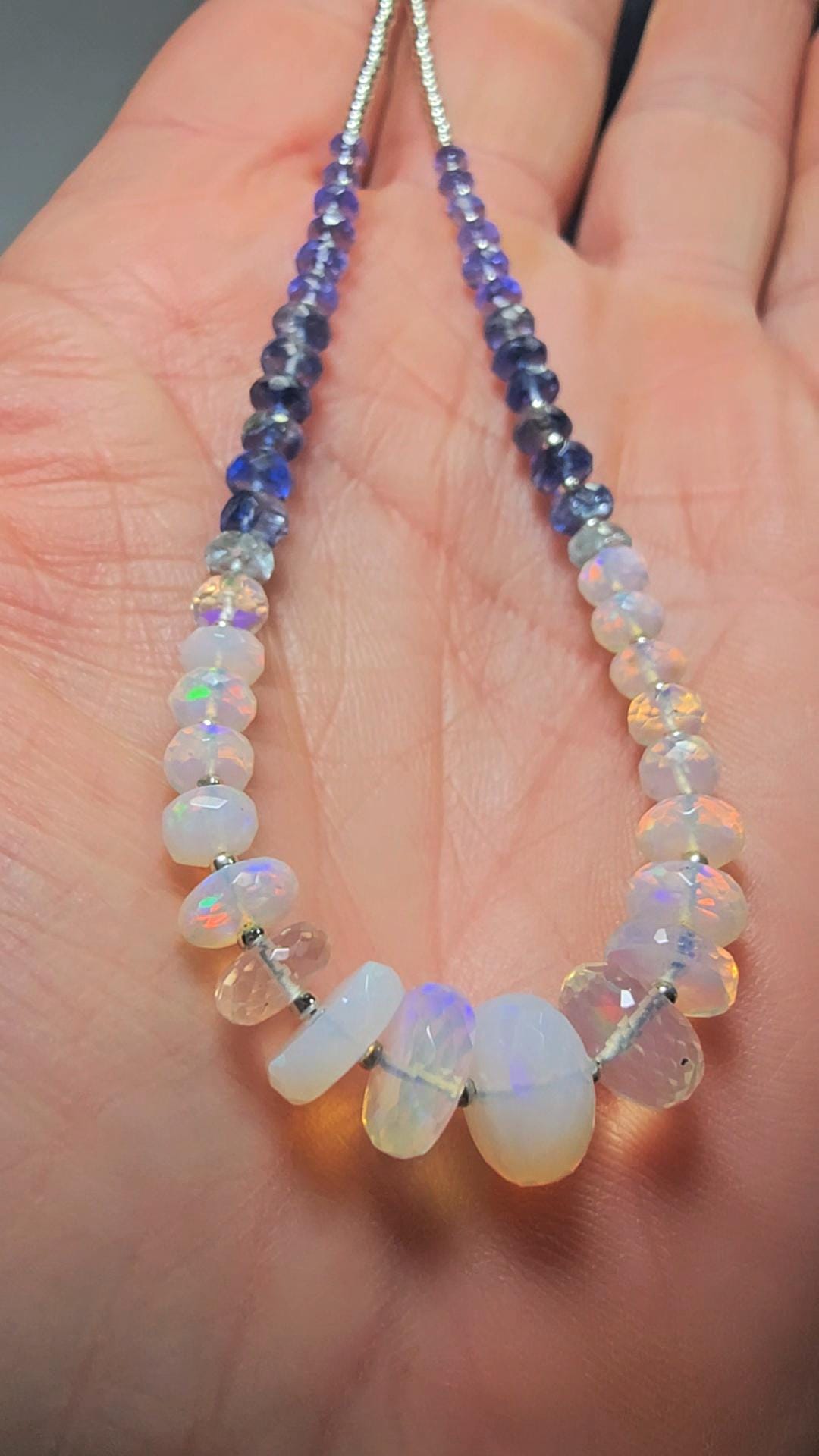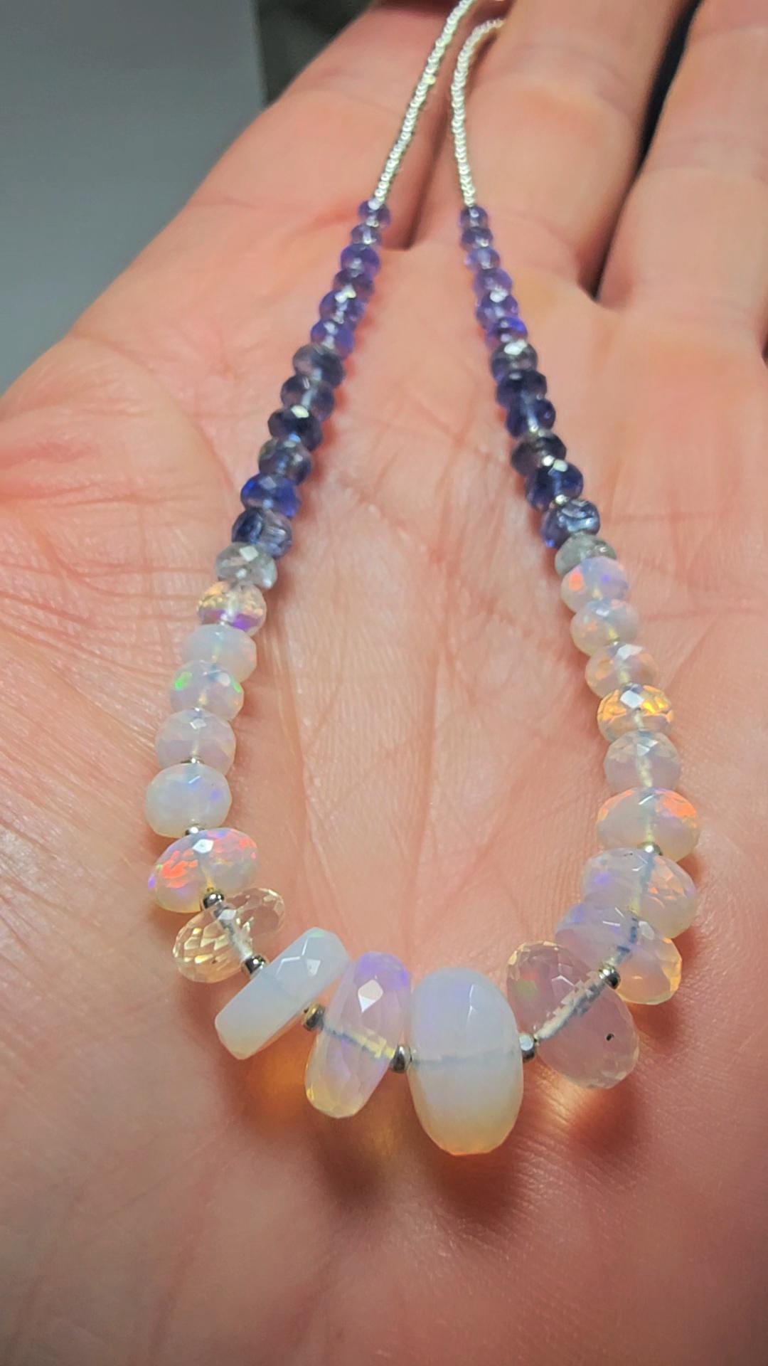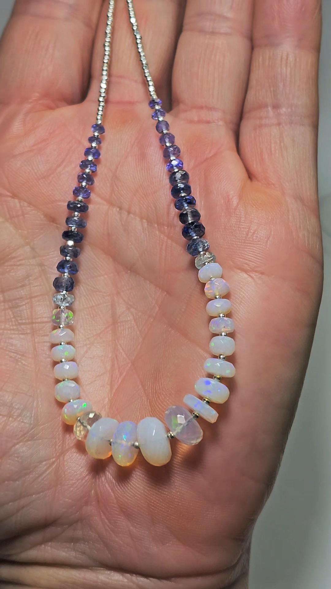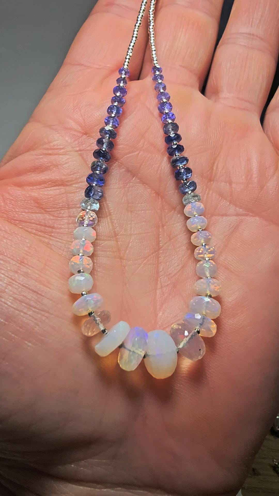 Beaded Necklace: Faceted, Graduated Ethiopian Opal, Kyanite, Iolite, Tanzanite Gemstone Beads