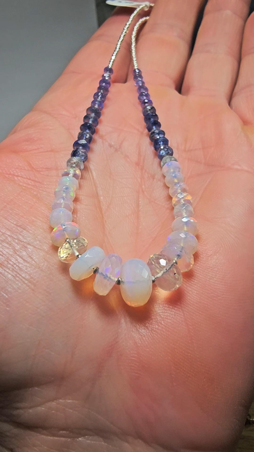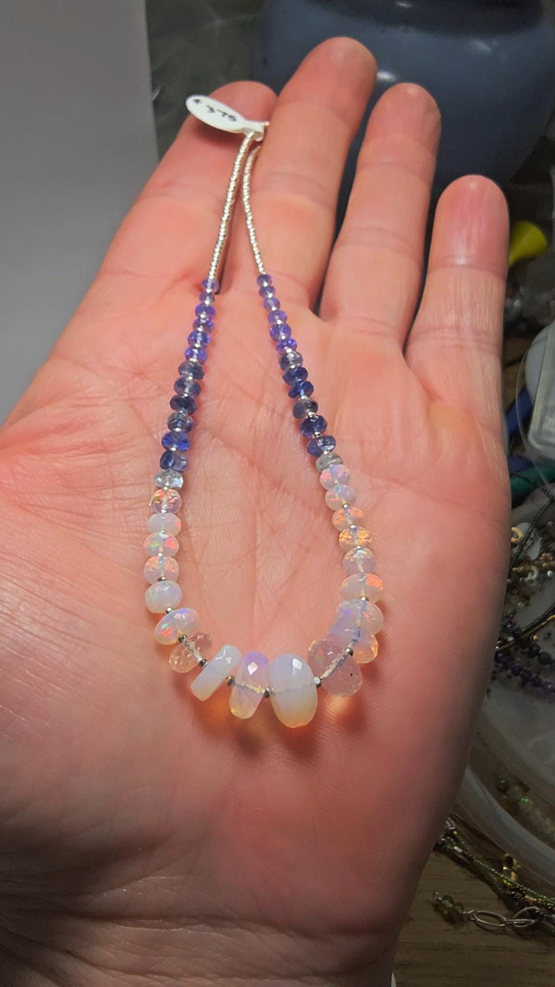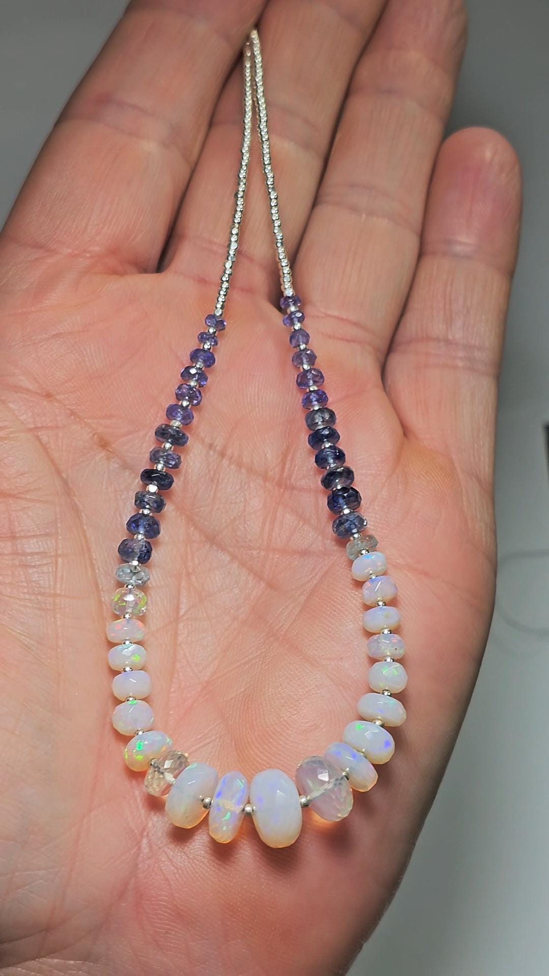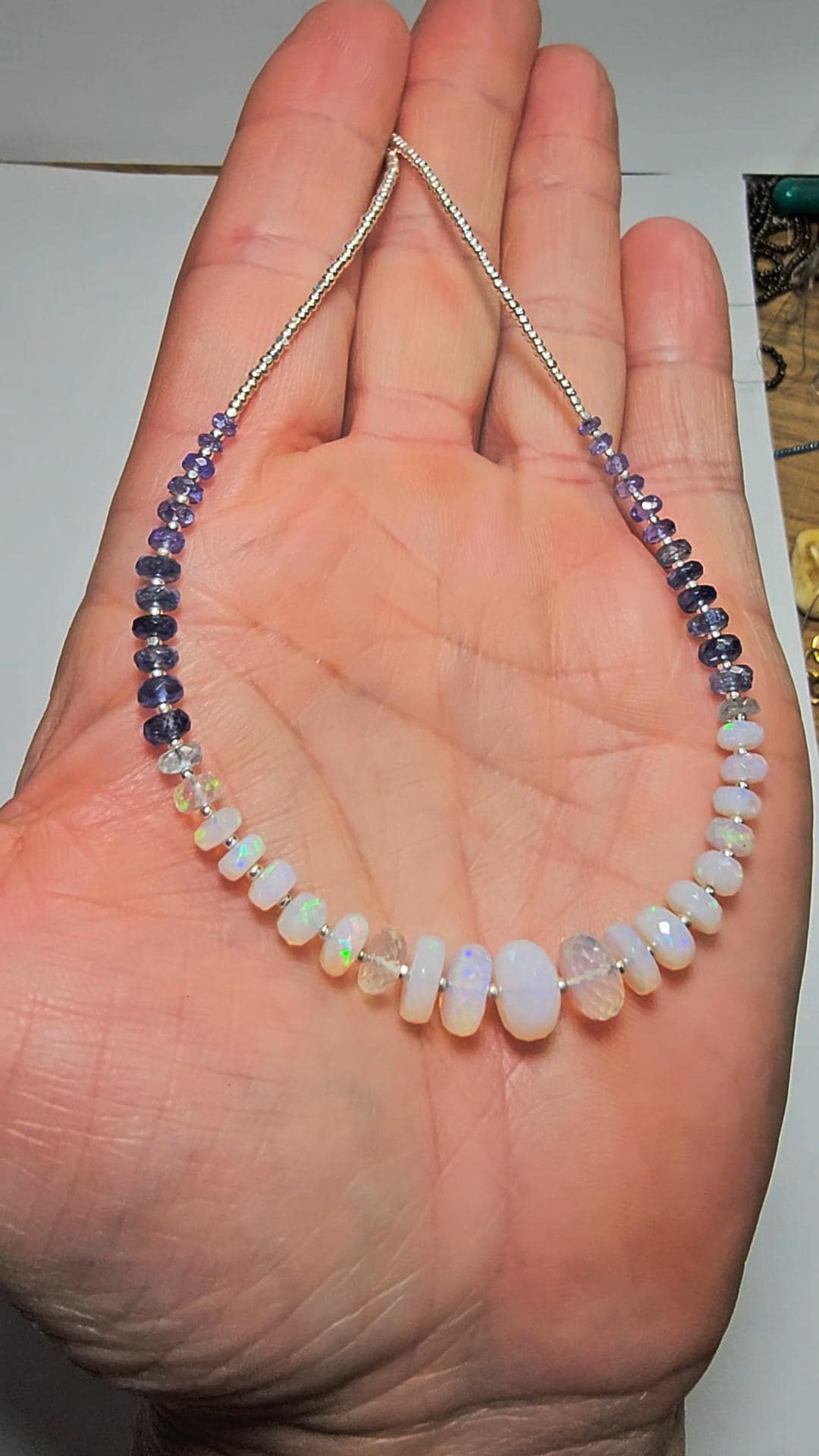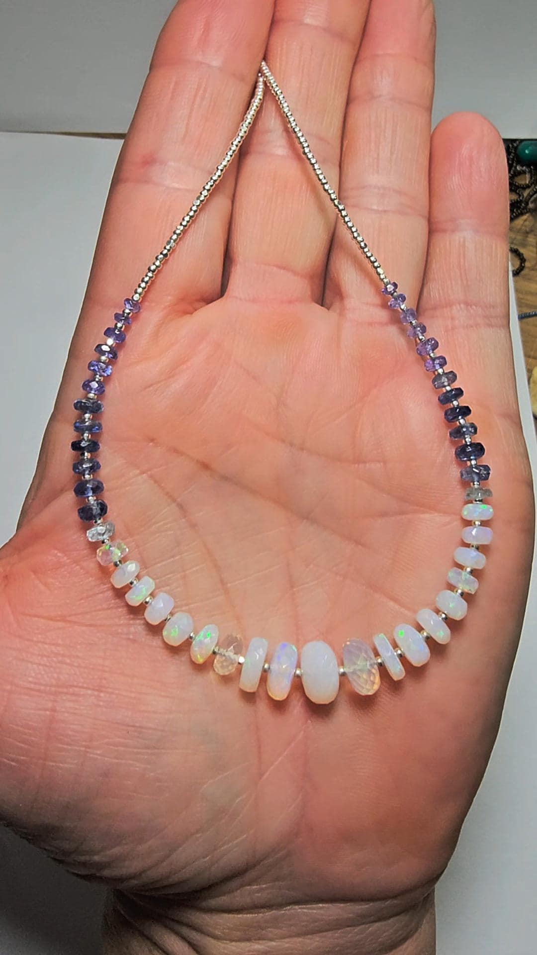 Beaded Necklace: Faceted, Graduated Ethiopian Opal, Kyanite, Iolite, Tanzanite Gemstone Beads