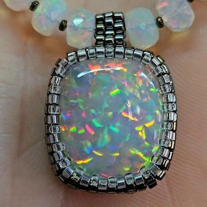 Large, faceted, graduated Ethiopian Opal rondelles, with sparkling Aquamarine, Kyanite, Iolite and Tanzanite. Sterling silver plated glass seed beads.