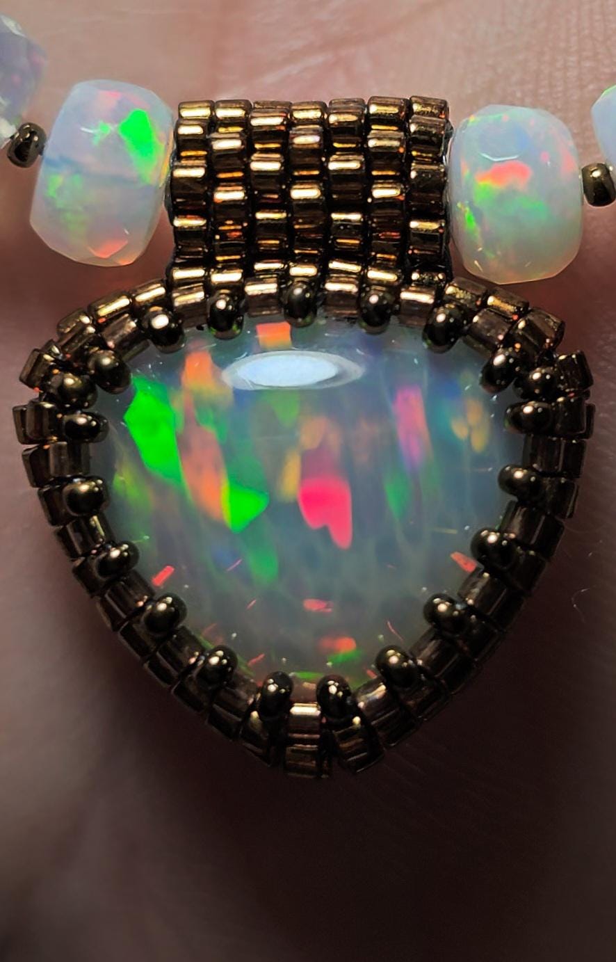 The settings are made of tiny, glass seed beads, which are hand-stitched, one bead to the next, with a fine beading needle, using a heavy 6 lb test-strength, spun, braided, nylon beading thread. There are multiple plies of this thread in every bead! I start making a netting to form the back side of the bezel, and then, while holding the stone in place, I stitch one bead at a time around the perimeter of the cabochon, slowly building the beaded bezel, tailor fitted to each unique gemstone, until it is encased. My beadwork is NOT attached to the stone (no glue), just surrounding it, like a well fitted basket.
