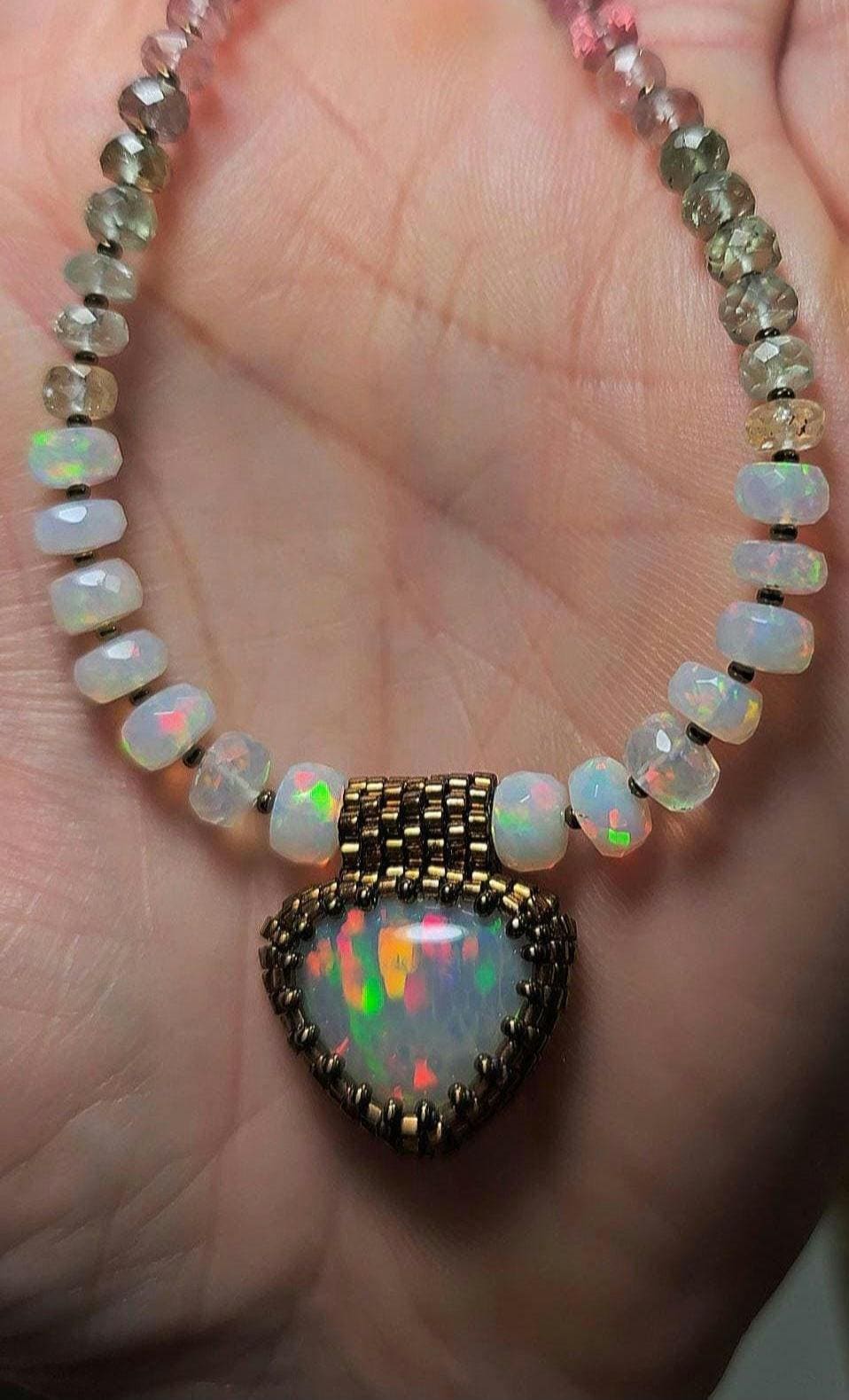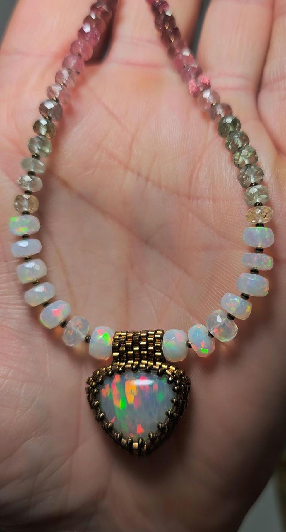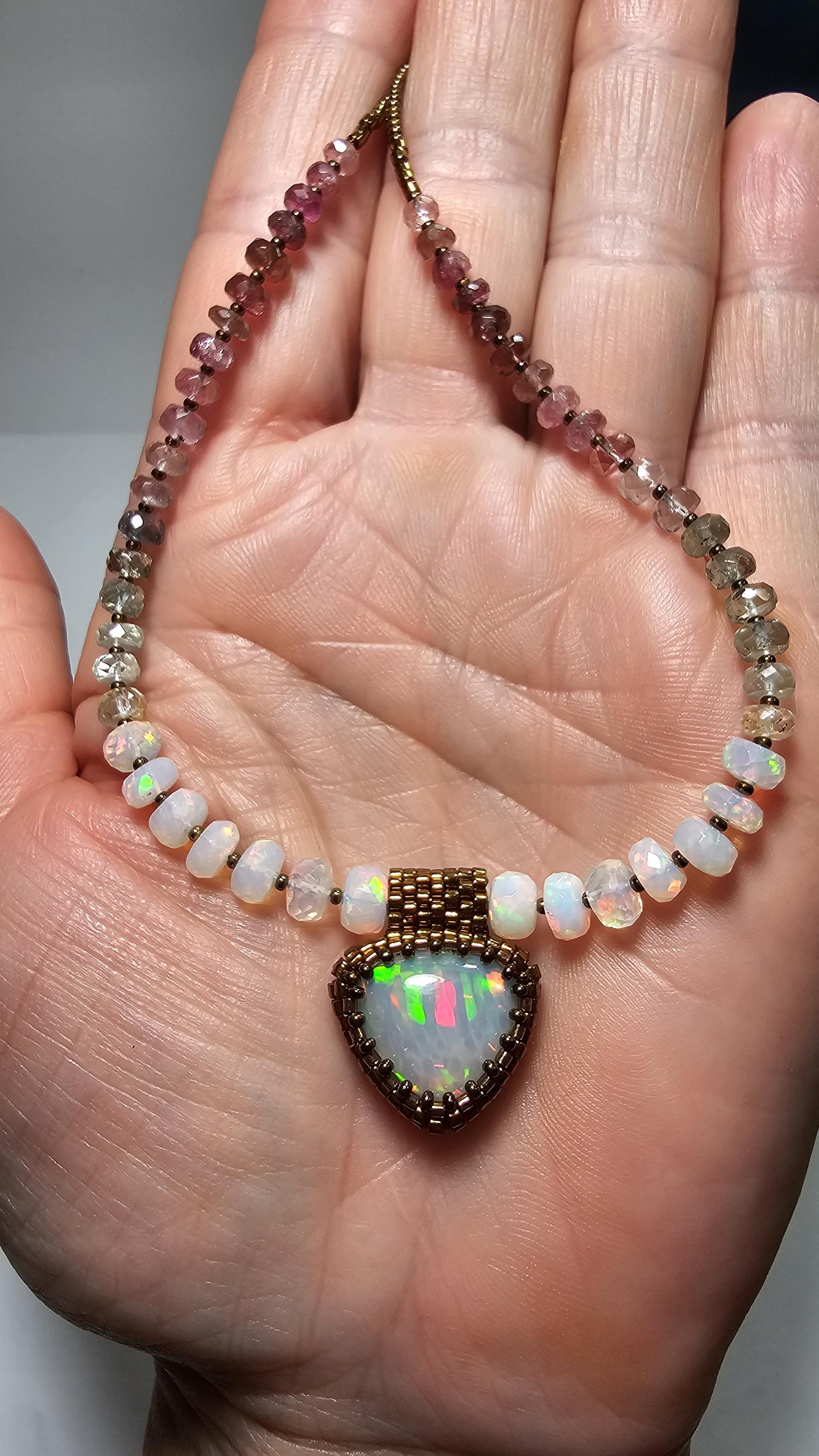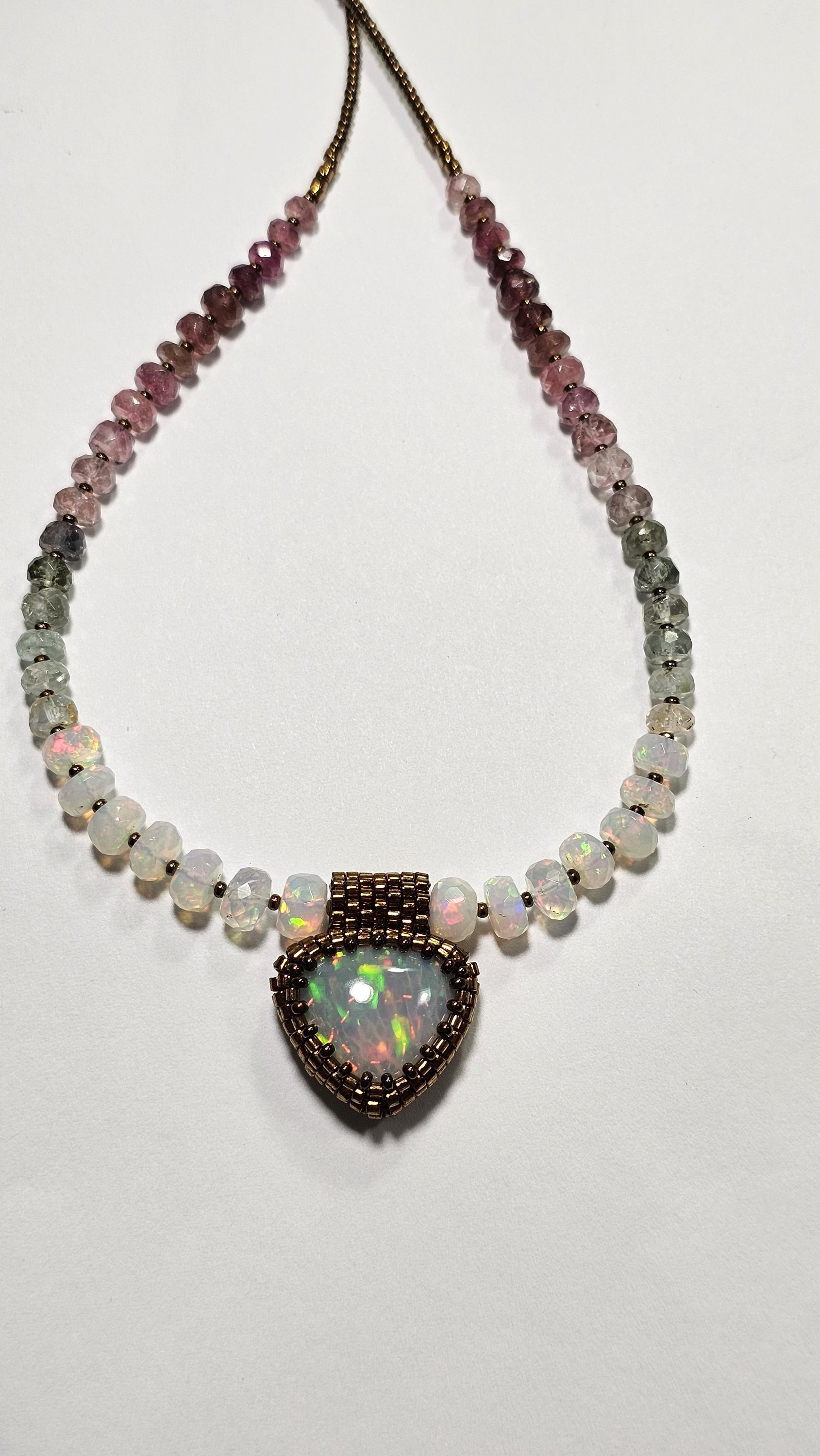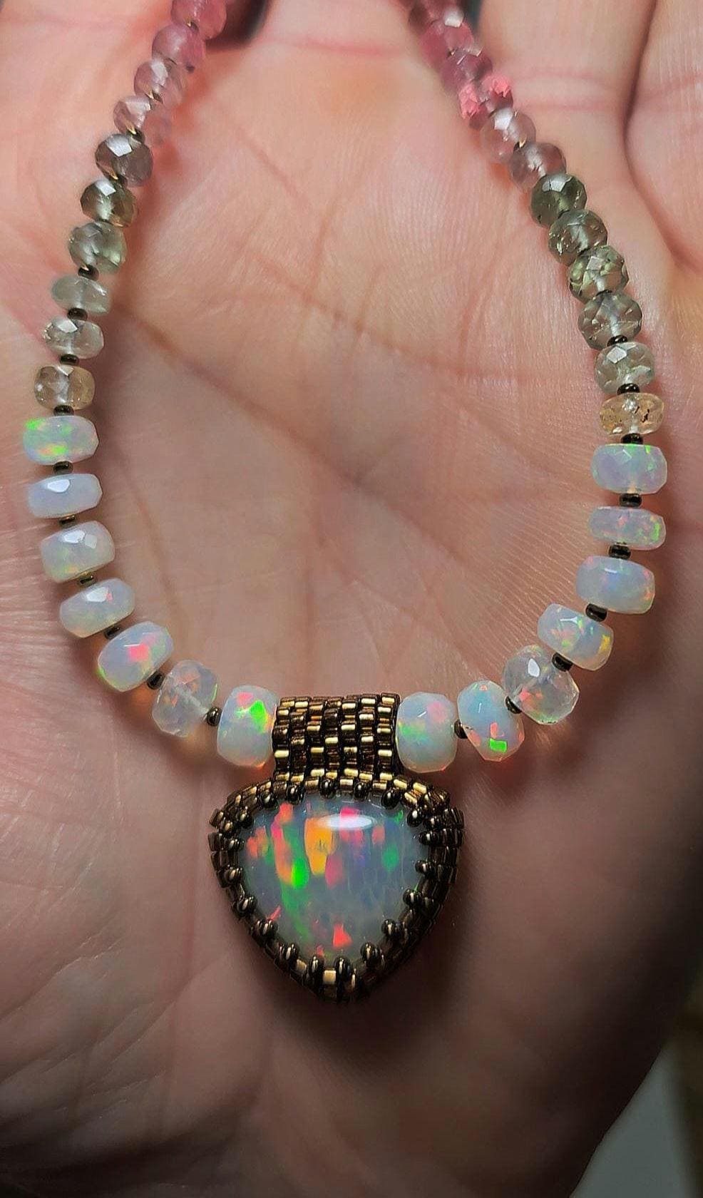 New! This necklace features a large, heart-shape (or inverted fat pear!) Ethiopian Opal with cool pattern to the play of color! There is a honeycomb pattern, but they are elongated cells on a bit of diagonal, and display every color of the rainbow! The beads are also colorful, faceted Ethiopian Opal rondelles, shaded Verdelite and Rubellite (aka Watermelon Tourmaline beads). $725