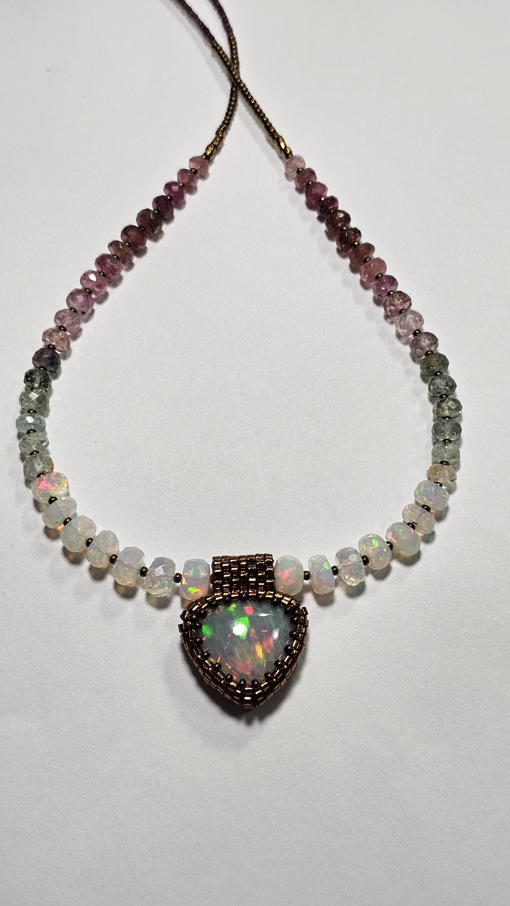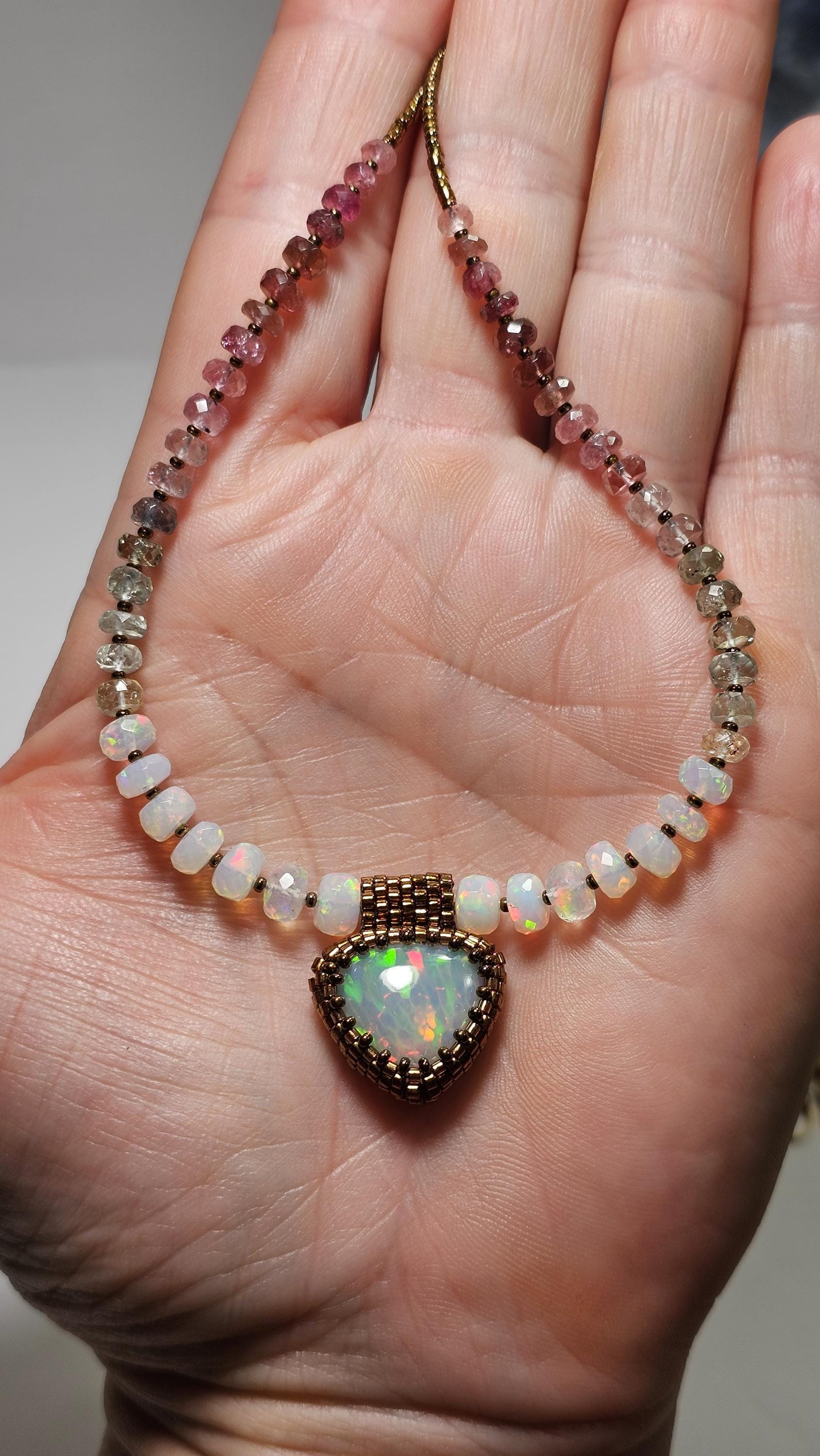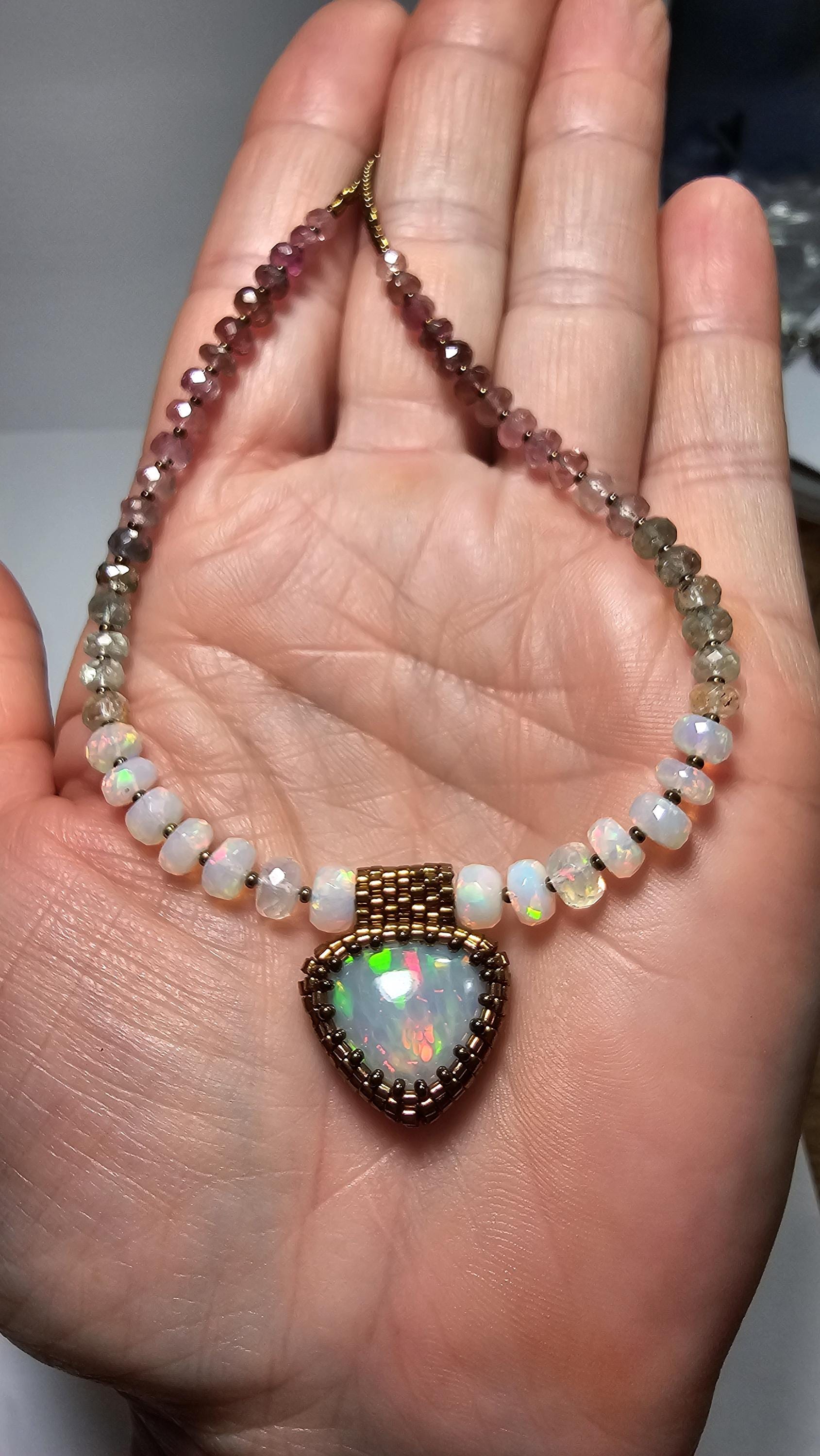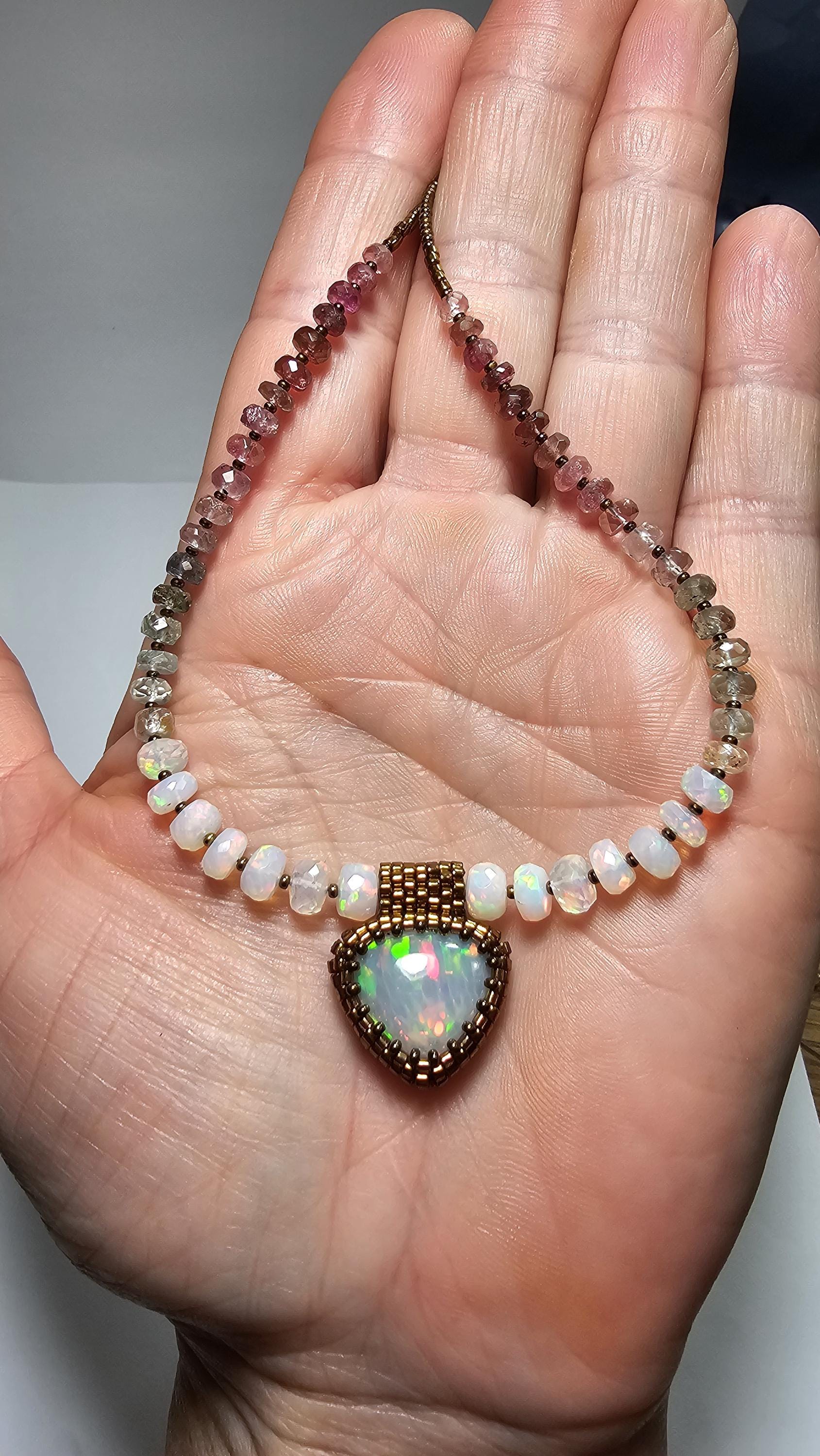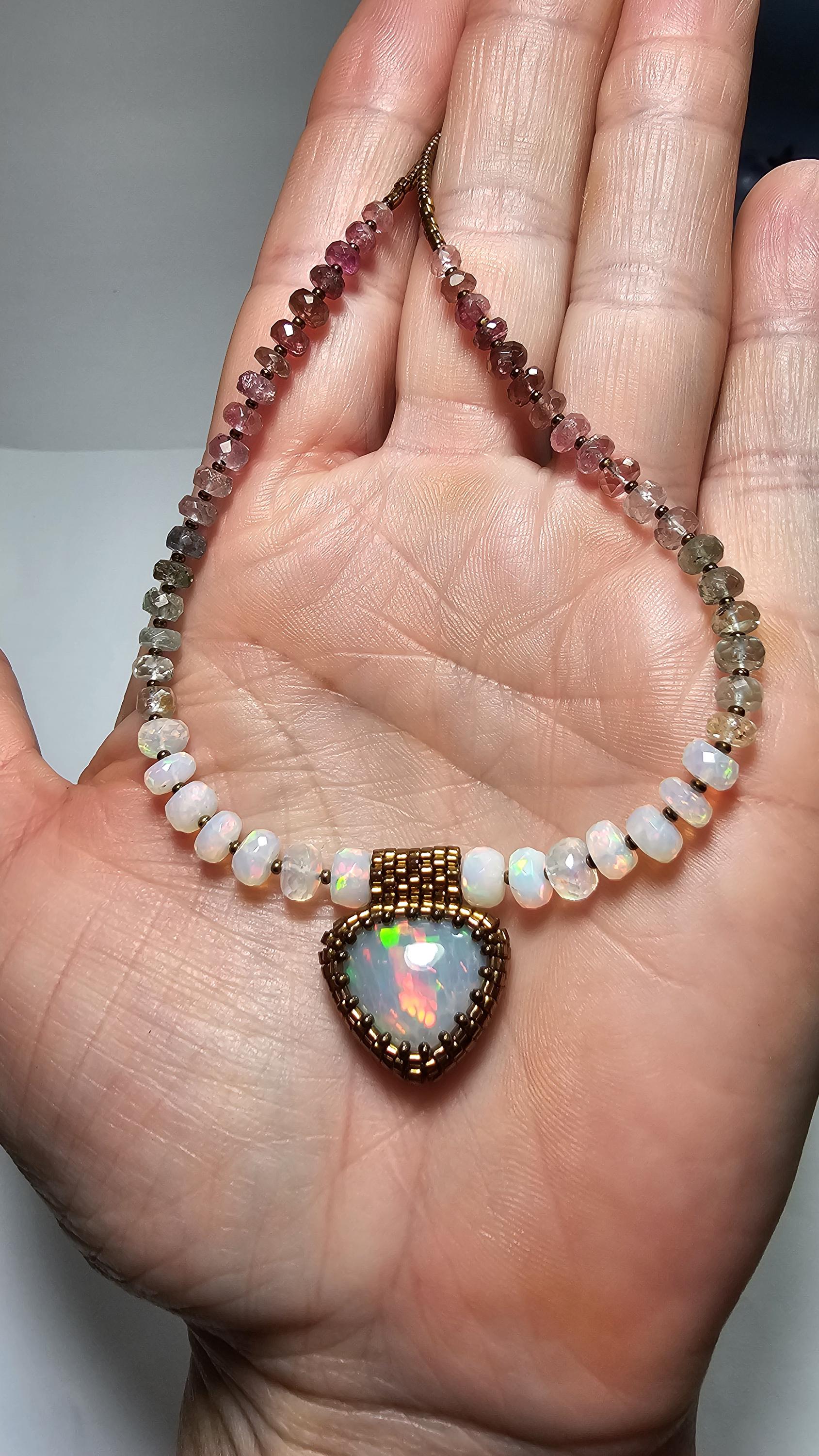 New! This necklace features a large, heart-shape (or inverted fat pear!) Ethiopian Opal with cool pattern to the play of color! There is a honeycomb pattern, but they are elongated cells on a bit of diagonal, and display every color of the rainbow! The beads are also colorful, faceted Ethiopian Opal rondelles, shaded Verdelite and Rubellite (aka Watermelon Tourmaline beads). $725
