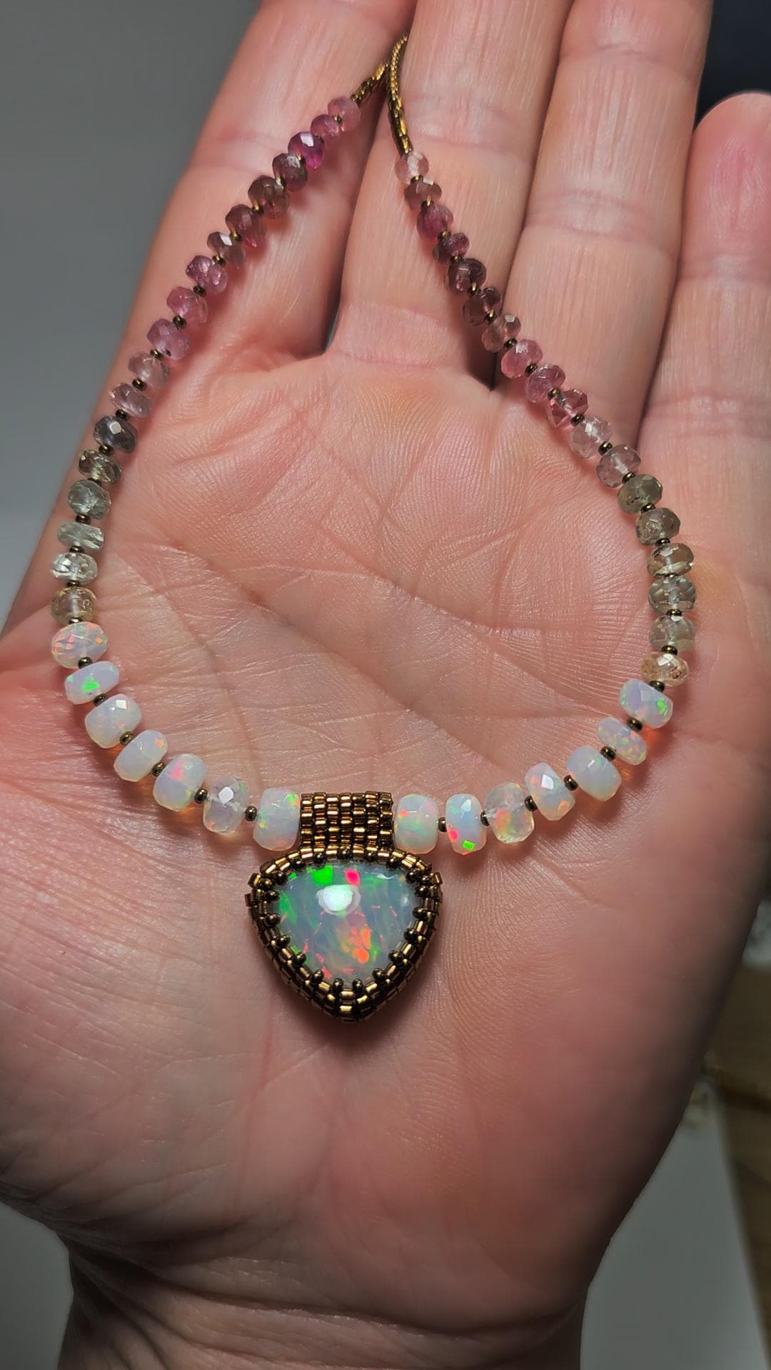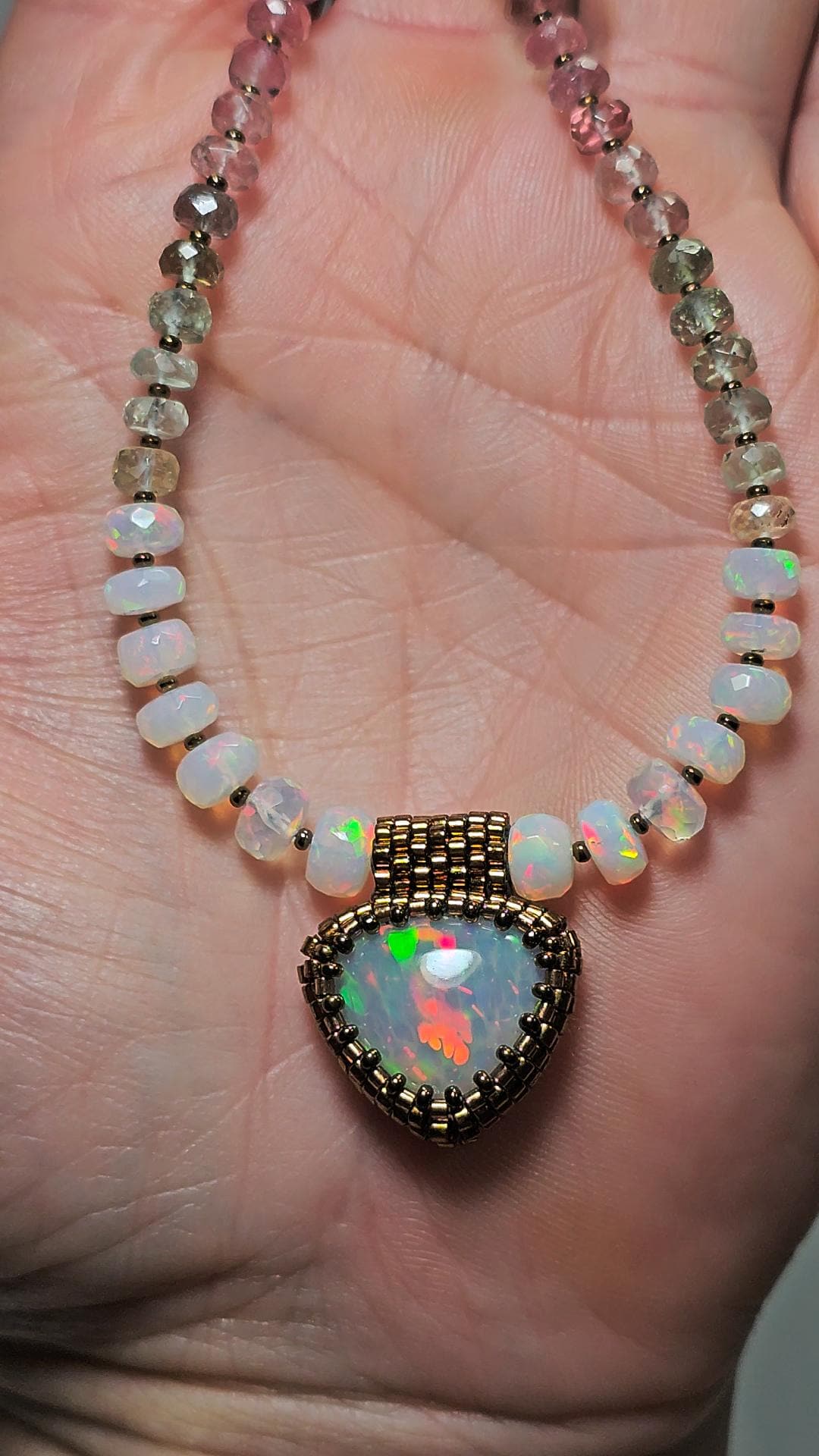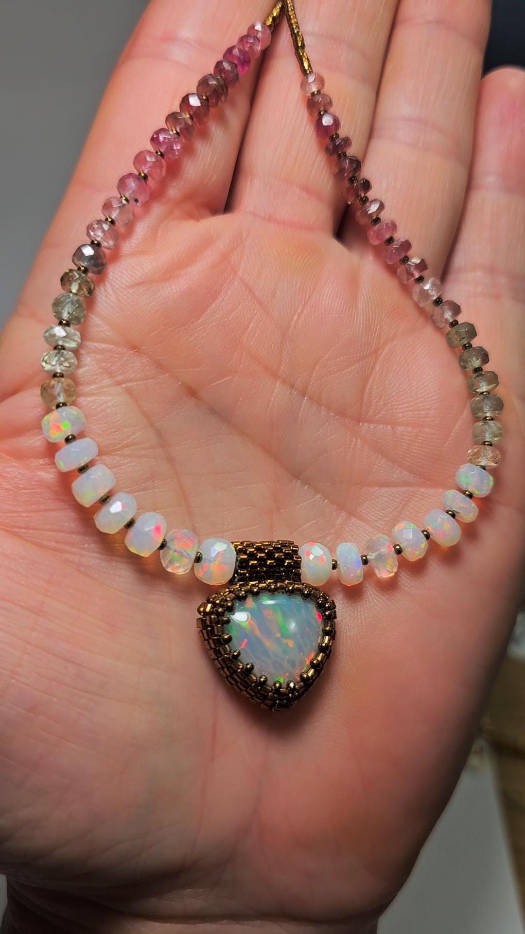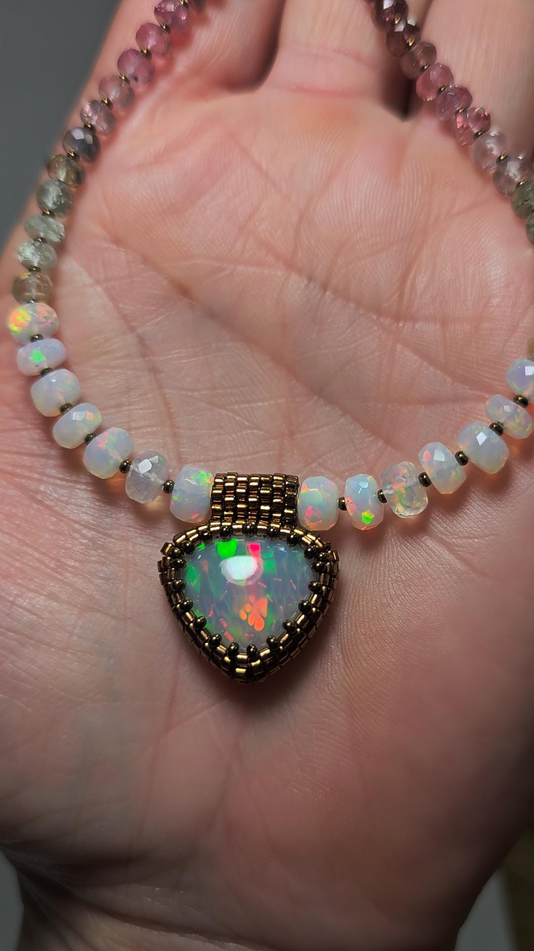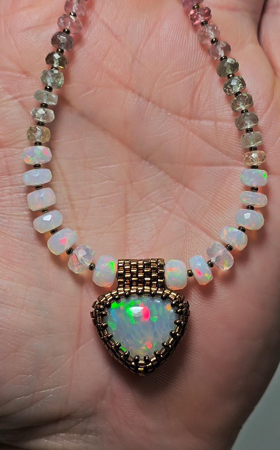New! This necklace features a large, heart-shape (or inverted fat pear!) Ethiopian Opal with cool pattern to the play of color! There is a honeycomb pattern, but they are elongated cells on a bit of diagonal, and display every color of the rainbow! The beads are also colorful, faceted Ethiopian Opal rondelles, shaded Verdelite and Rubellite (aka Watermelon Tourmaline beads). $725