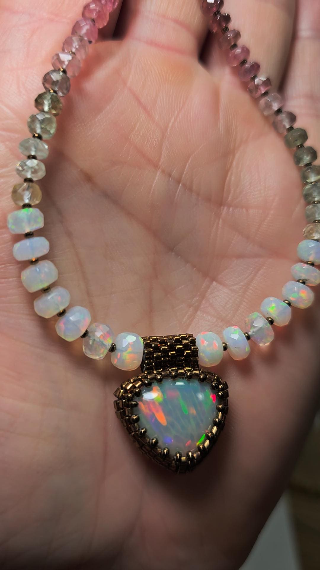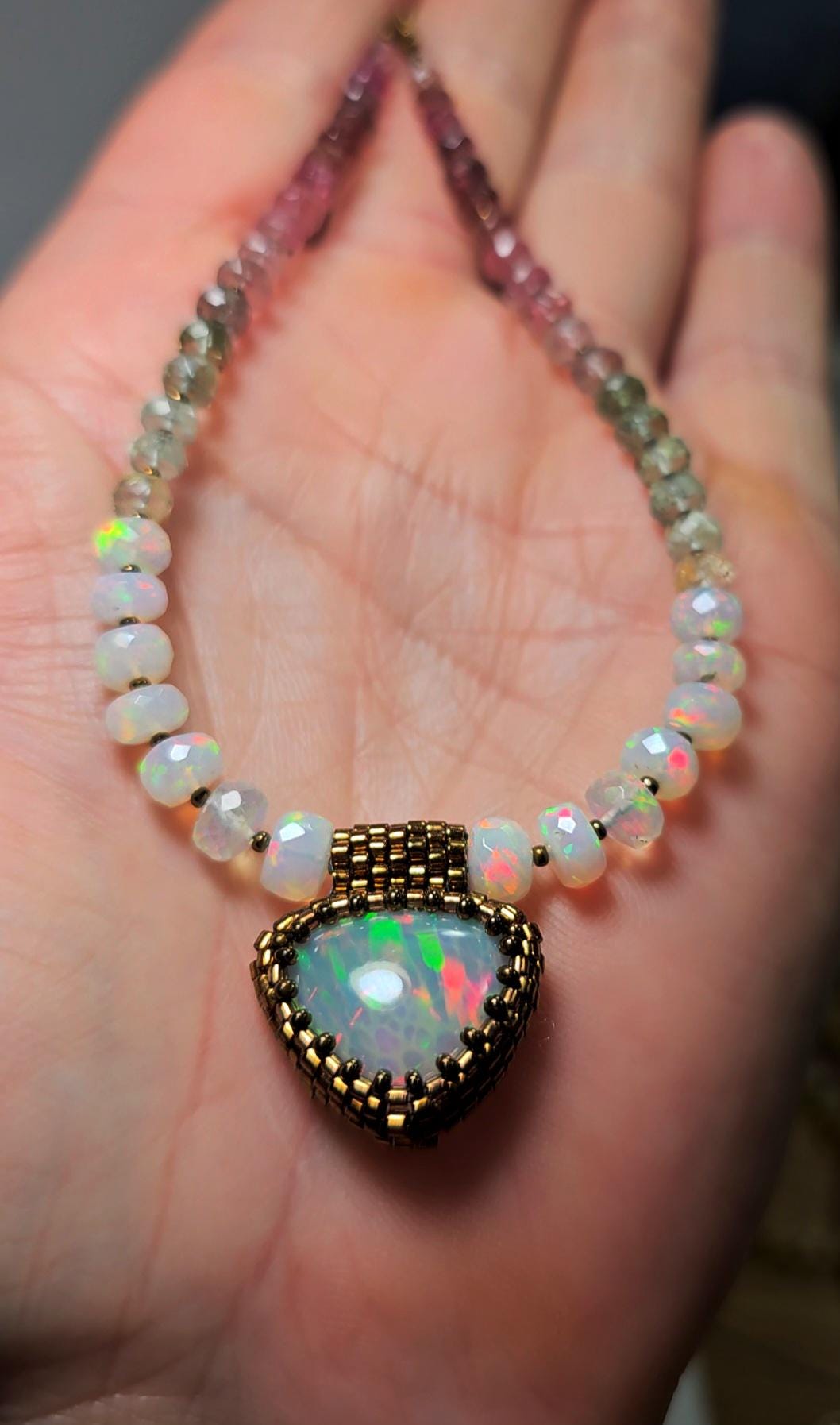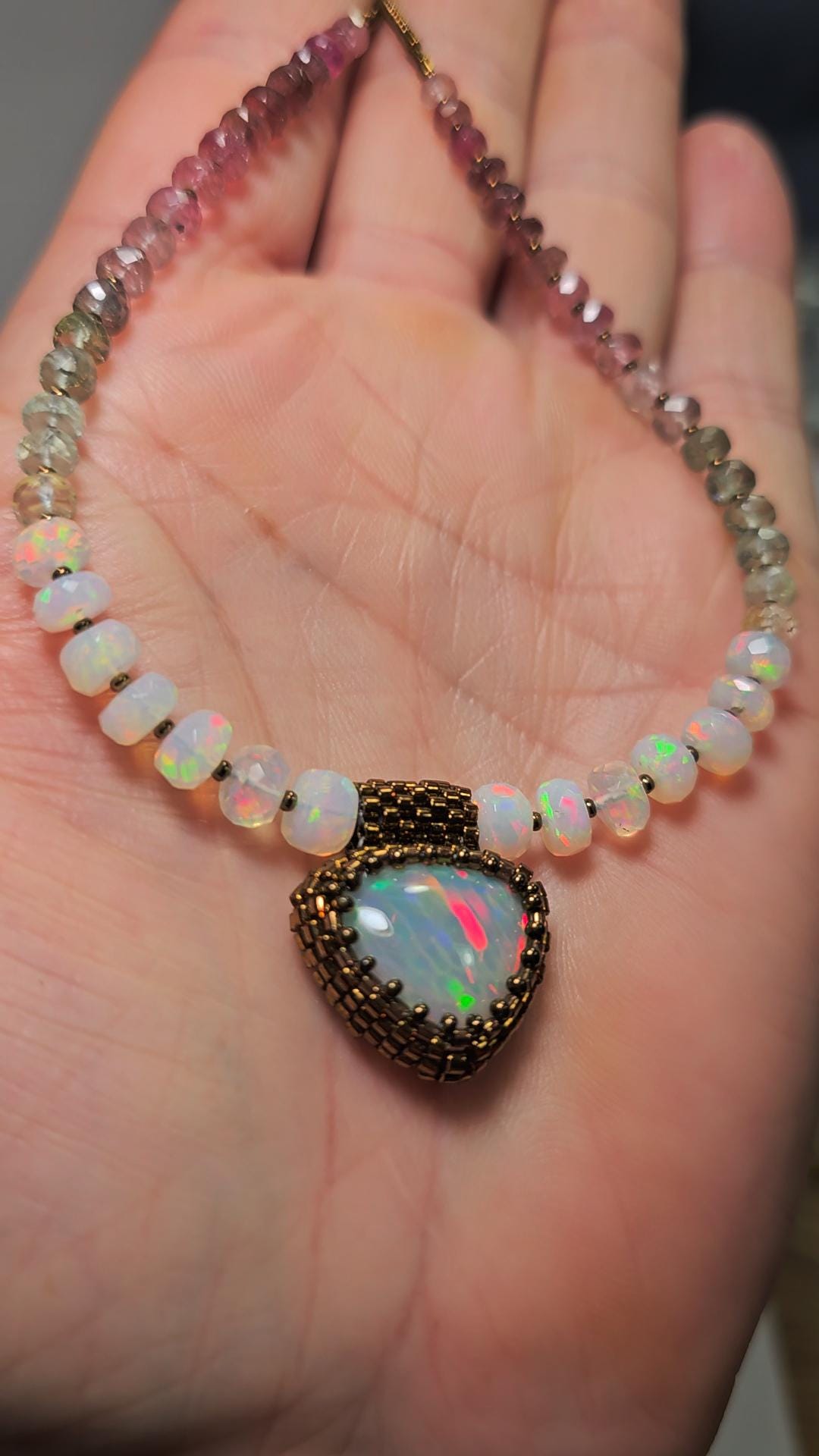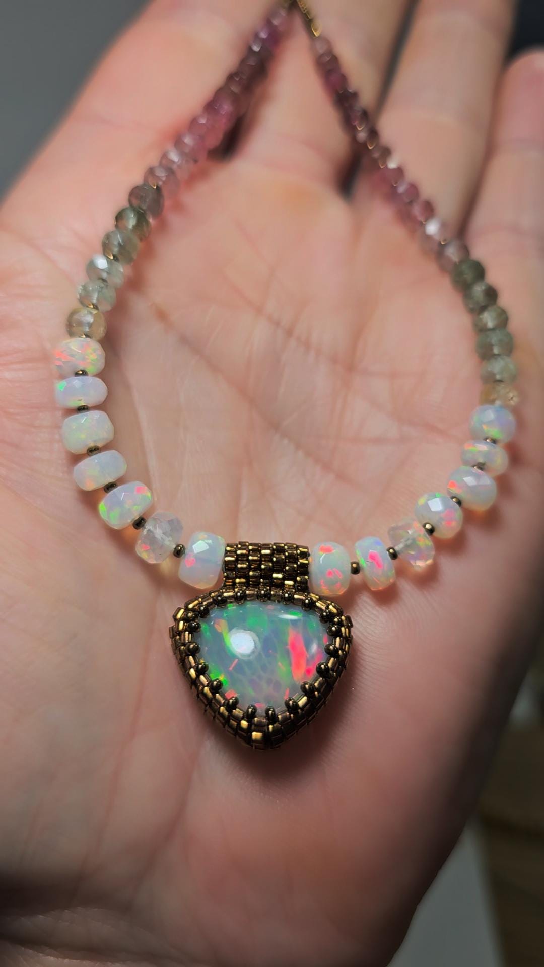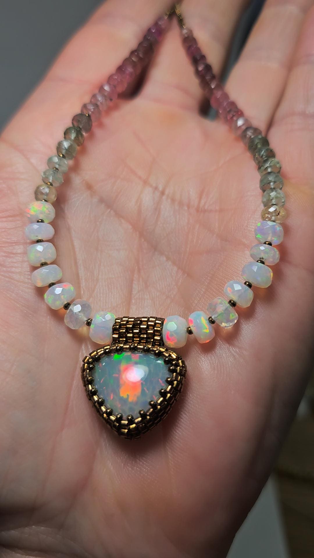 New! This necklace features a large, heart-shape (or inverted fat pear!) Ethiopian Opal with cool pattern to the play of color! There is a honeycomb pattern, but they are elongated cells on a bit of diagonal, and display every color of the rainbow! The beads are also colorful, faceted Ethiopian Opal rondelles, shaded Verdelite and Rubellite (aka Watermelon Tourmaline beads). $725