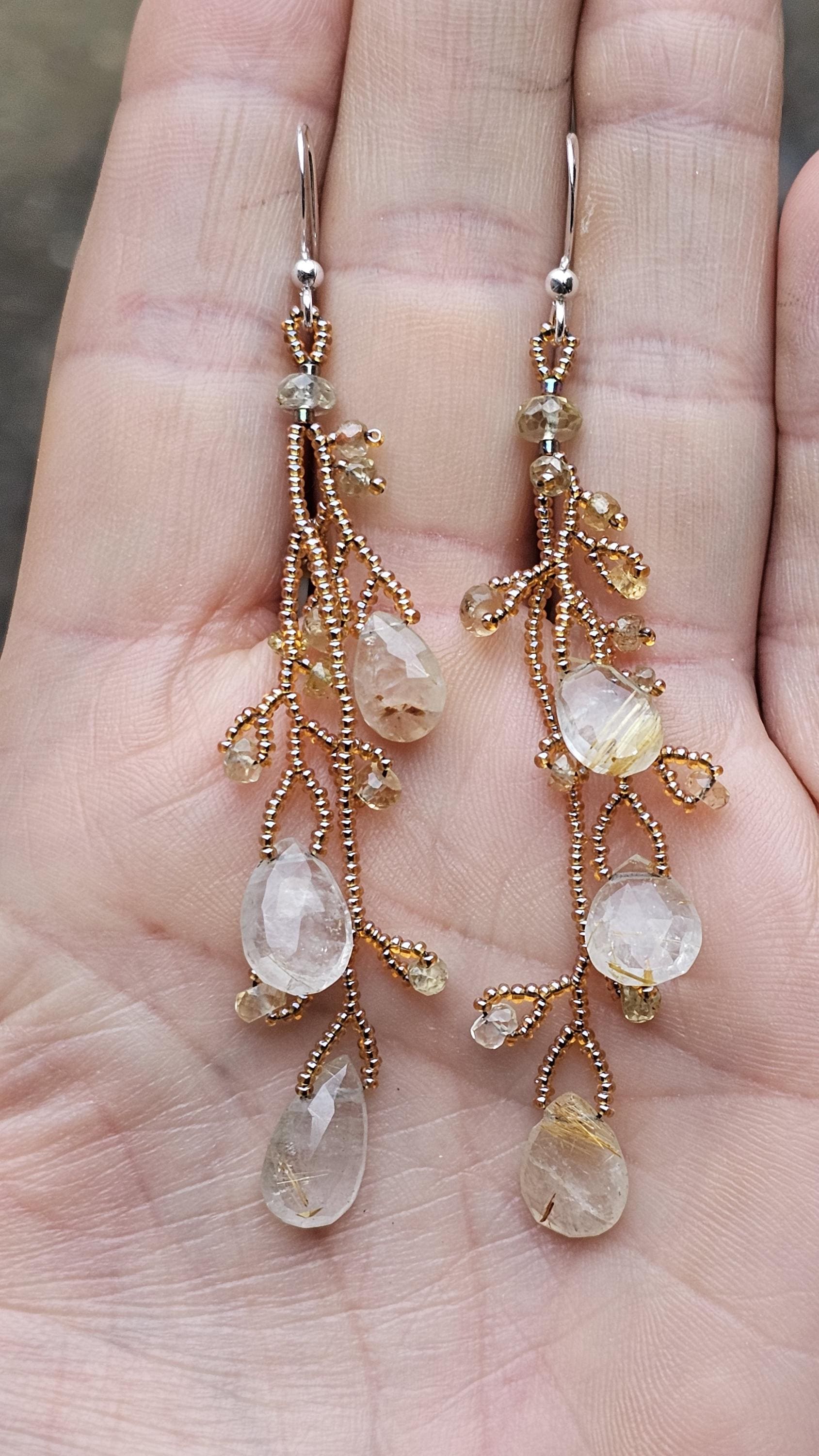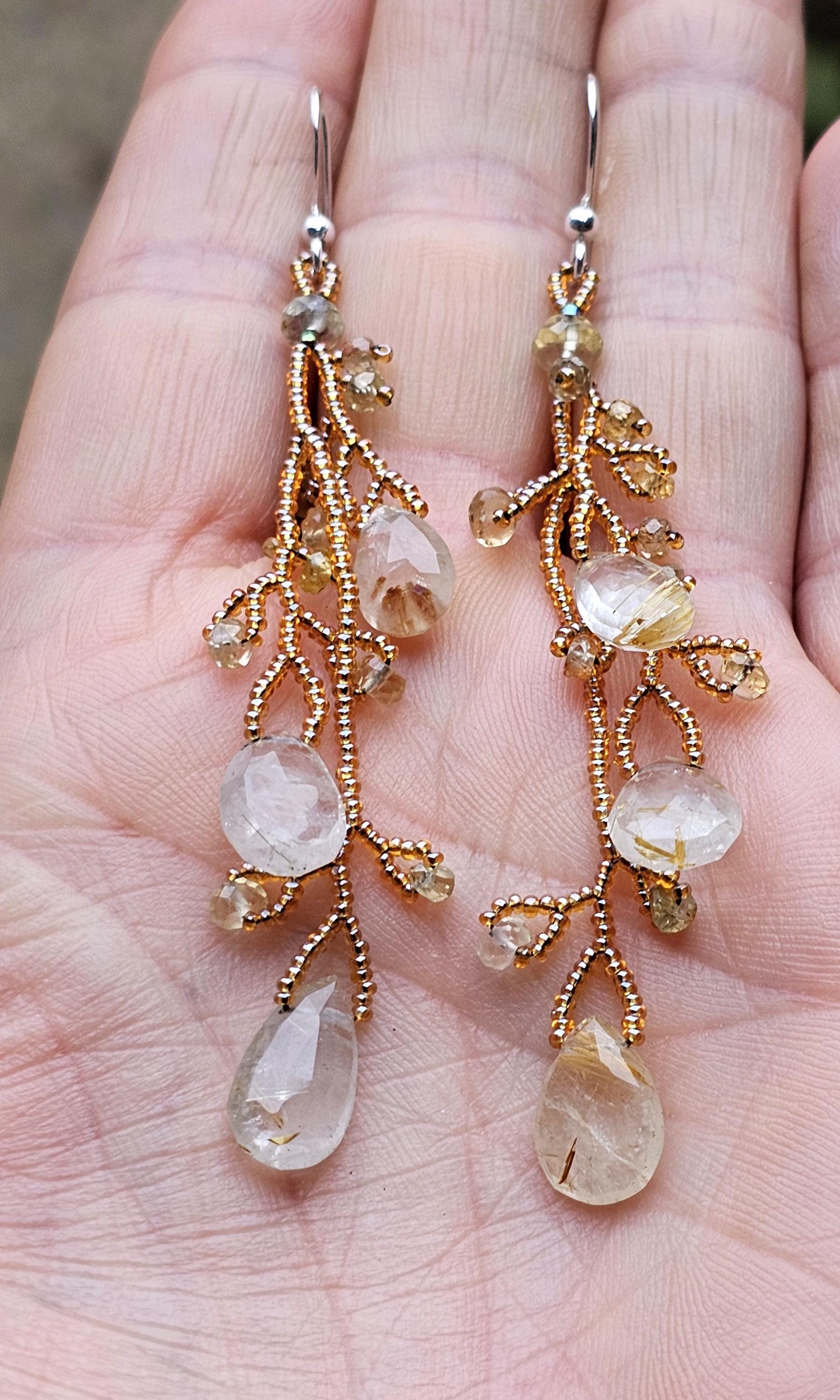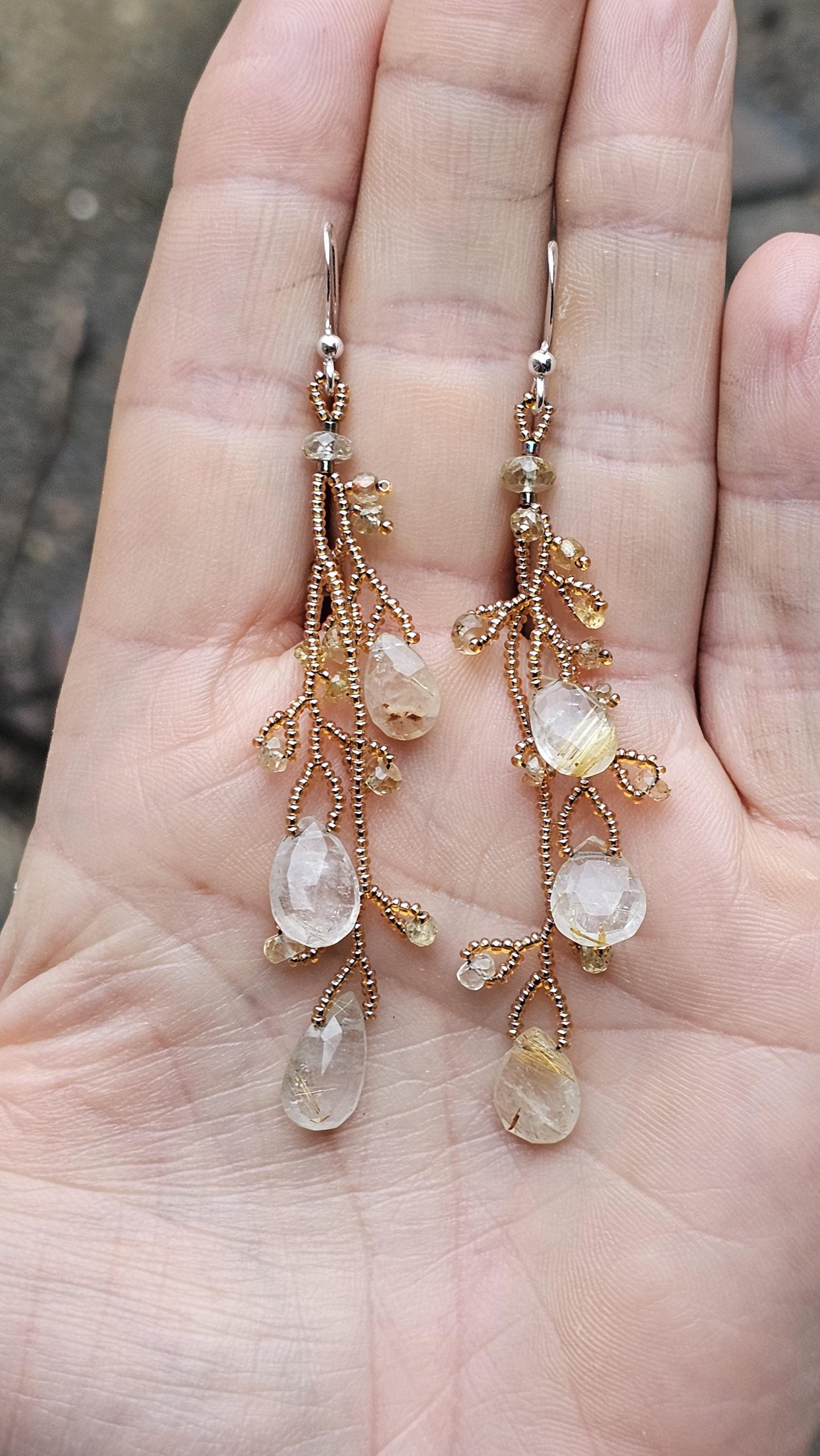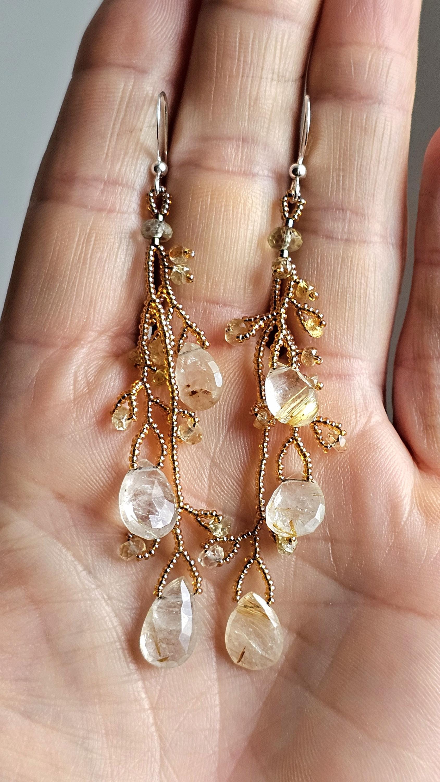 Long Beaded Gemstone Earrings: Rutilated Quartz Briolettes, Citrine, and Sapphire Beads