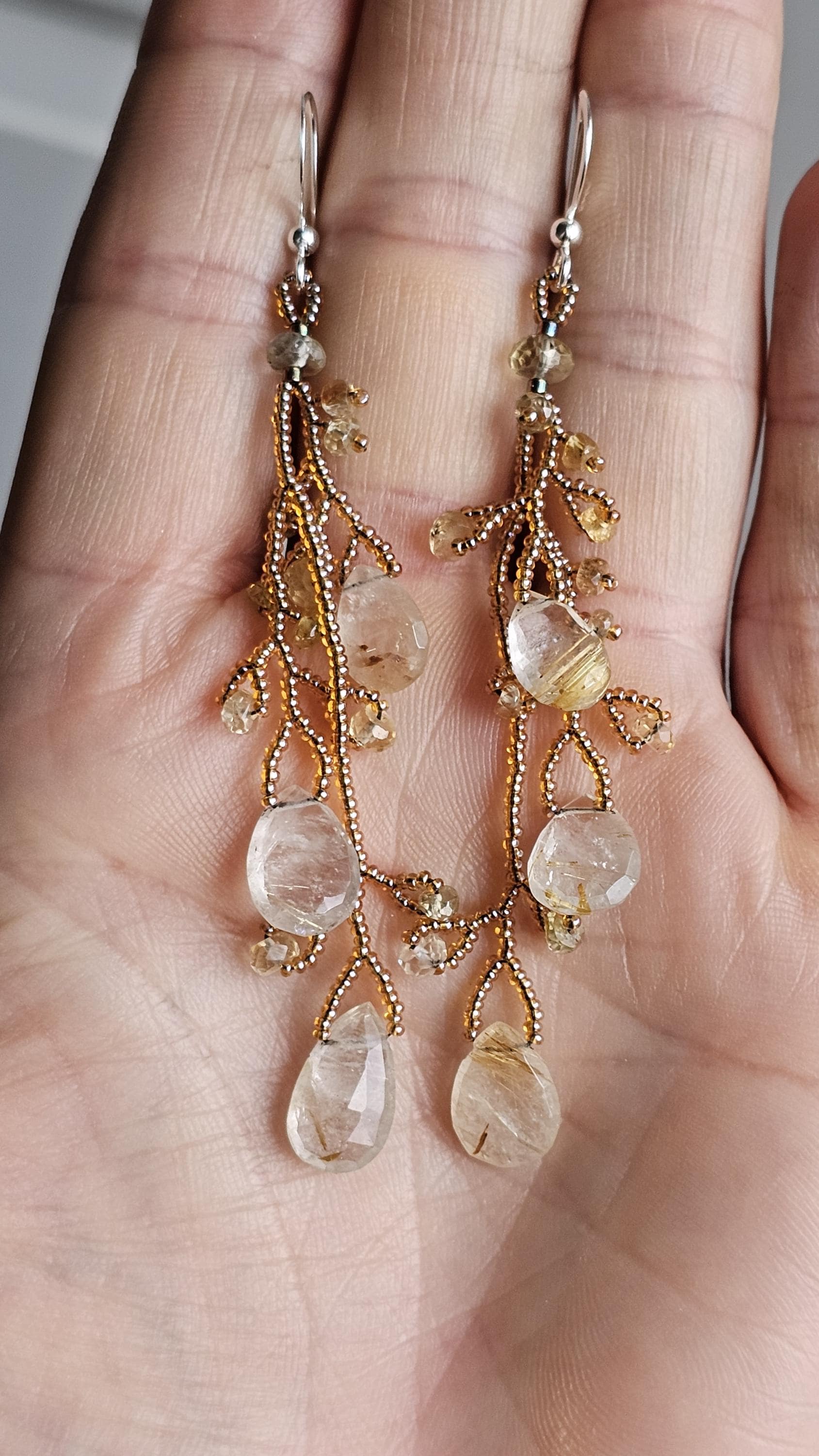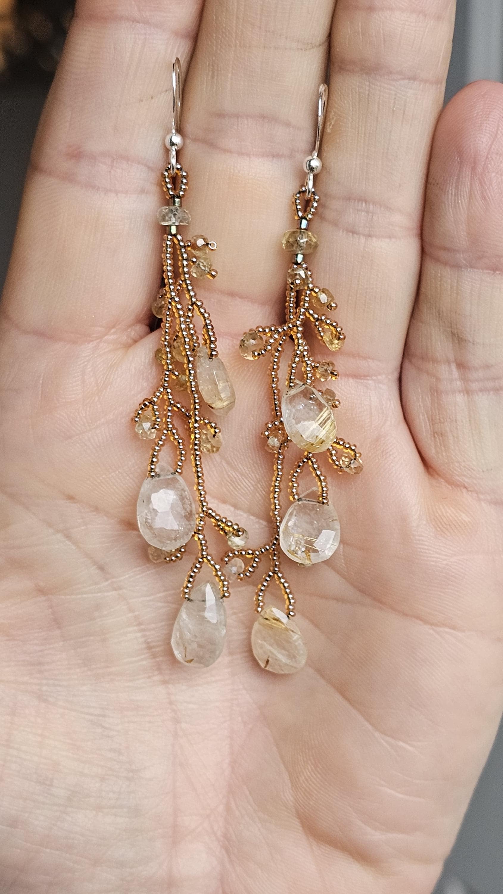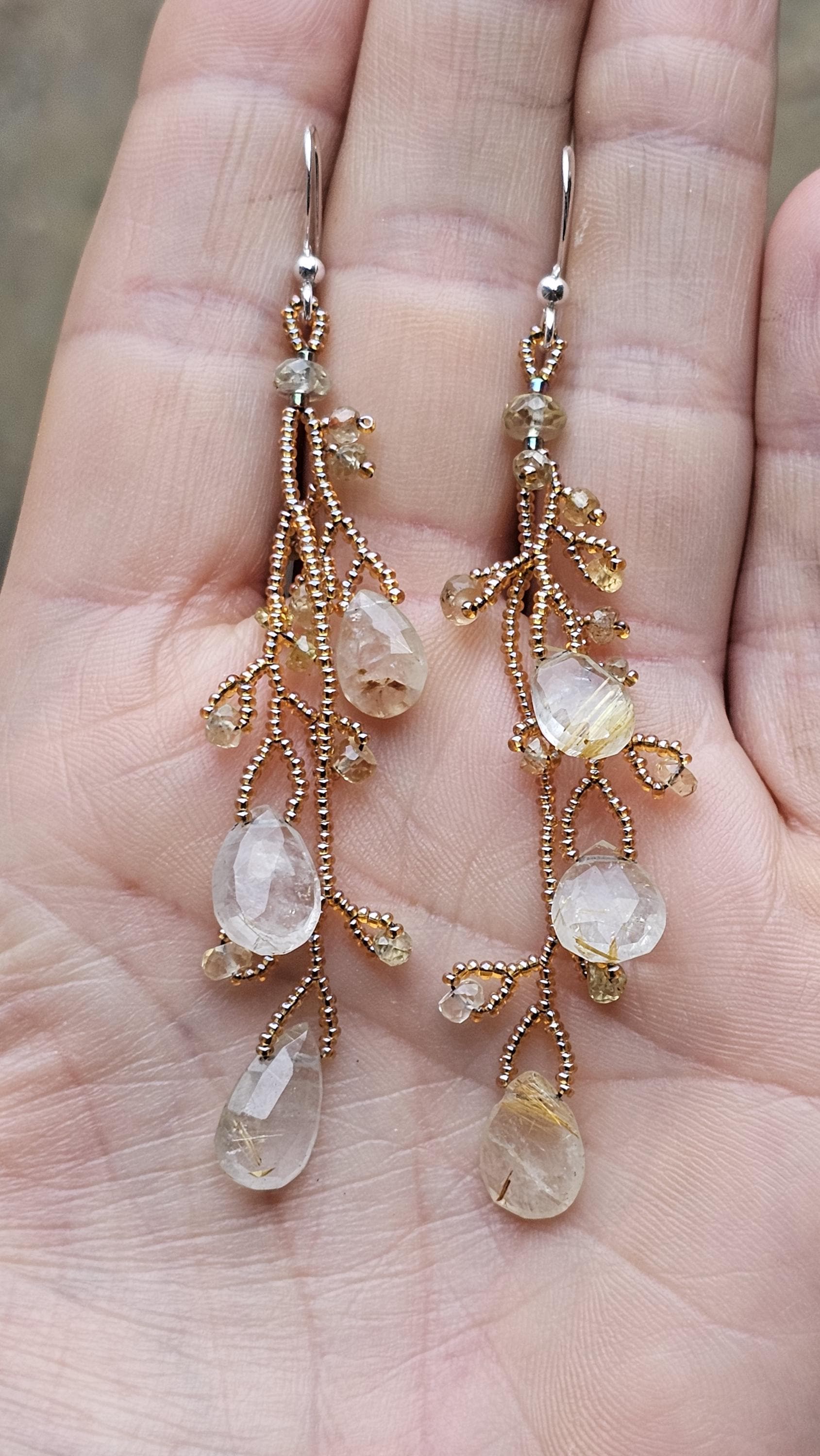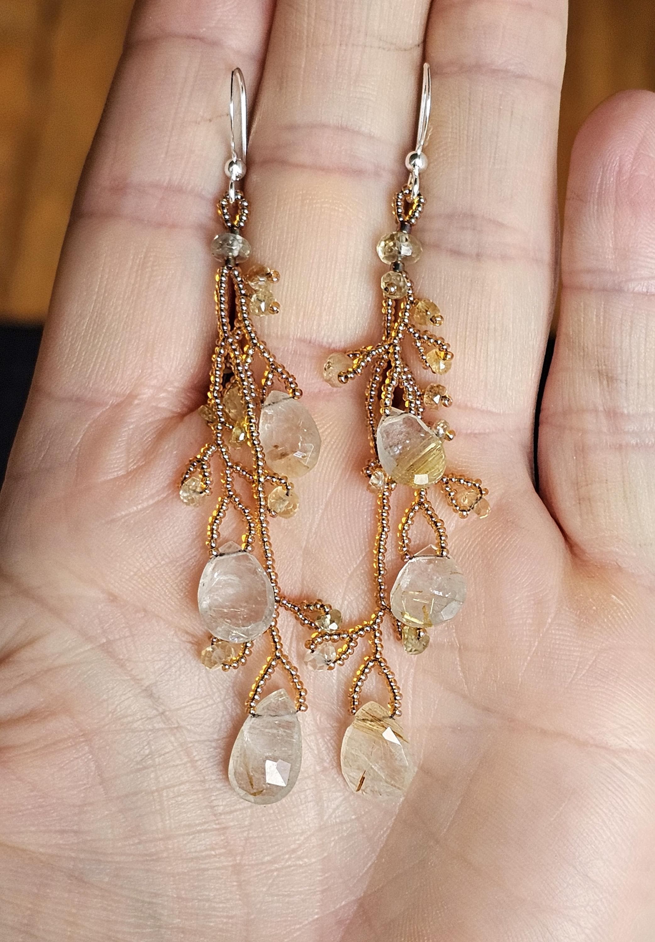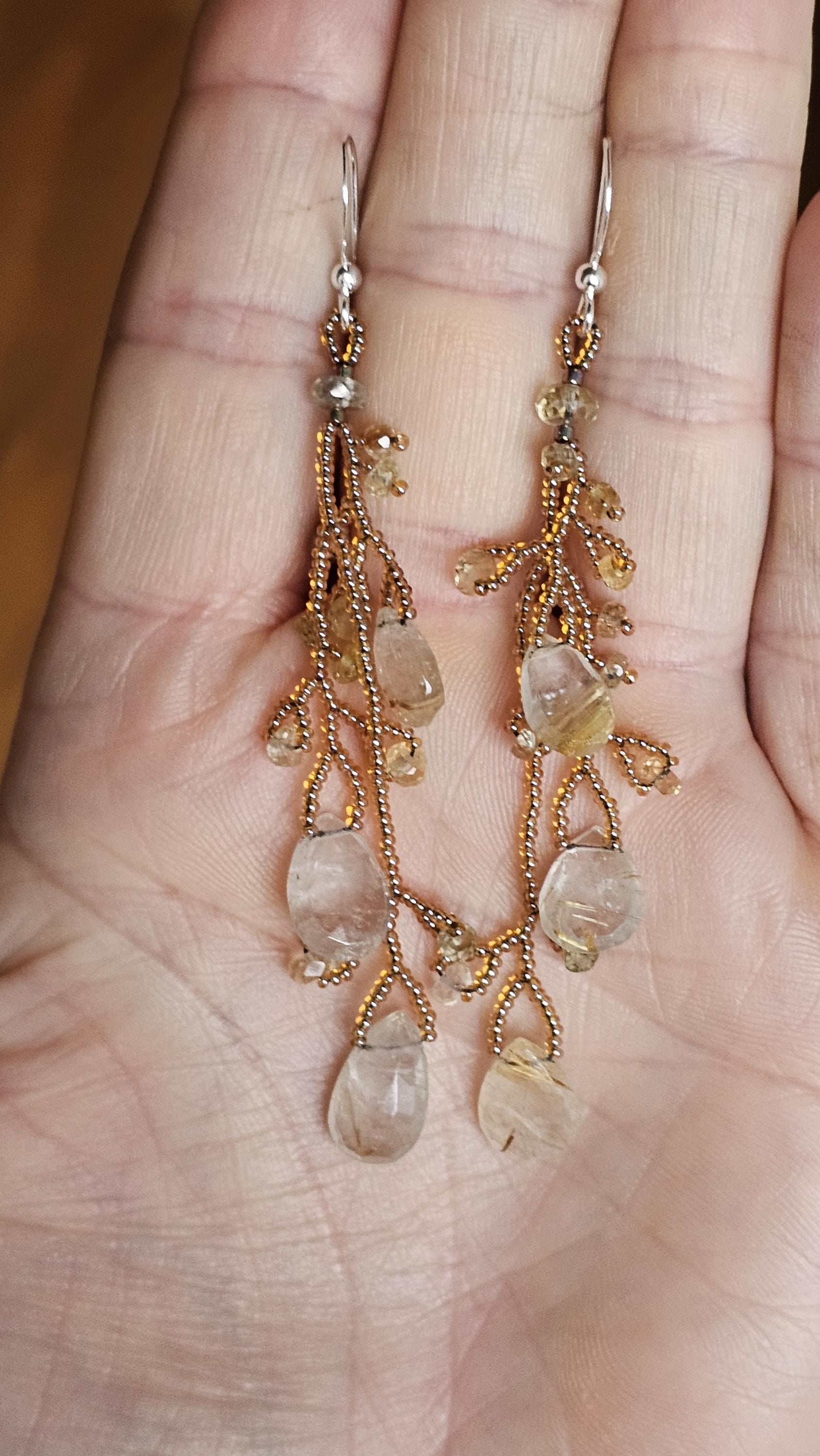 Long Beaded Gemstone Earrings: Rutilated Quartz Briolettes, Citrine, and Sapphire Beads