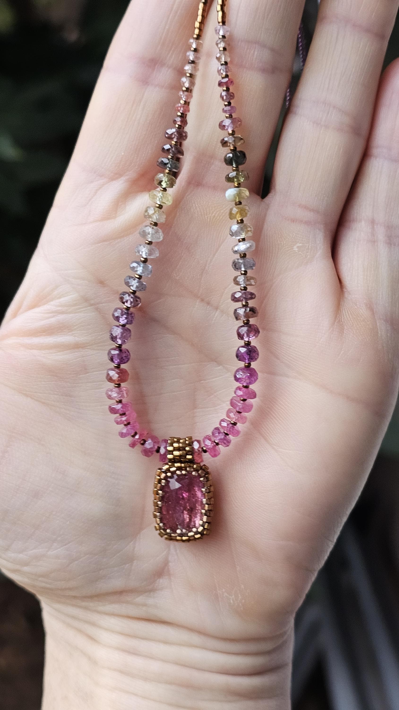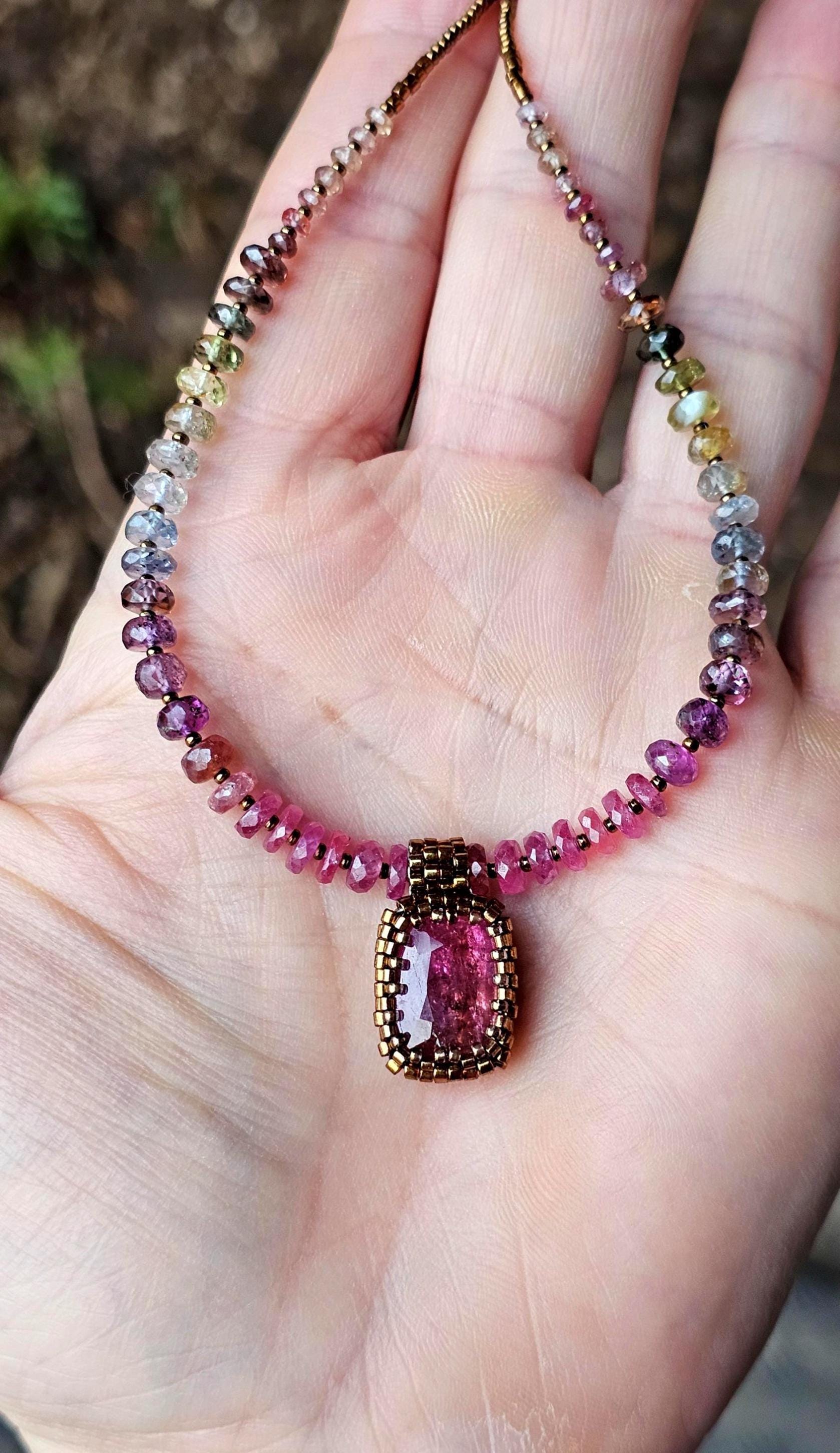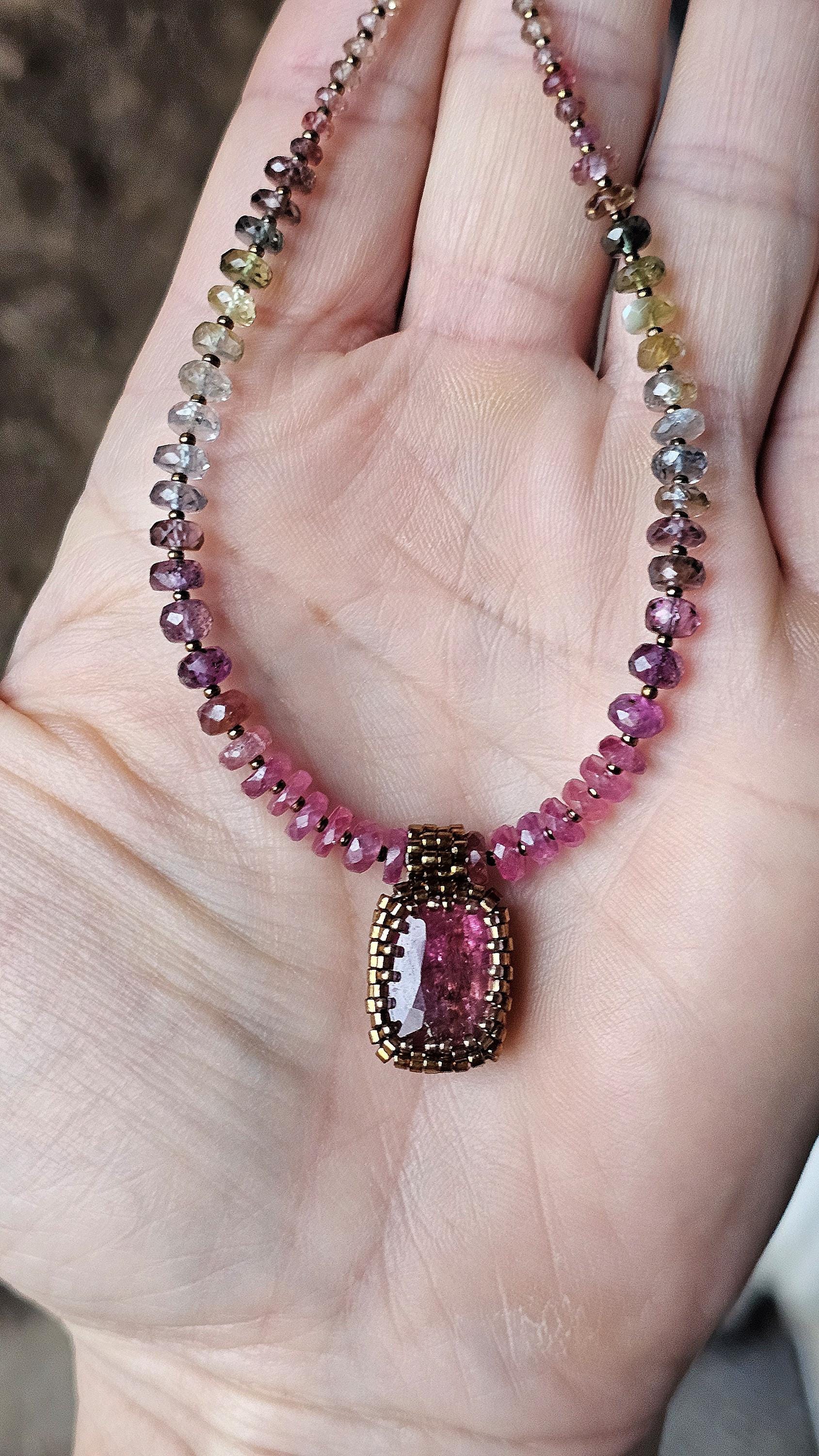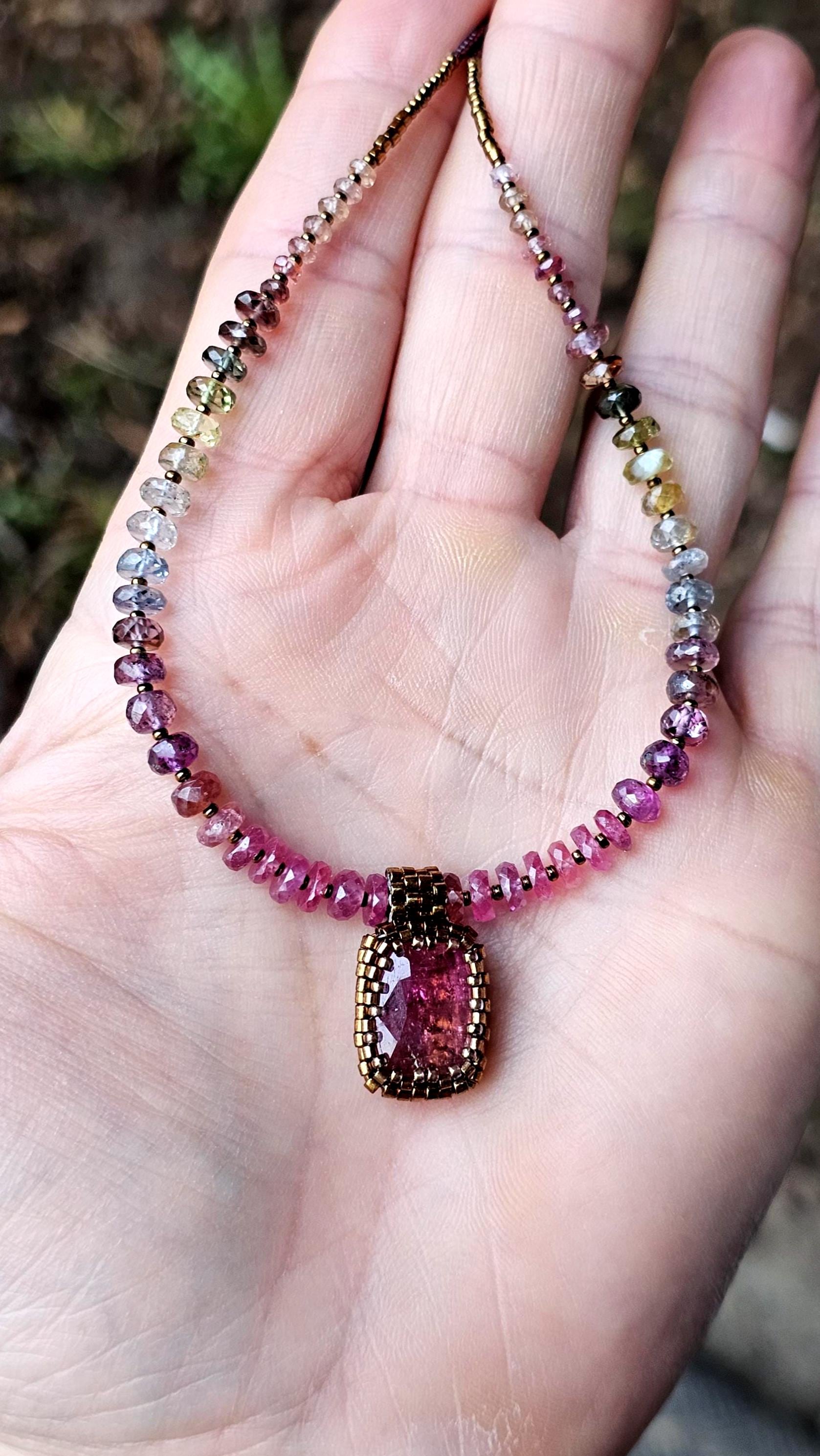 This is a large, faceted, really vibrant pink Rubellite pendant. It really catches the light, and displays many shades of pink as it moves. The beads are gorgeous, faceted, sparkly, high quality Sapphire beads shaded from reddish pink, to plum, berry, silver and greens. The smaller gem beads on either end are Spinel.