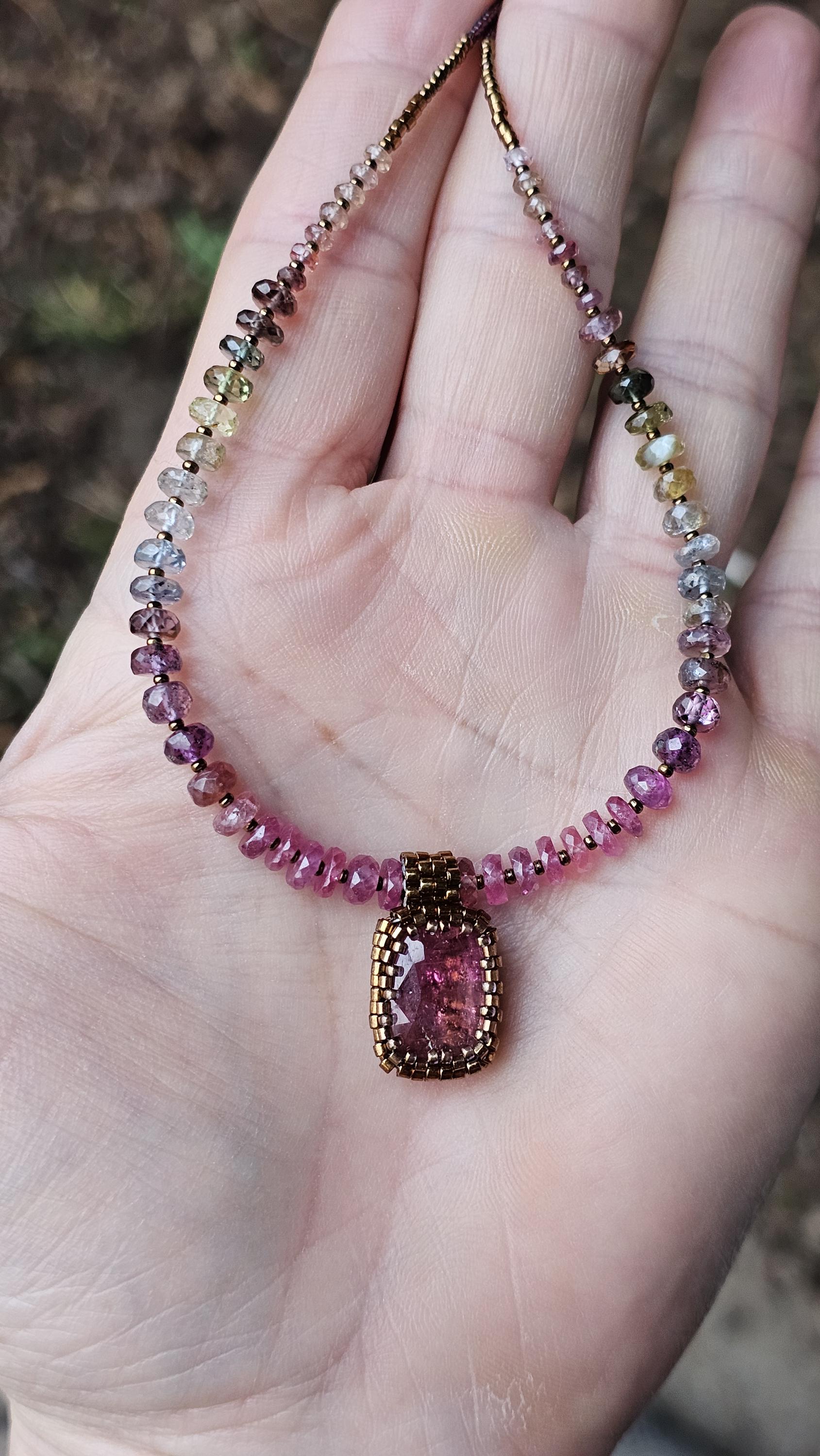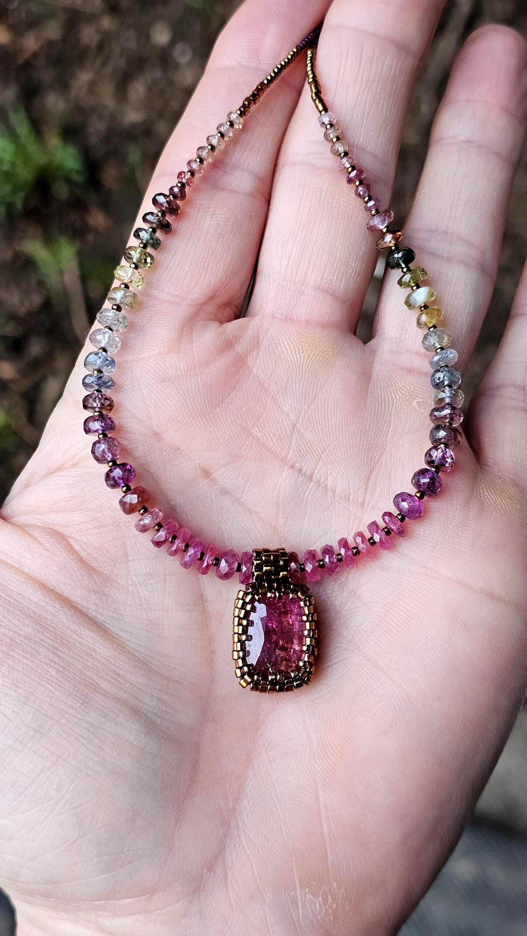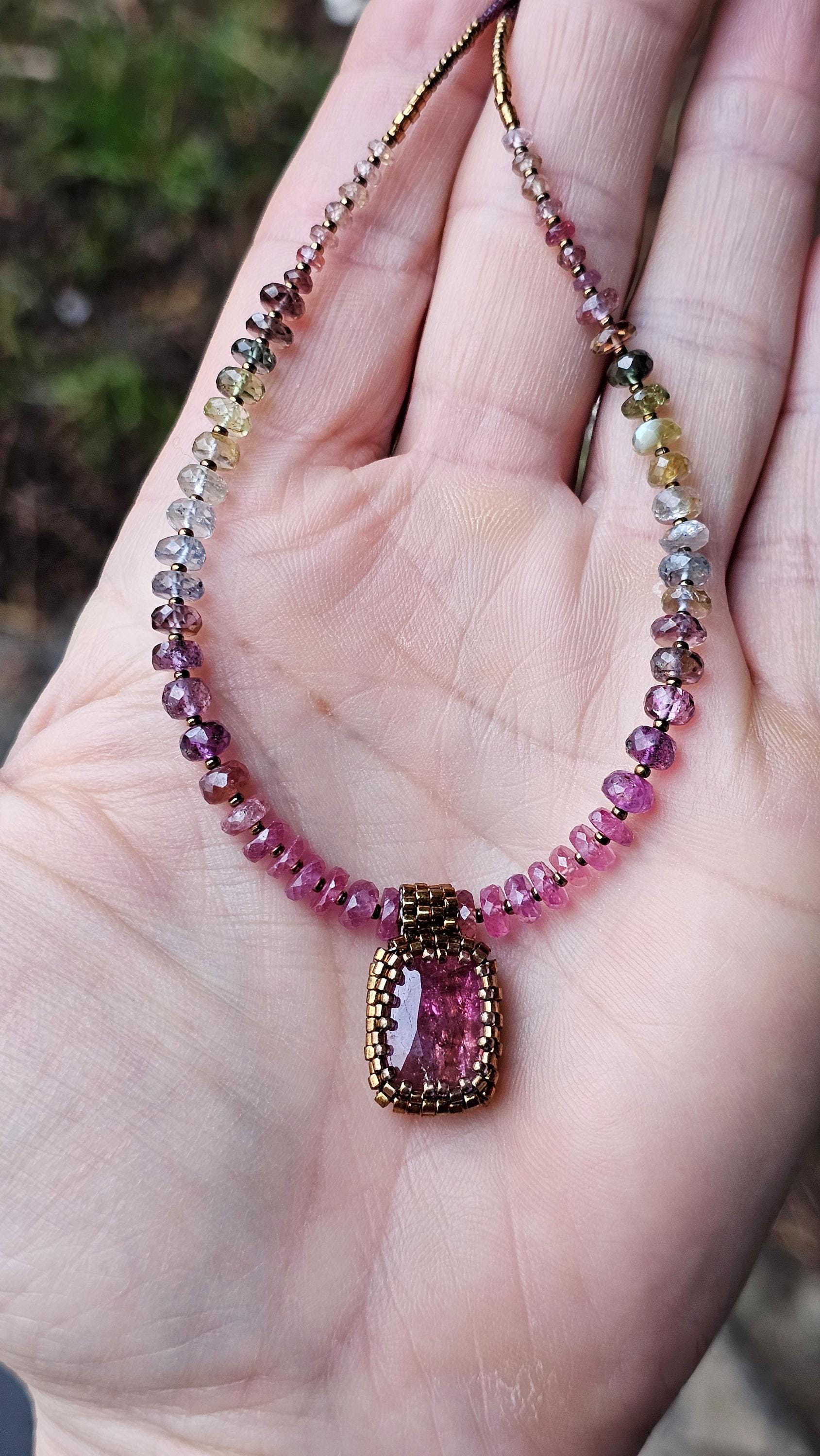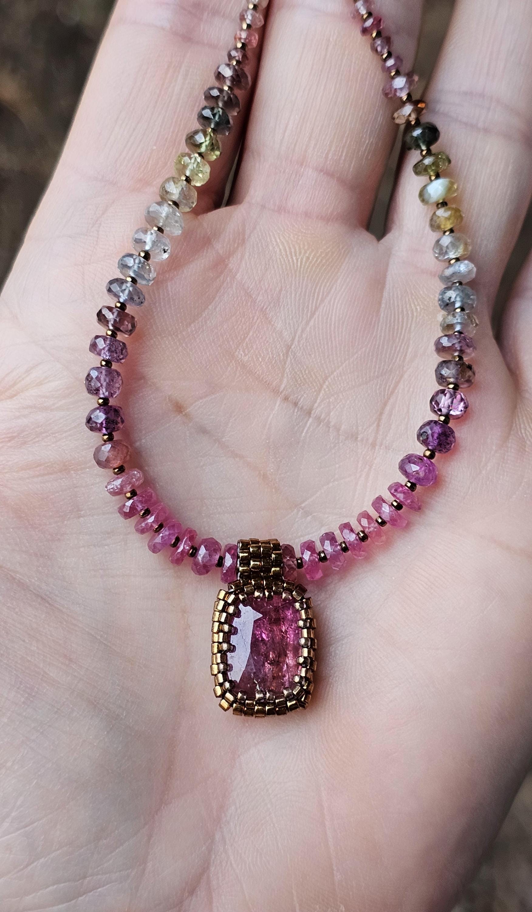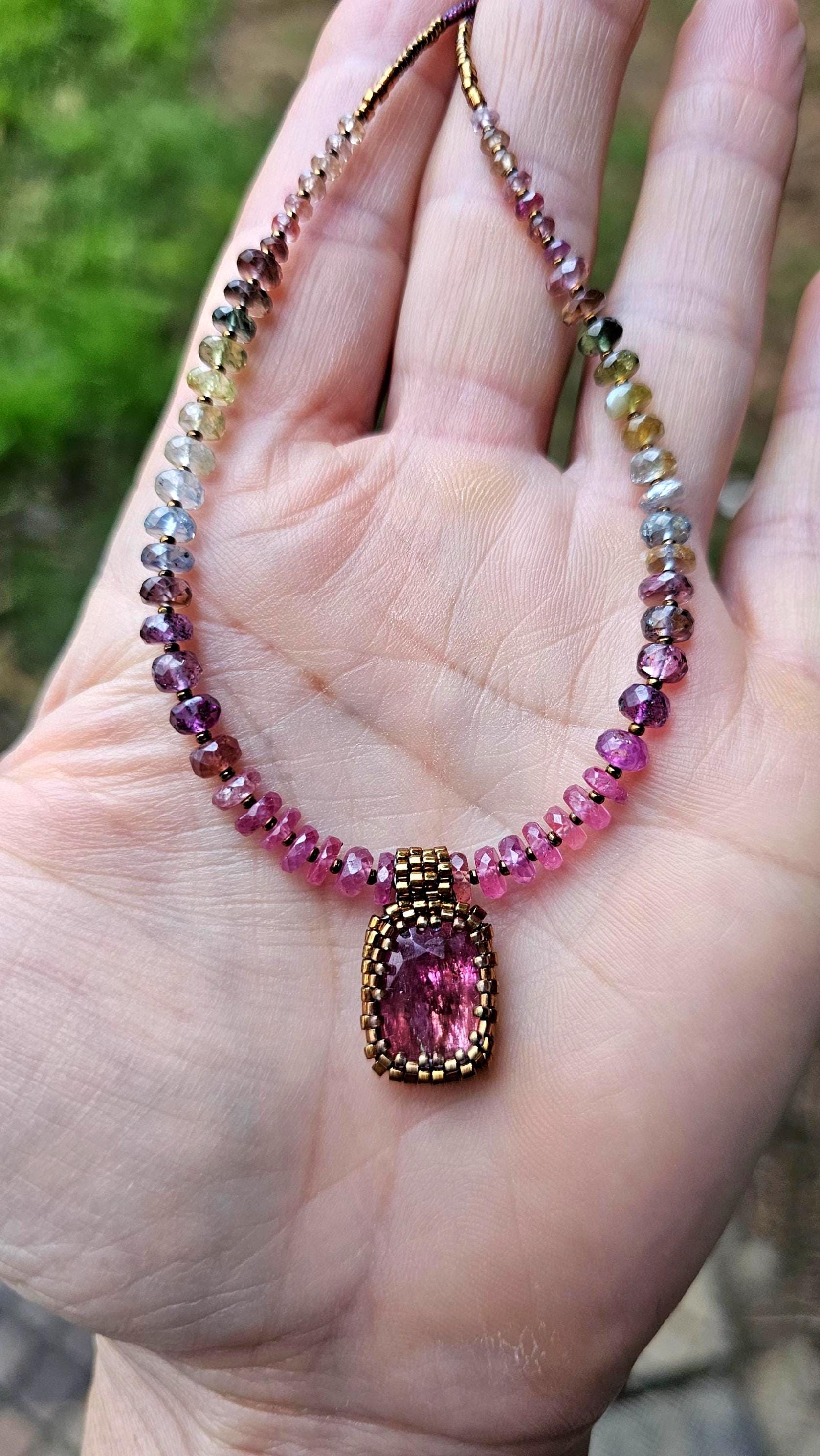 This is a large, faceted, really vibrant pink Rubellite pendant. It really catches the light, and displays many shades of pink as it moves. The beads are gorgeous, faceted, sparkly, high quality Sapphire beads shaded from reddish pink, to plum, berry, silver and greens. The smaller gem beads on either end are Spinel.