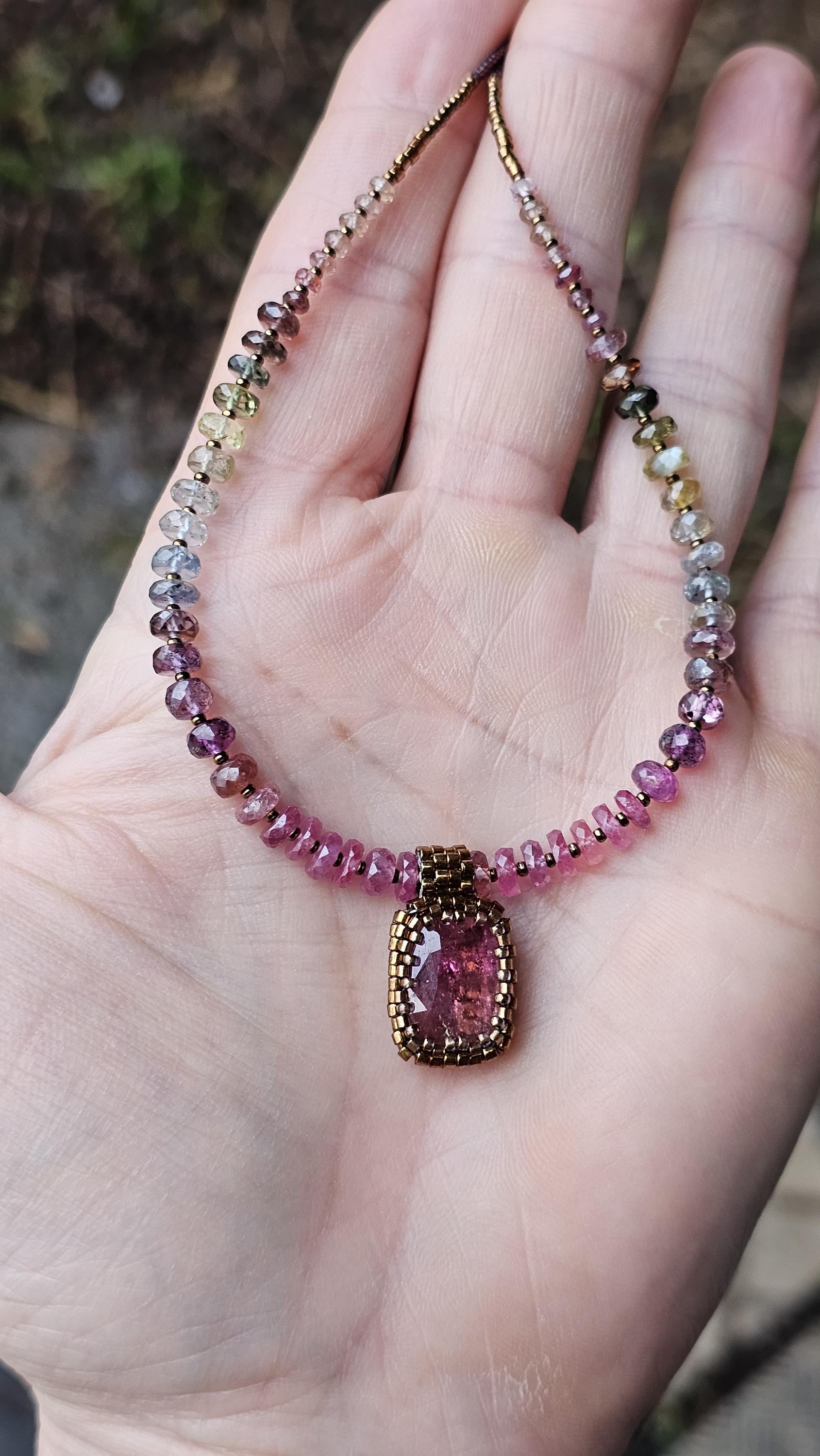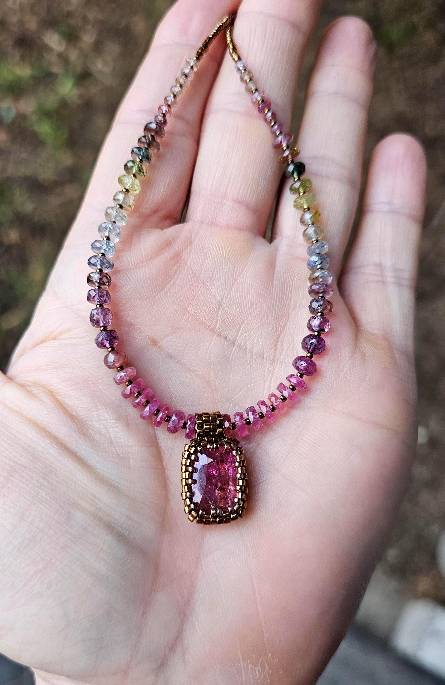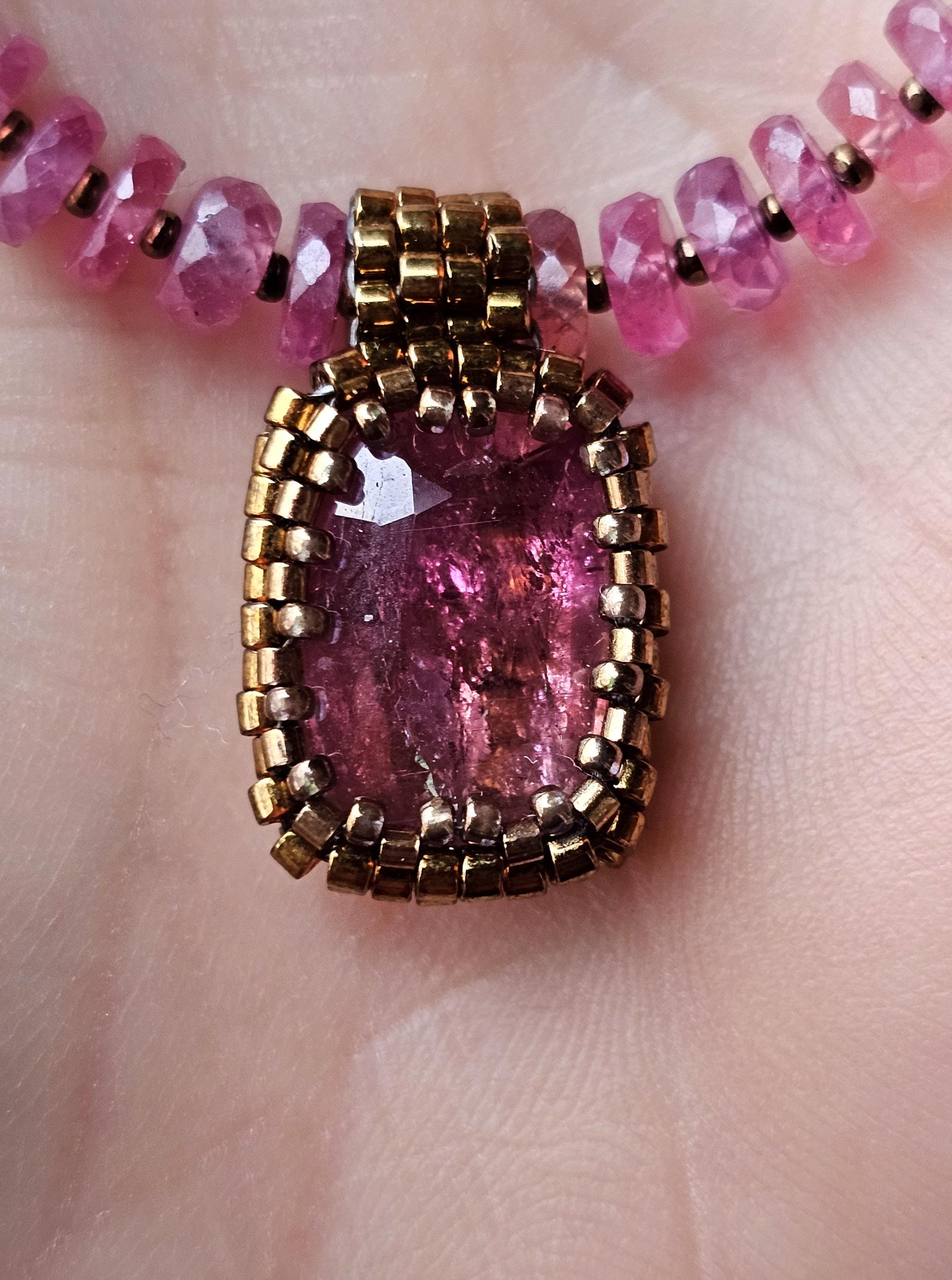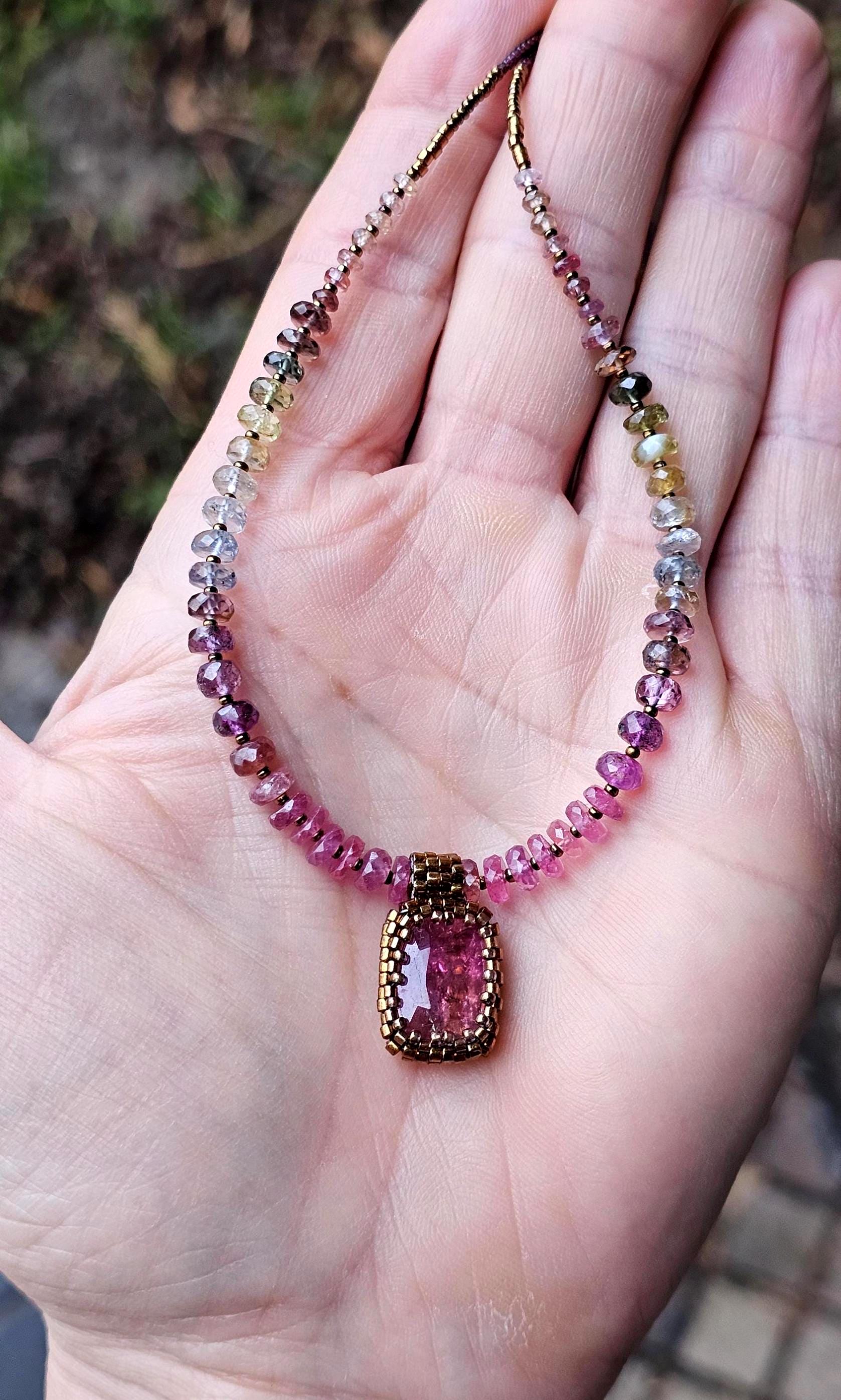 This is a large, faceted, really vibrant pink Rubellite pendant. It really catches the light, and displays many shades of pink as it moves. The beads are gorgeous, faceted, sparkly, high quality Sapphire beads shaded from reddish pink, to plum, berry, silver and greens. The smaller gem beads on either end are Spinel.