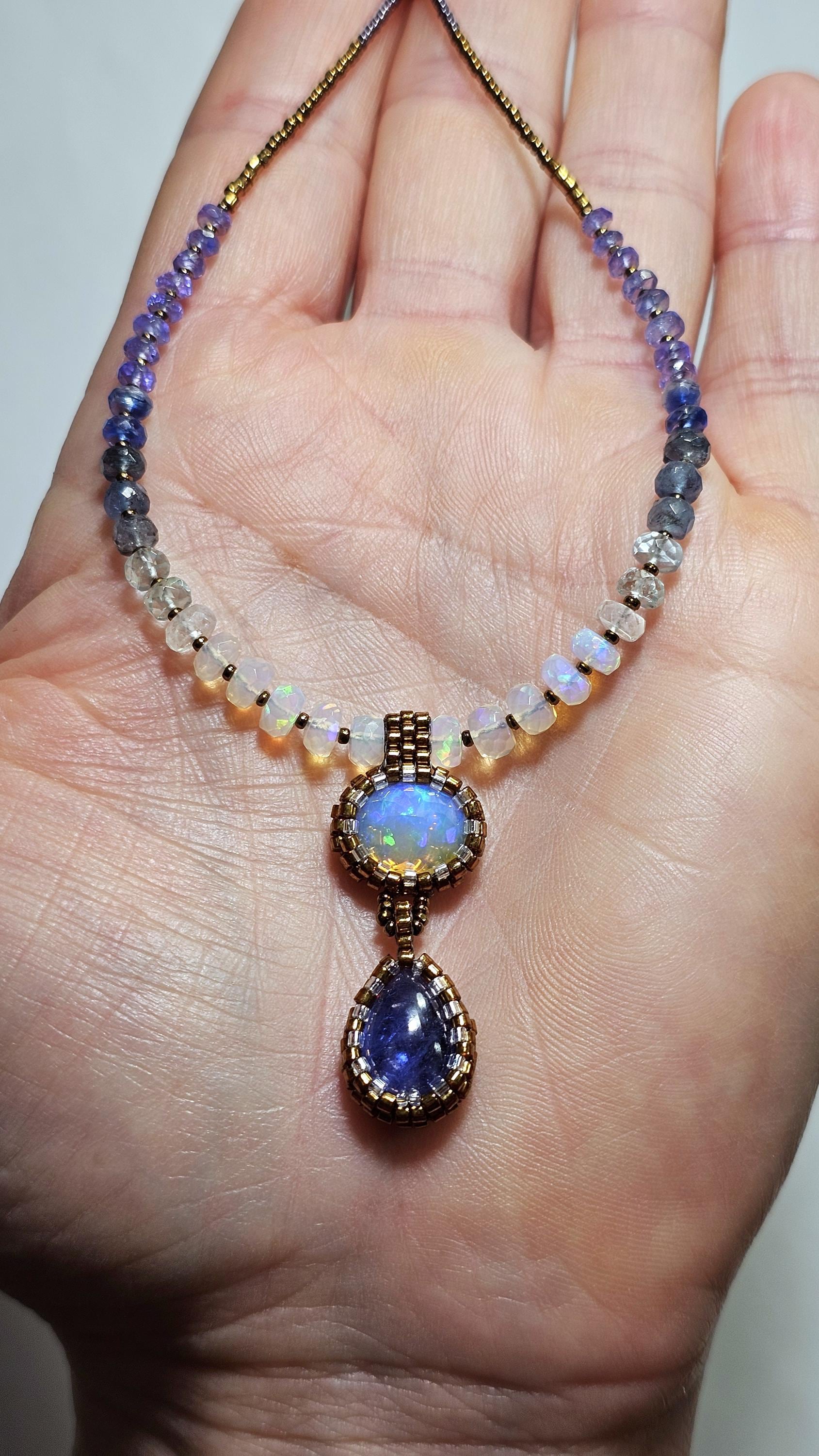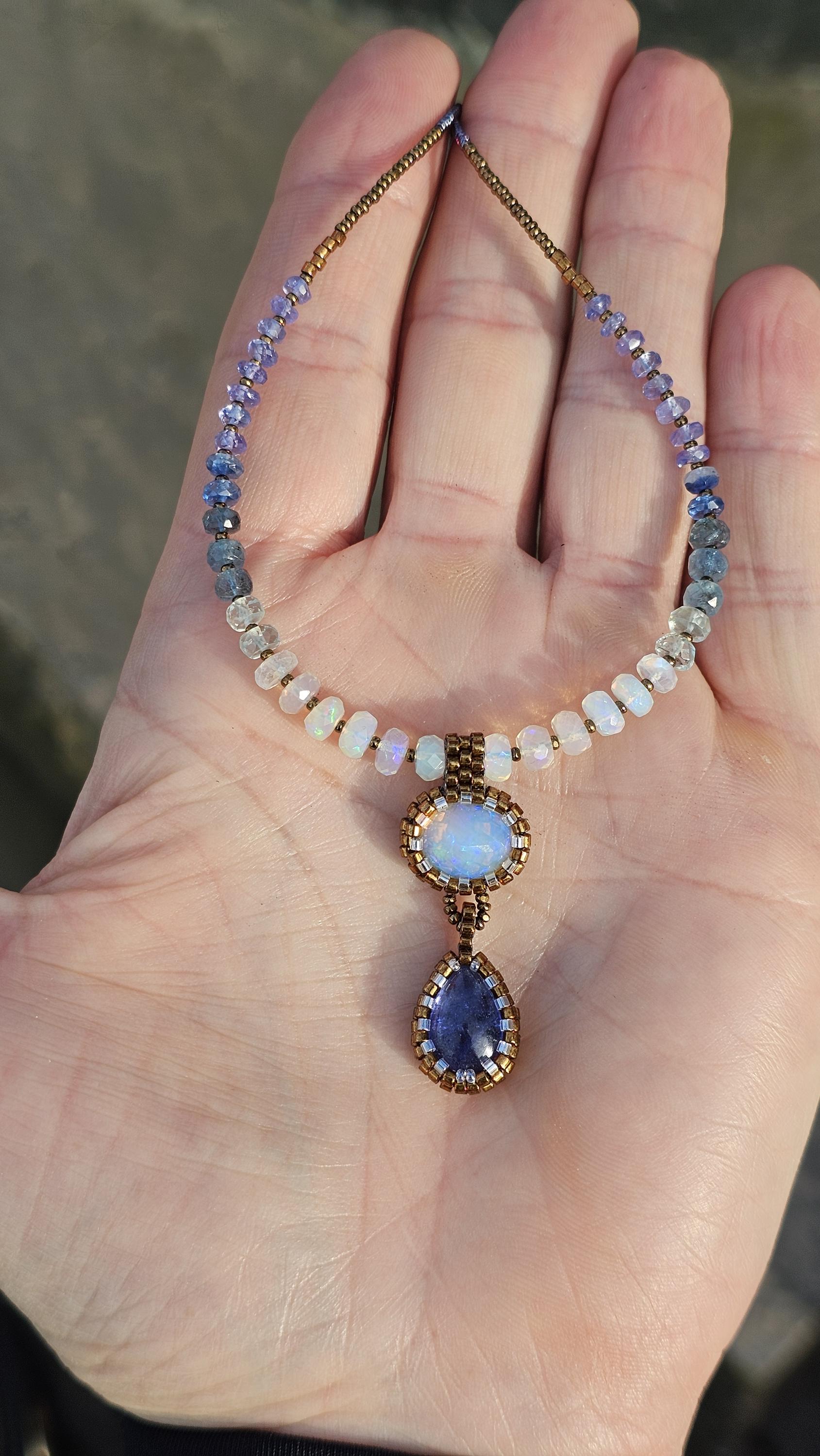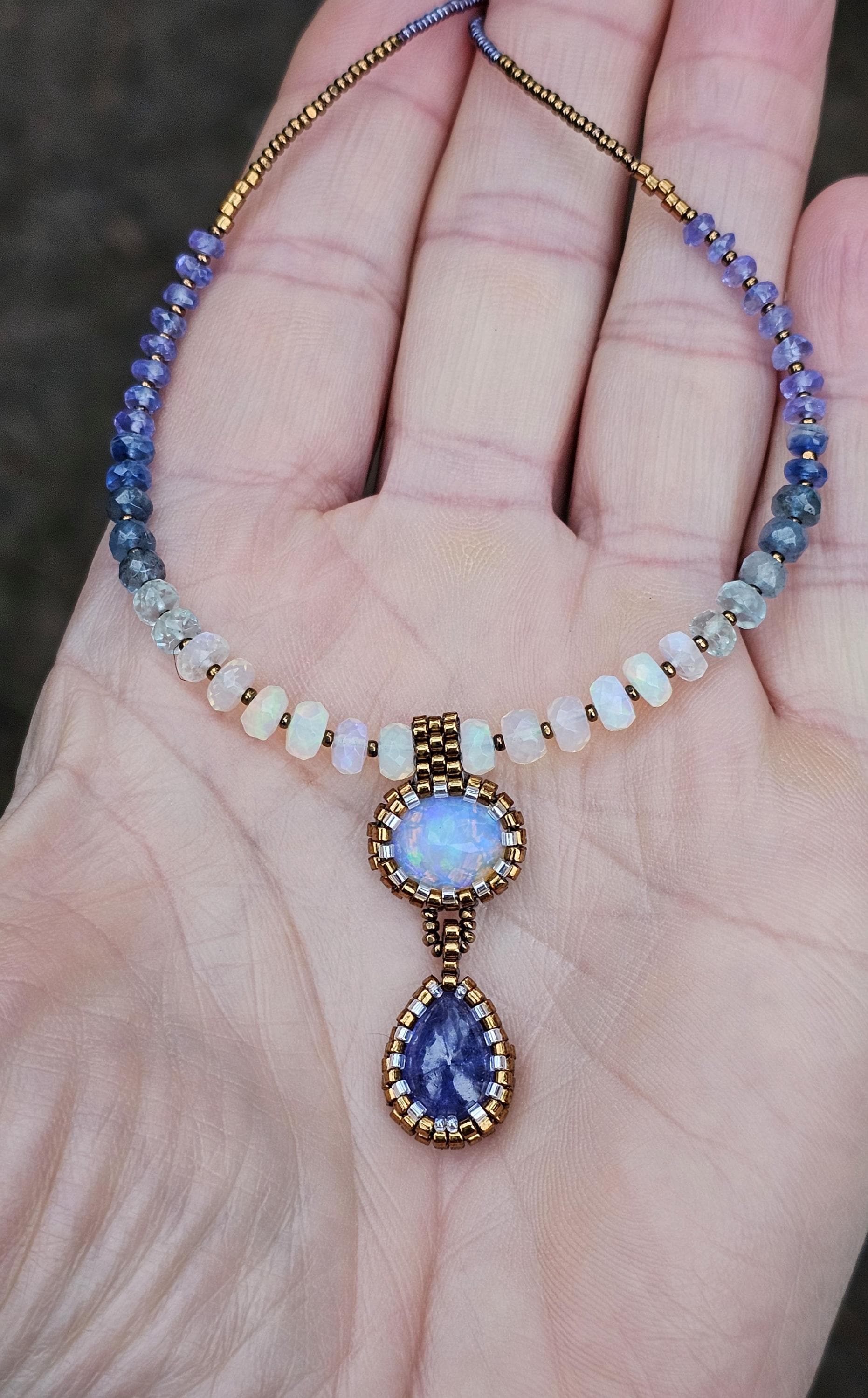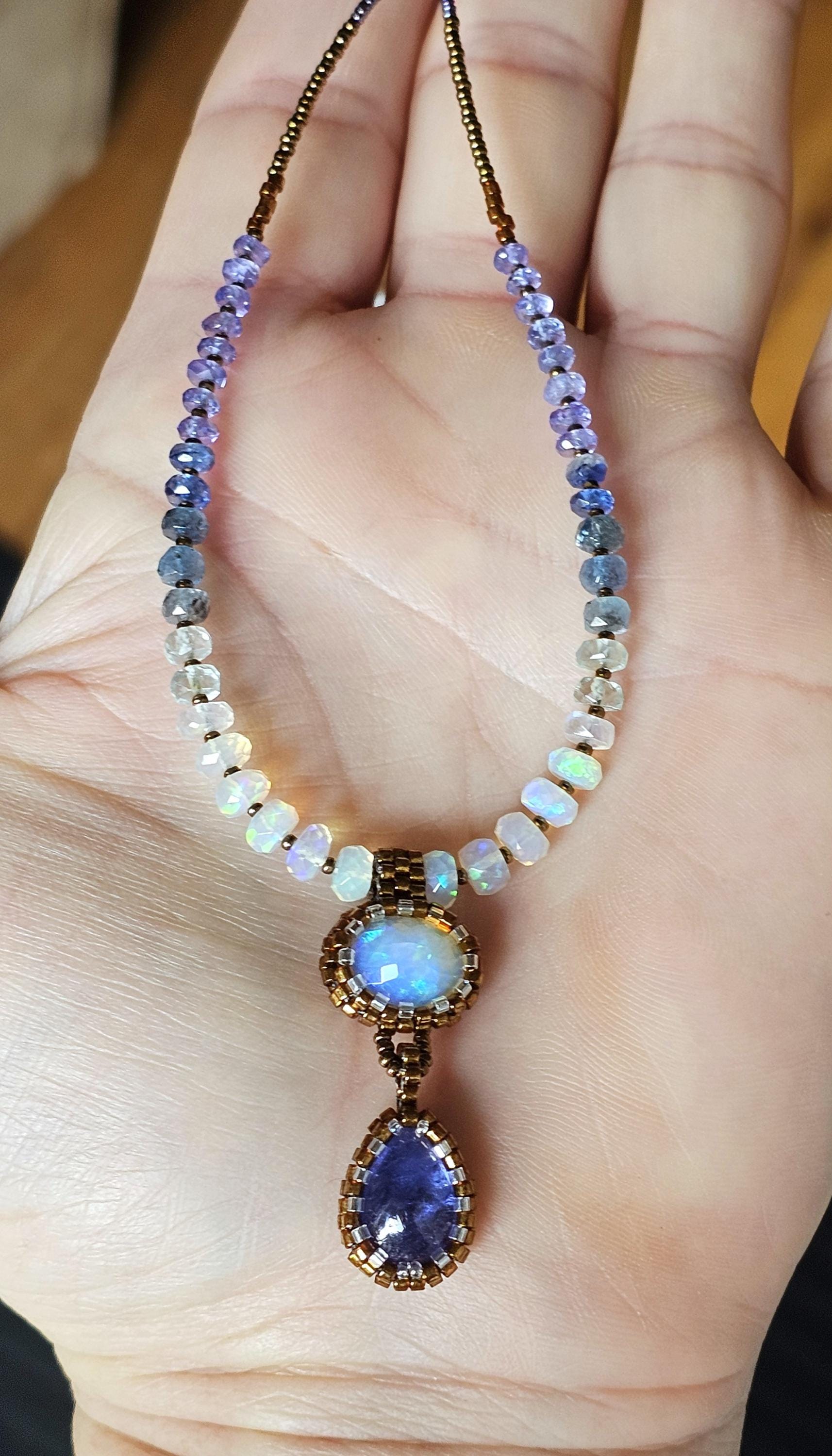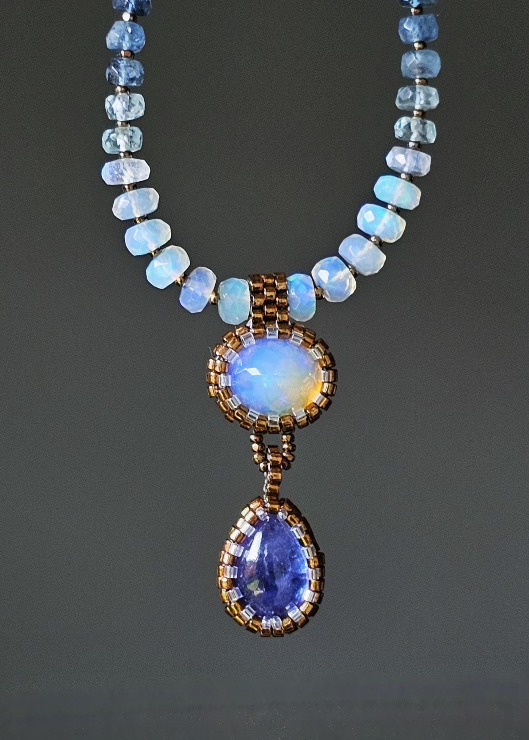 This is a solid, crystal, Ethiopian Opal with purple/blue/green play-of-color, with a gorgeous, gemmy Tanzanite pear. The beads are Ethiopian Opal, Aquamarine from light to dark, Kyanite, and Tanzanite