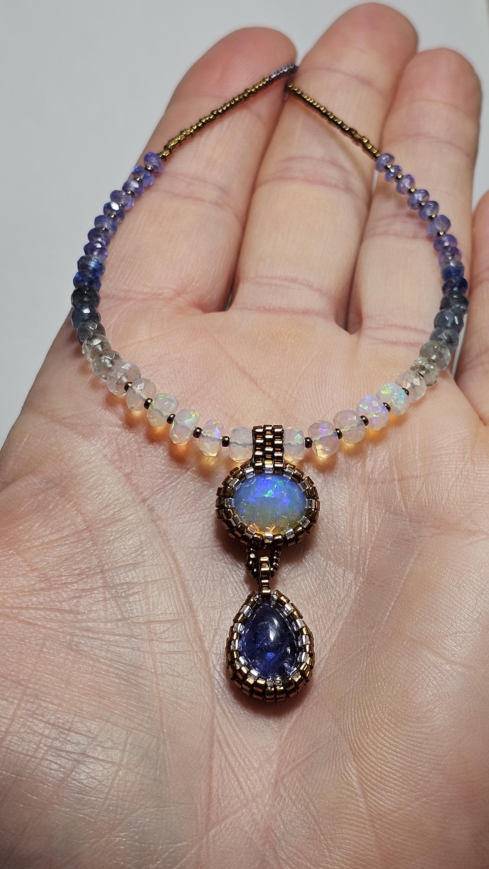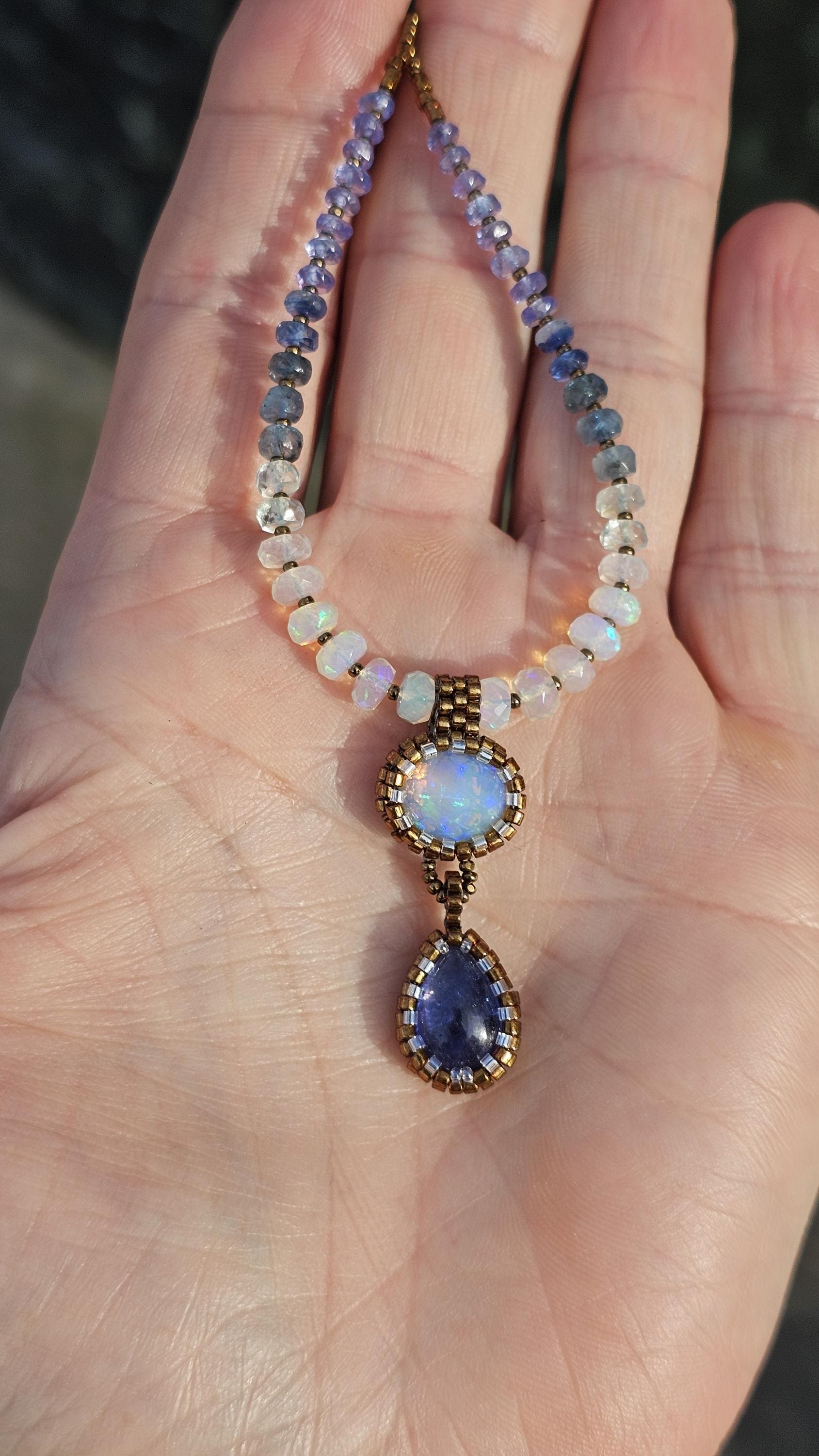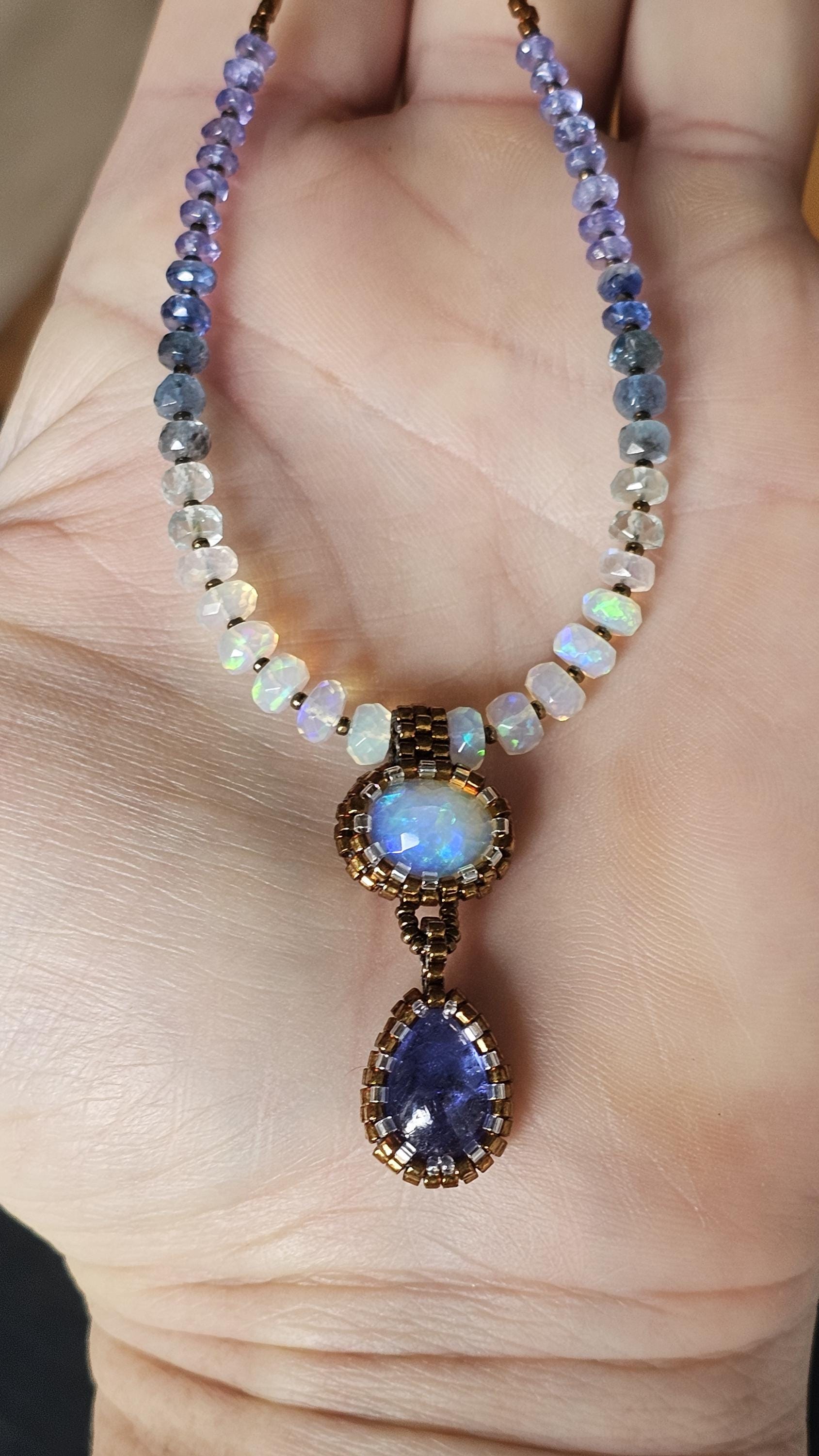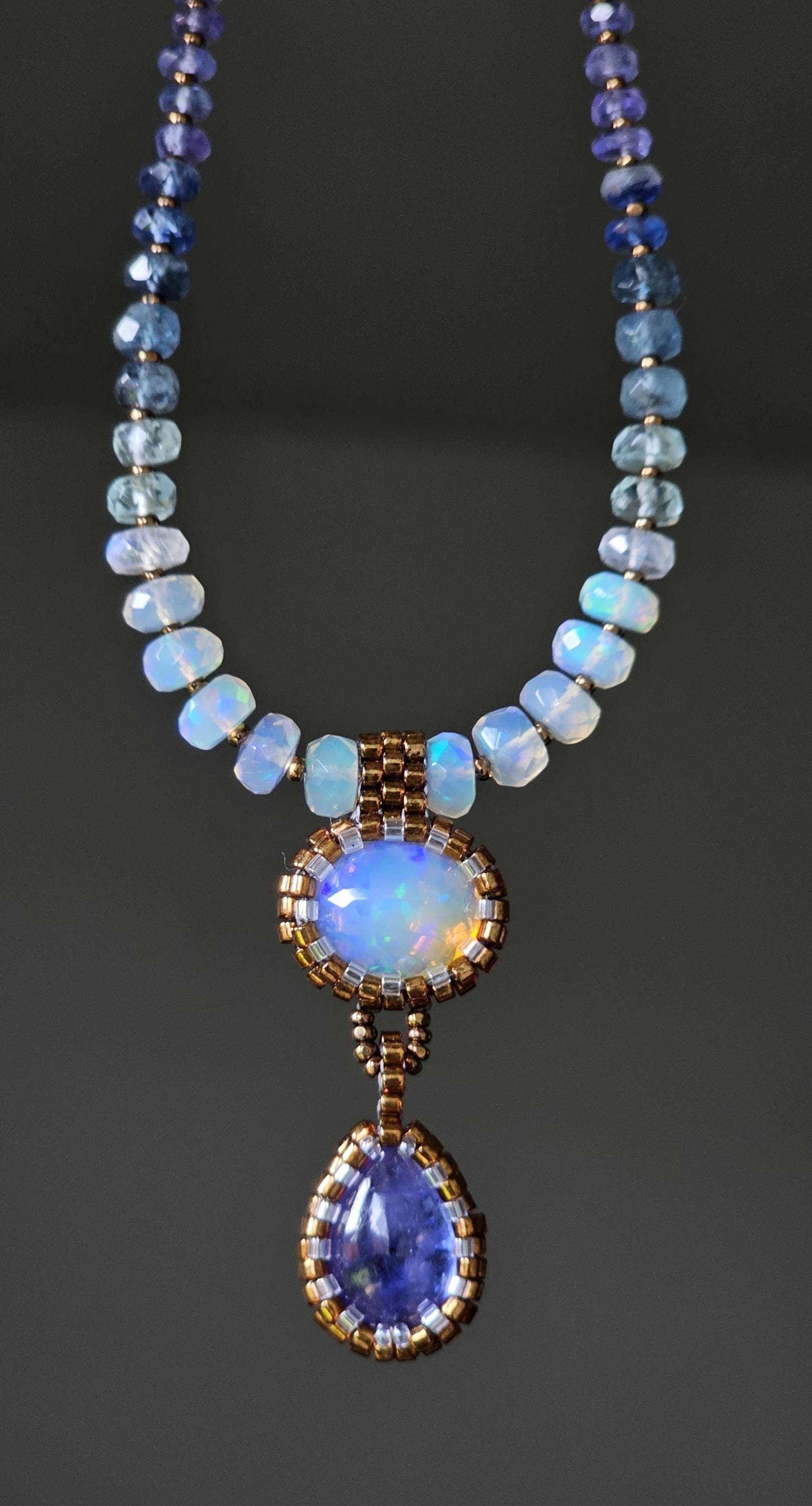This is a solid, crystal, Ethiopian Opal with purple/blue/green play-of-color, with a gorgeous, gemmy Tanzanite pear. The beads are Ethiopian Opal, Aquamarine from light to dark, Kyanite, and Tanzanite