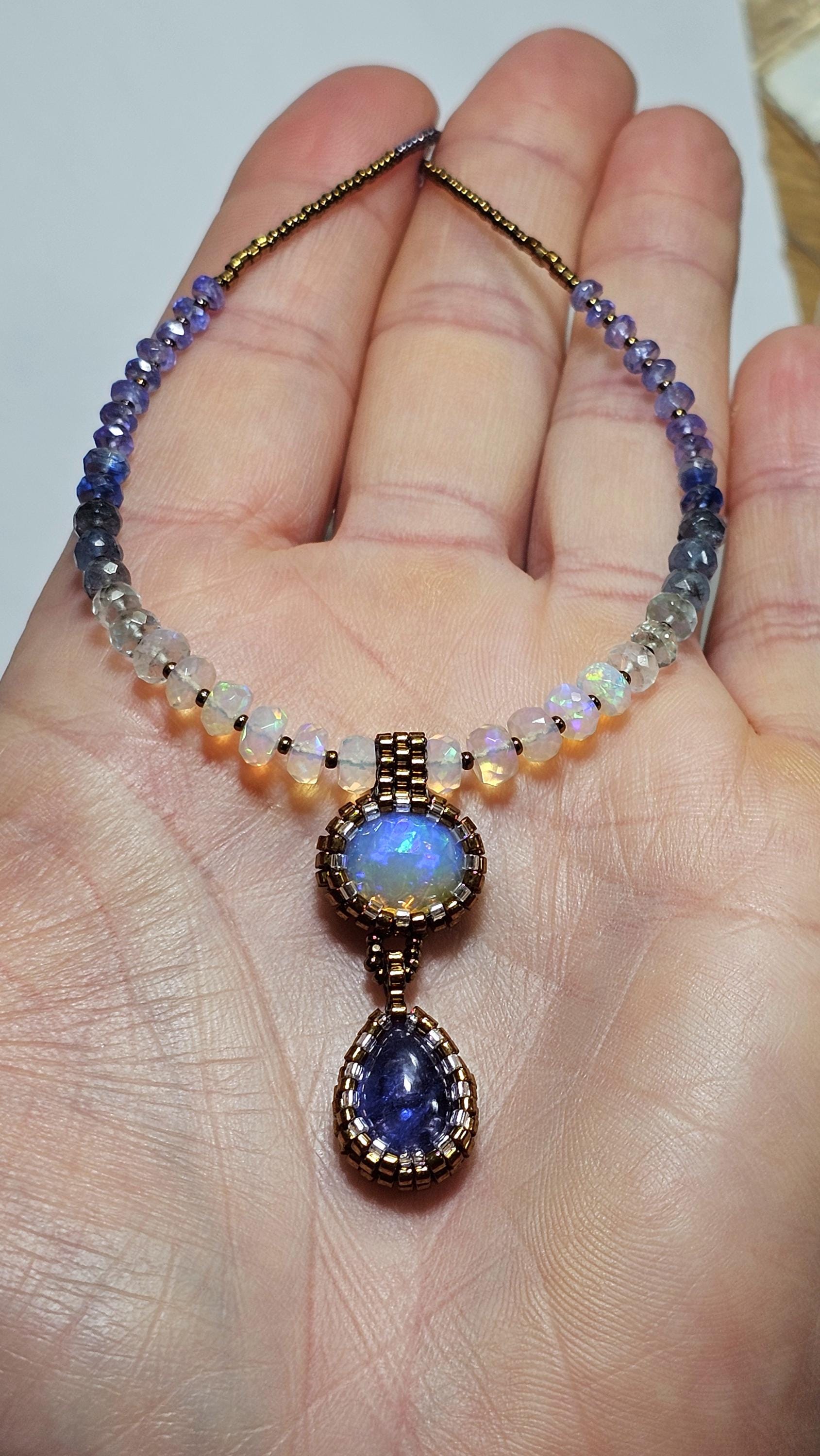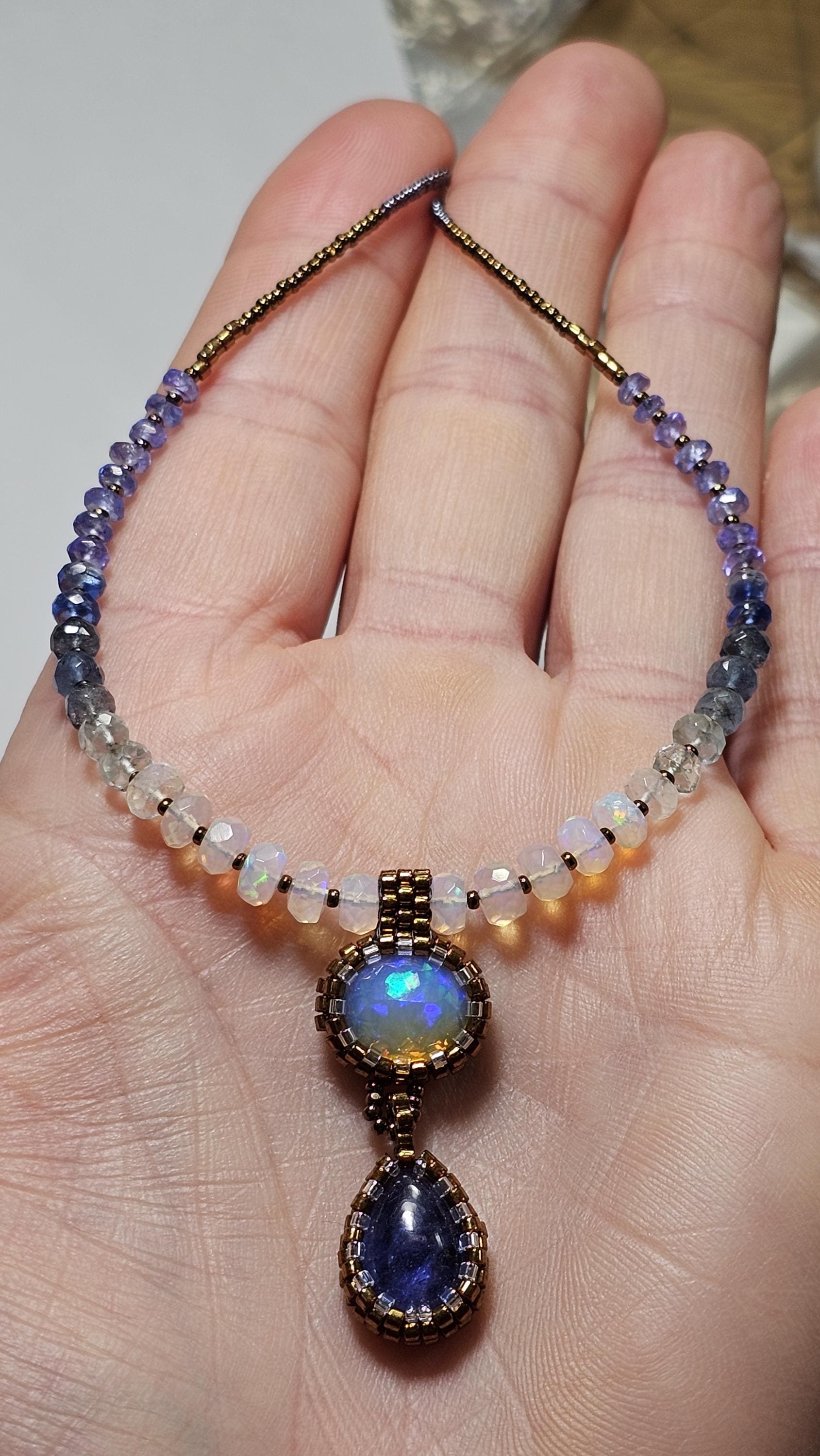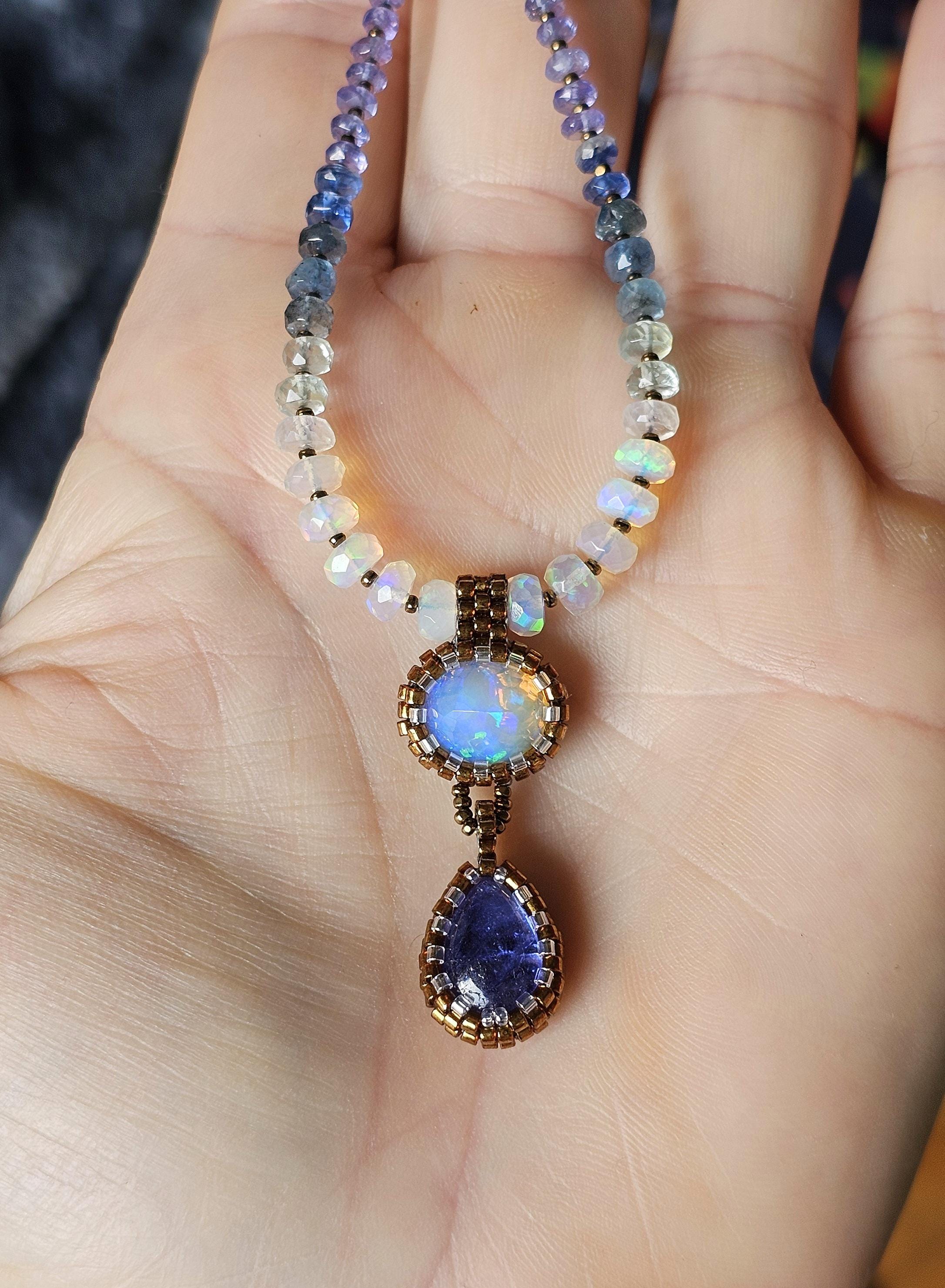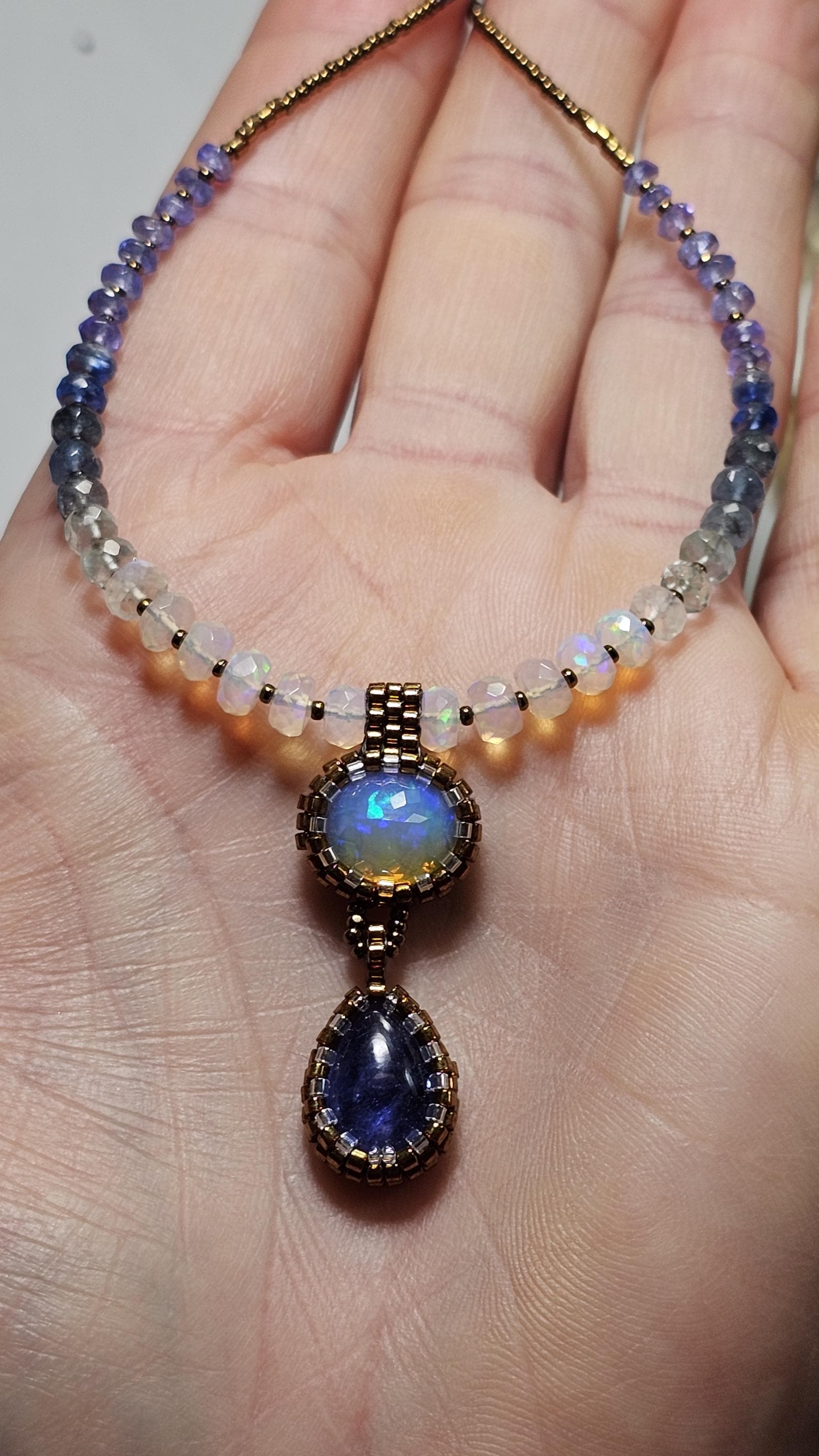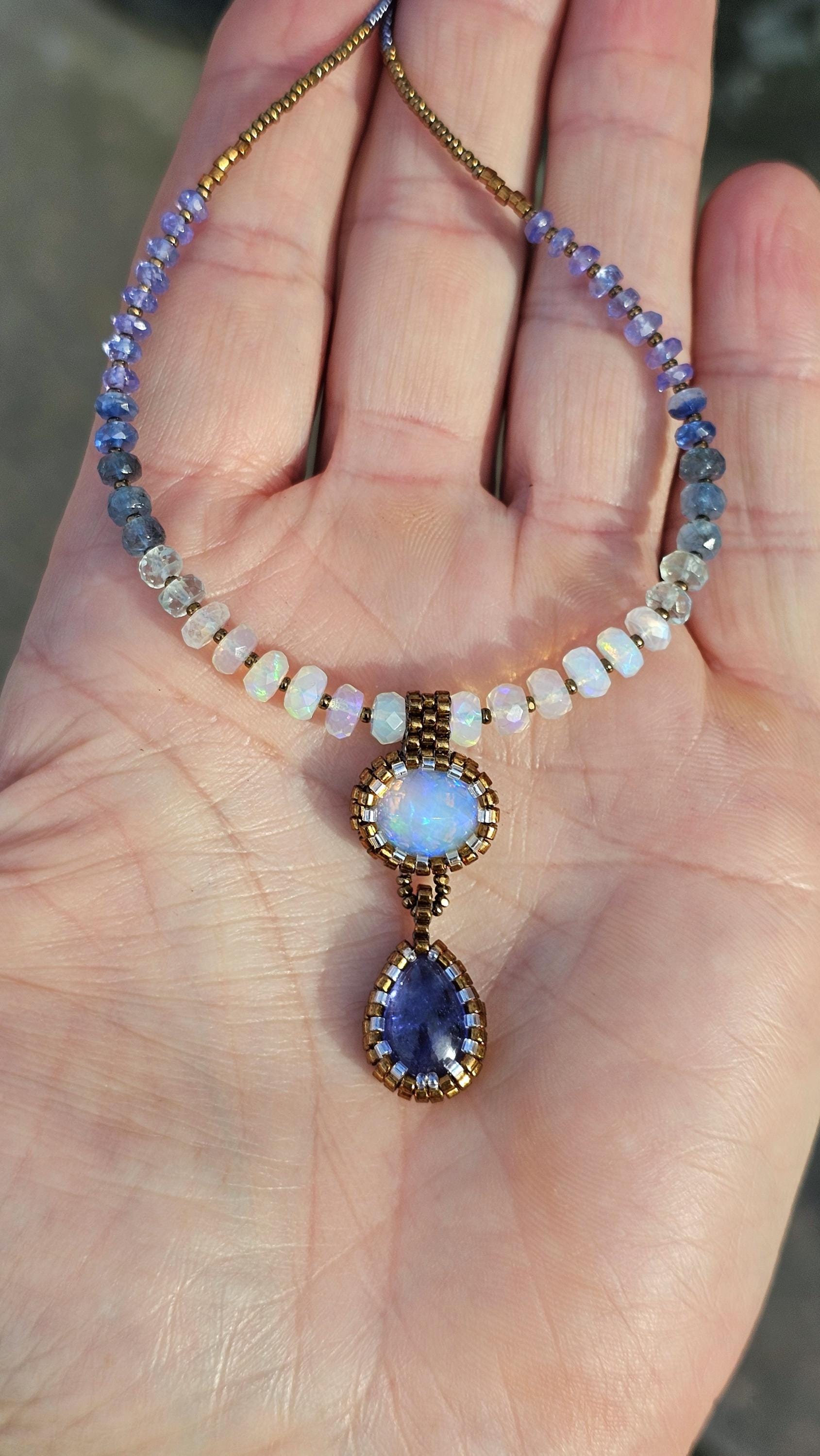 This is a solid, crystal, Ethiopian Opal with purple/blue/green play-of-color, with a gorgeous, gemmy Tanzanite pear. The beads are Ethiopian Opal, Aquamarine from light to dark, Kyanite, and Tanzanite