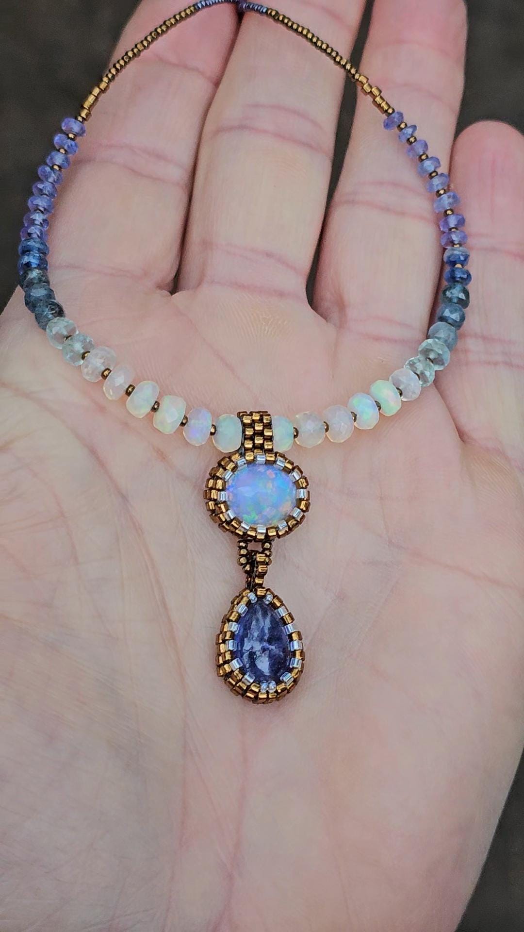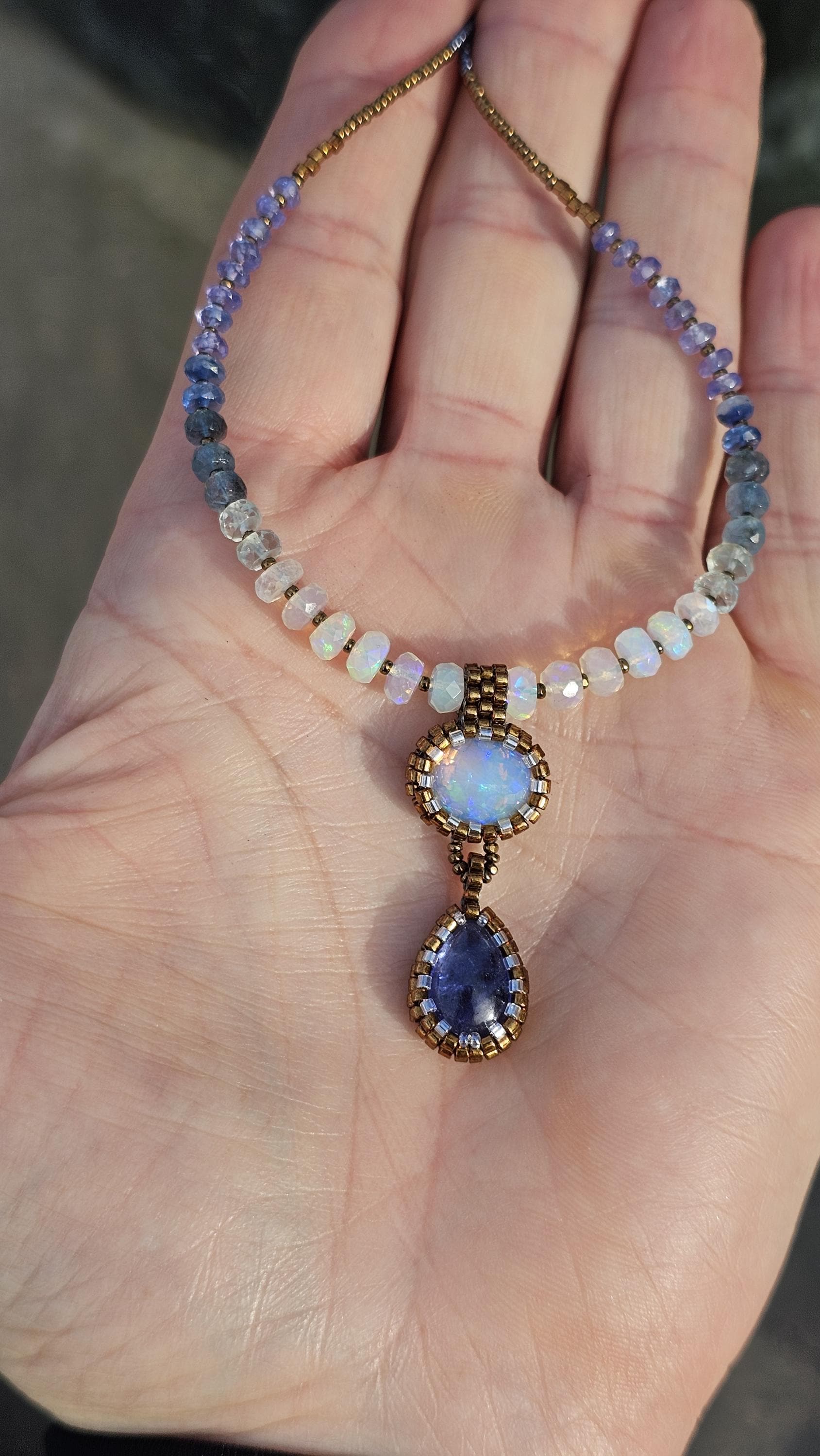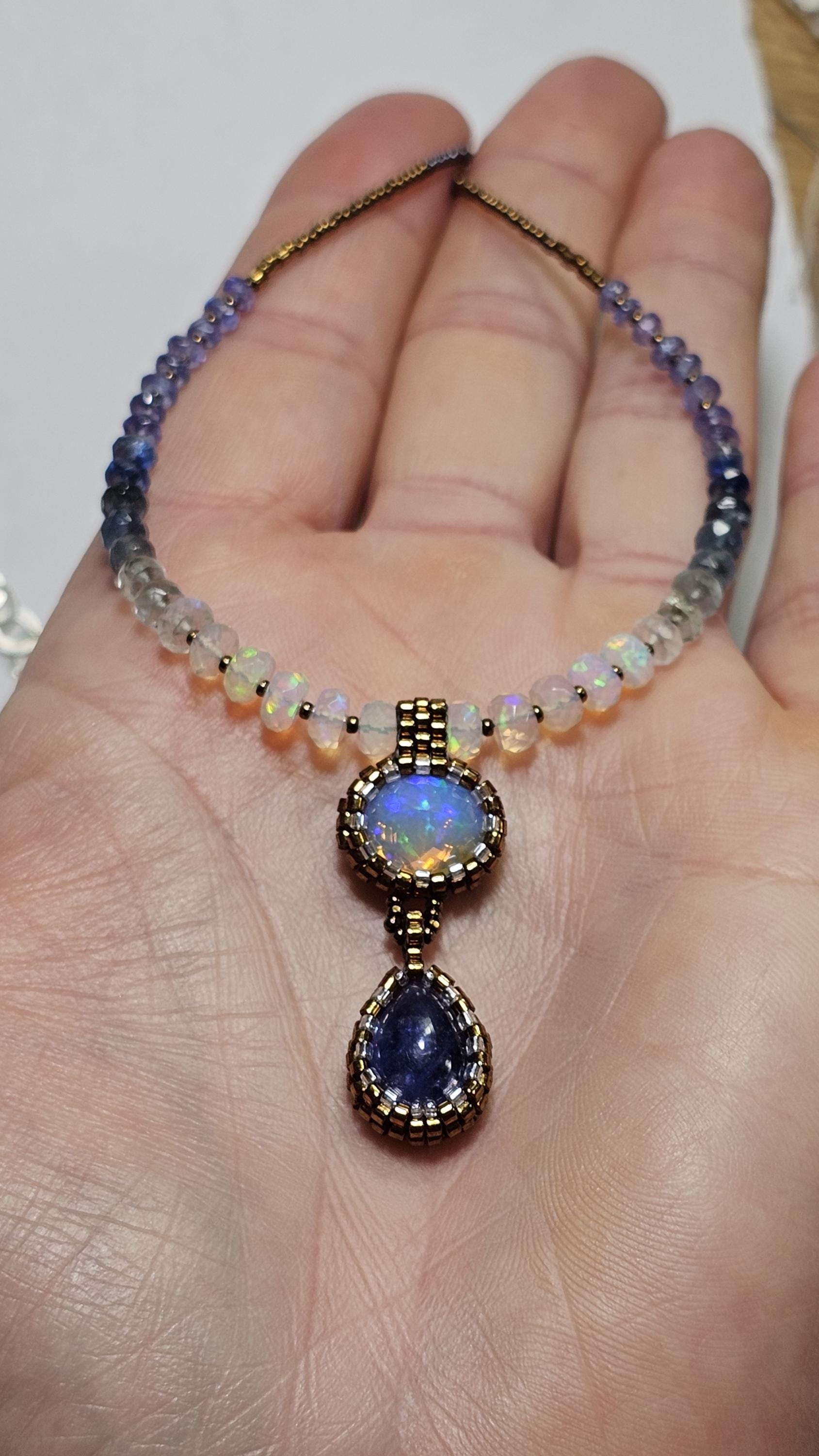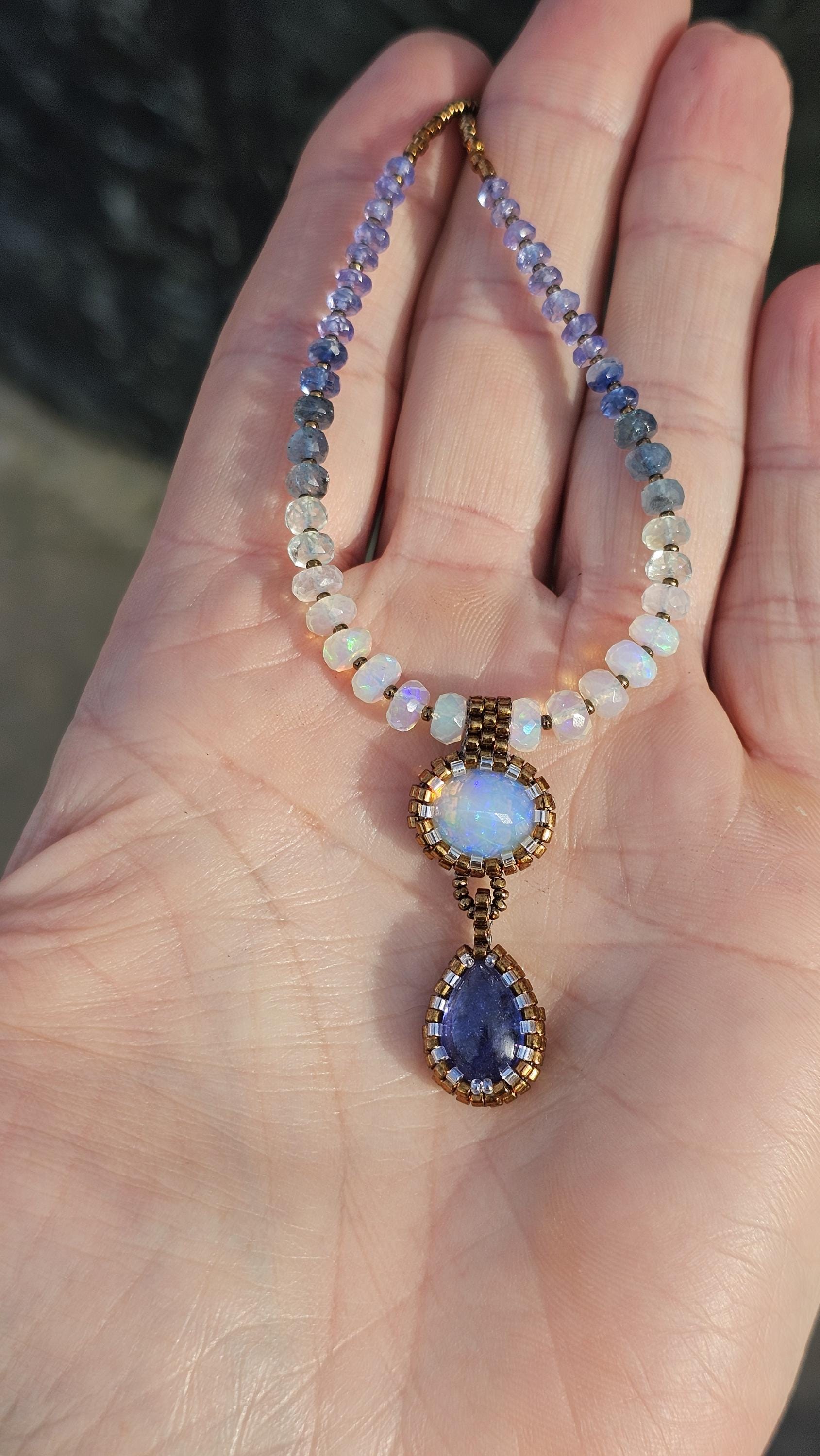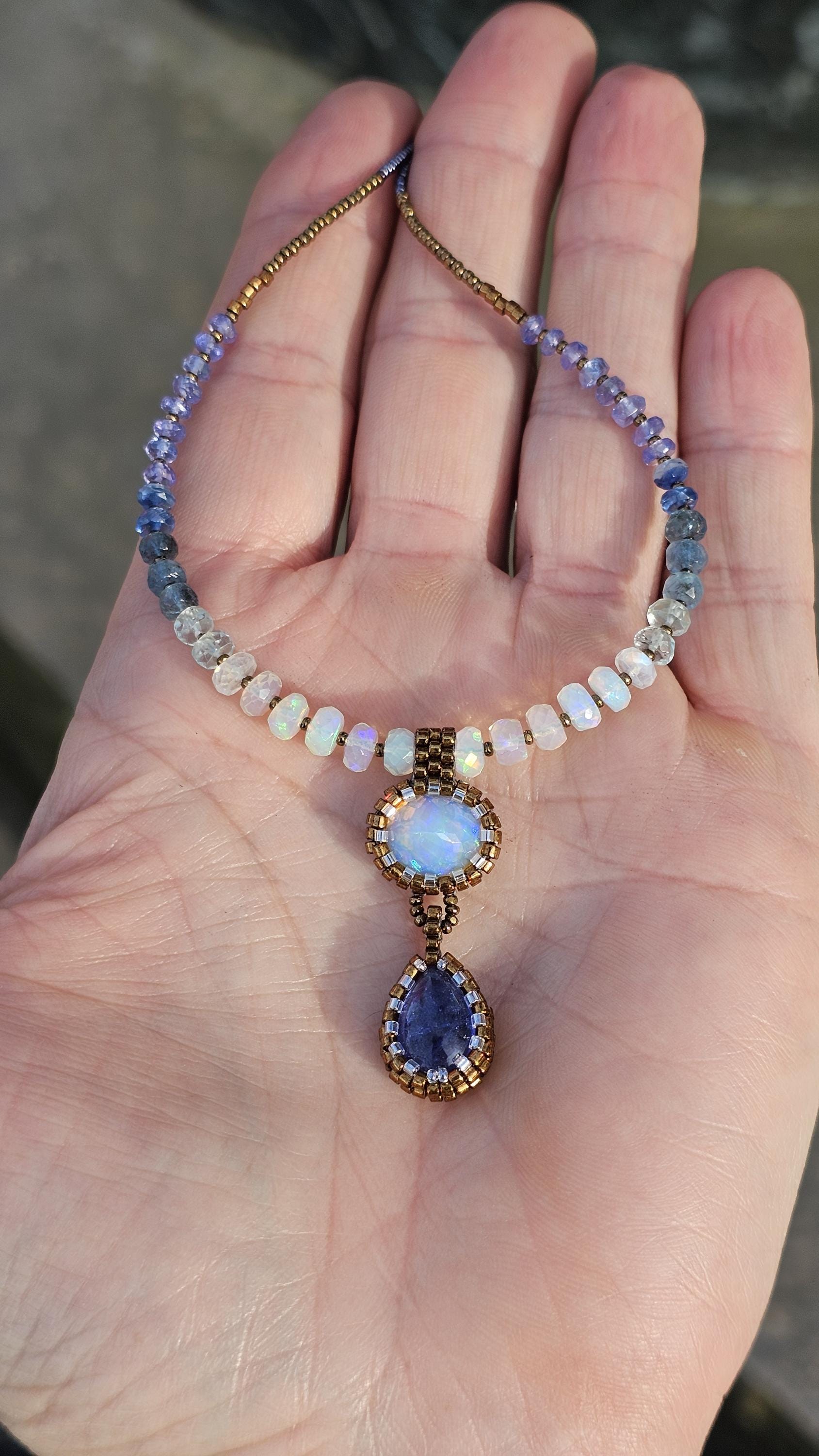 This is a solid, crystal, Ethiopian Opal with purple/blue/green play-of-color, with a gorgeous, gemmy Tanzanite pear. The beads are Ethiopian Opal, Aquamarine from light to dark, Kyanite, and Tanzanite