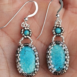 The setting is made of tiny glass seed beads, which are hand stitched, one bead to the next, with a fine beading needle, using a heavy duty 6 lb test-strength, spun, braided, nylon beading thread. There are multiple plies of this thread in every bead! I start making a netting to form the back side of the bezel, and then, while holding the stone in place, I stitch one bead at a time around the perimeter of the cabochon, slowly building the beaded bezel, tailor fitted to each unique gemstone, until it is encased. My beadwork is NOT attached to the stone, just well fitted to it.